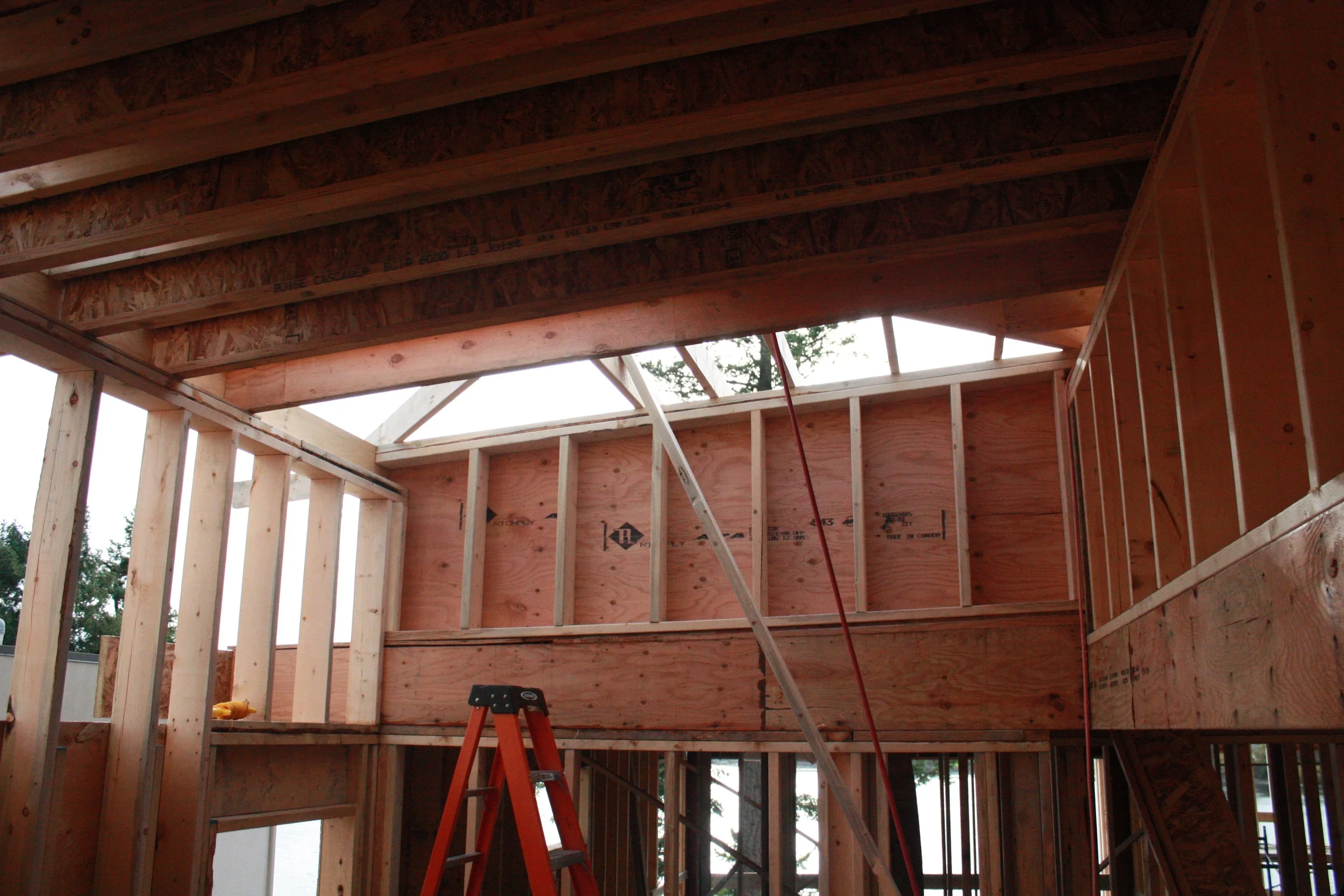 Oct. 31: The sun has just peaked out and the rain has stopped in time for ghosts and goblins to trek about the neighbourhoods. Hopefully this means the house will have a chance to dry out a bit... still have small lakes in the framed rooms upstairs and down. There is now temporary stairs to to the rooms above the garage... put in only after I mastered the 2 X 12 lumber walk... ( not as bad as the 11 foot ladder climb). This allows me safe access throughout the build. The concentration this week has been on setting the roof joists, and putting sheets of wood up in preparation for the "roofing" next week. It is cool to see (and understand) how the slanted and flat roofs interface "up top". Inside, the covered roof gives more definition to the spaces. I can now imagine what the completed rooms will be...