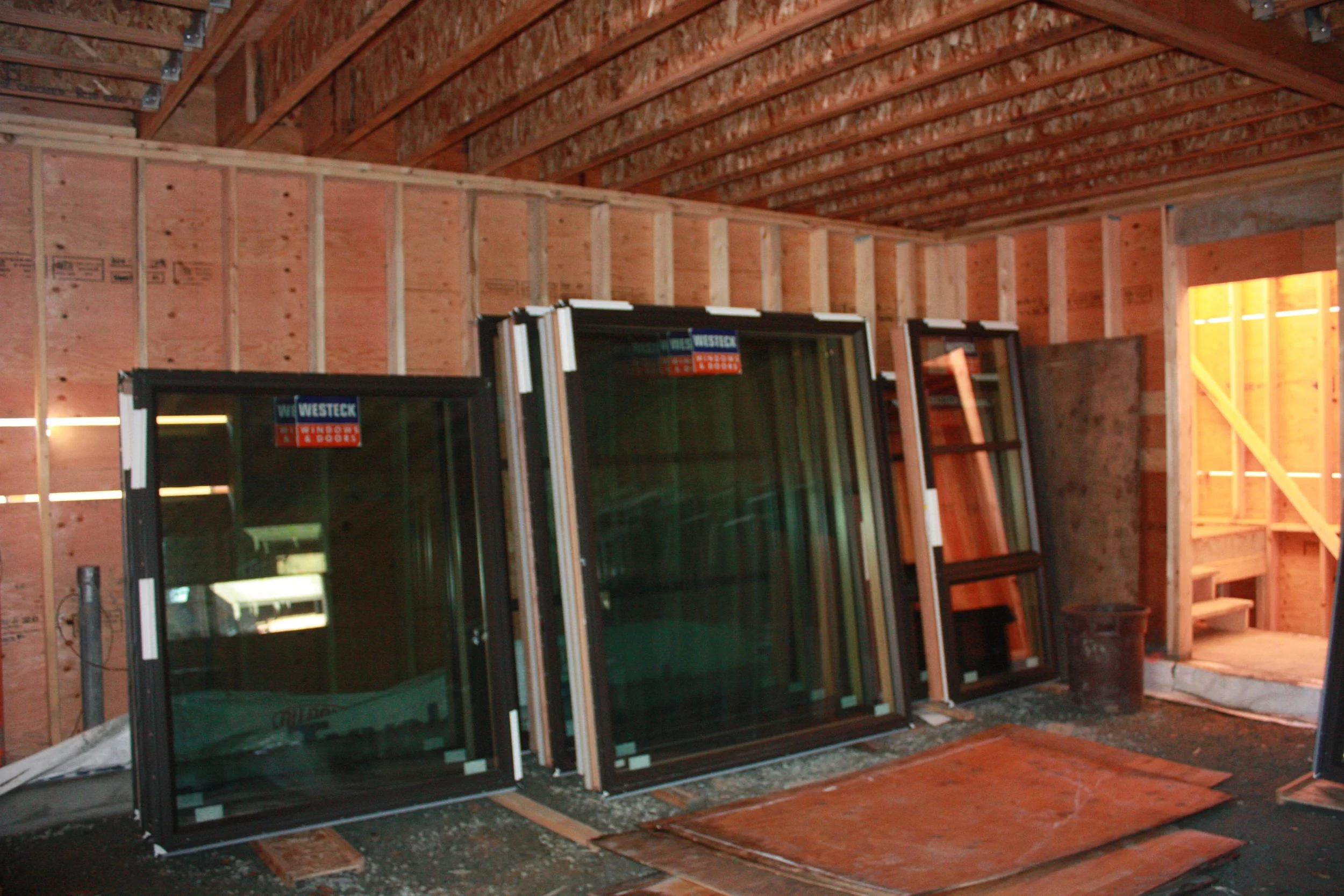 Nov. 19: The weather has broke - it was a beautiful day here to day; cool but very sunny. The roofing crew took advantage and completed the slanted roof, finishing the roofing job. Cool weather definitely is an advantage for this job. After drying the wood with a torch, the roof is covered with a white paper-like material, insulated and sealed with a peel-n-stick rubber type sheeting. Finally, the asphalt sheeting is placed on the layers, and sealed again with a torch. There are drains in strategic places, and from what I saw the earlier this week, they are working fine. Also yesterday, most of the windows have arrived, for installation next week (I am told). We may be weather tight soon!