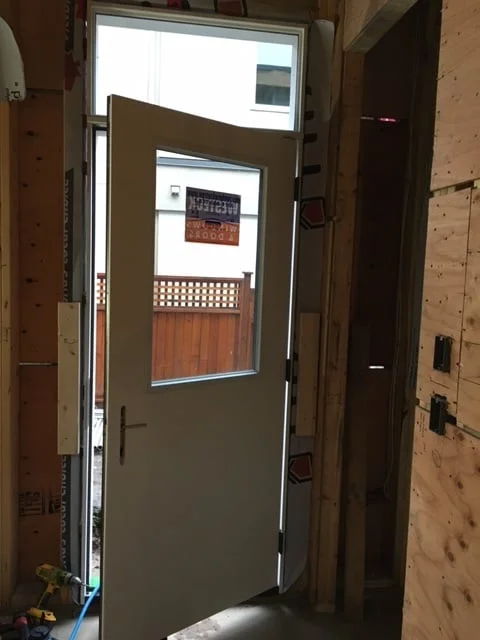 Jan. 11: Several of the exterior doors are installed today by our expert carpenters - these doors open into the mudroom on the main floor, the mechanical room below the dining room, and onto the deck from the sitting room above the garage. Exterior face of all the doors is coloured the same as the window trim - a dark bronze. The front door will come later.......
