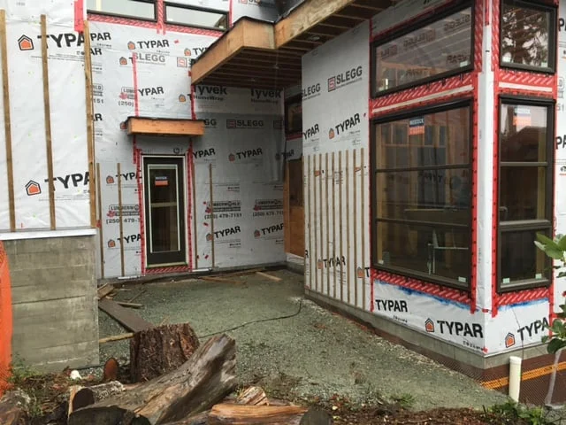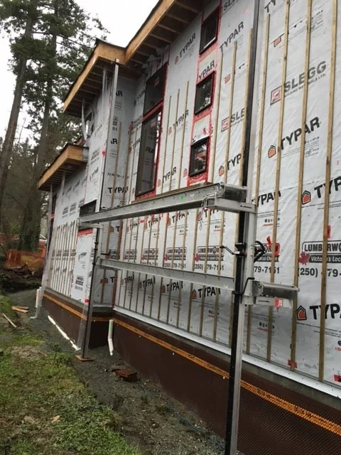 Jan. 11: Looking a the the house from the street - I a struck by the fact that "lumber" is no longer the dominant feature or colour of the exterior of our house. The house is "growing a skin" that will eventually keep us warm and dry. The lumber is wrapped in a white fabric/paper ( Typar) that acts as a barrier, protecting the build from the elements. On top of the Typar, strips of wood are placed as the foundation for the cedar siding that will cover our home from the bottom up! There is a high tech scaffolding along the West Wall - seems to be holding up well despite the constant wet of a West Coast Winter.