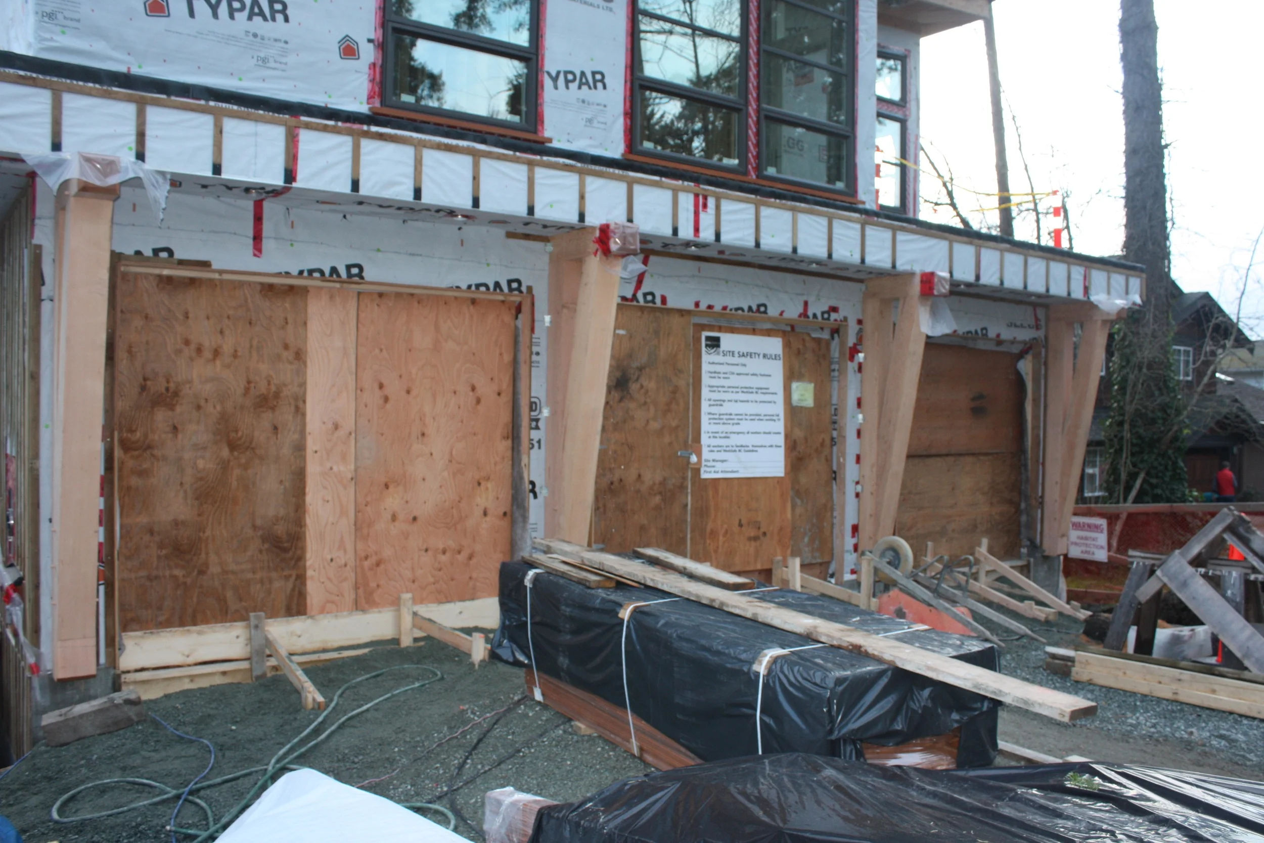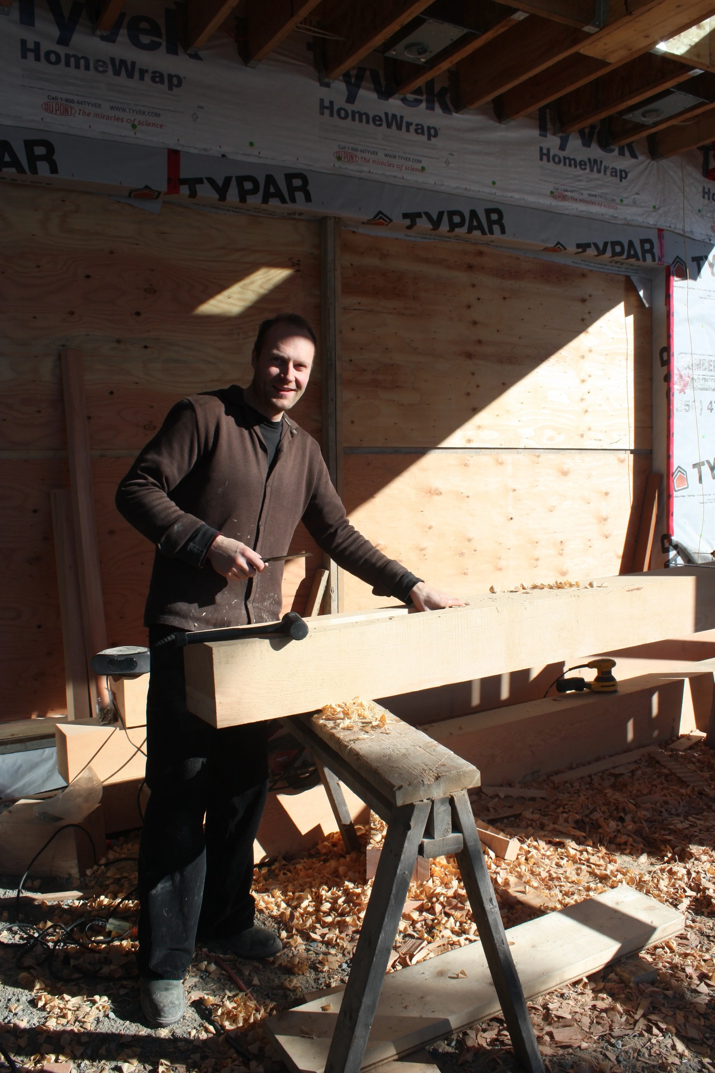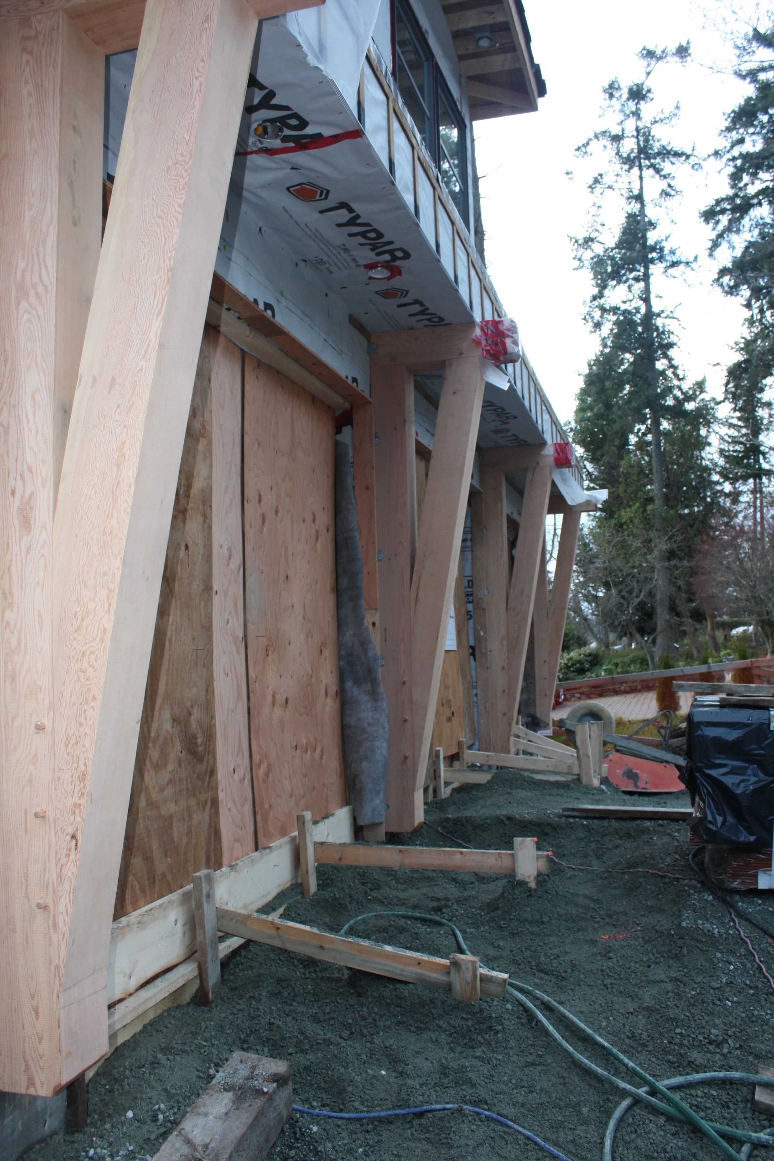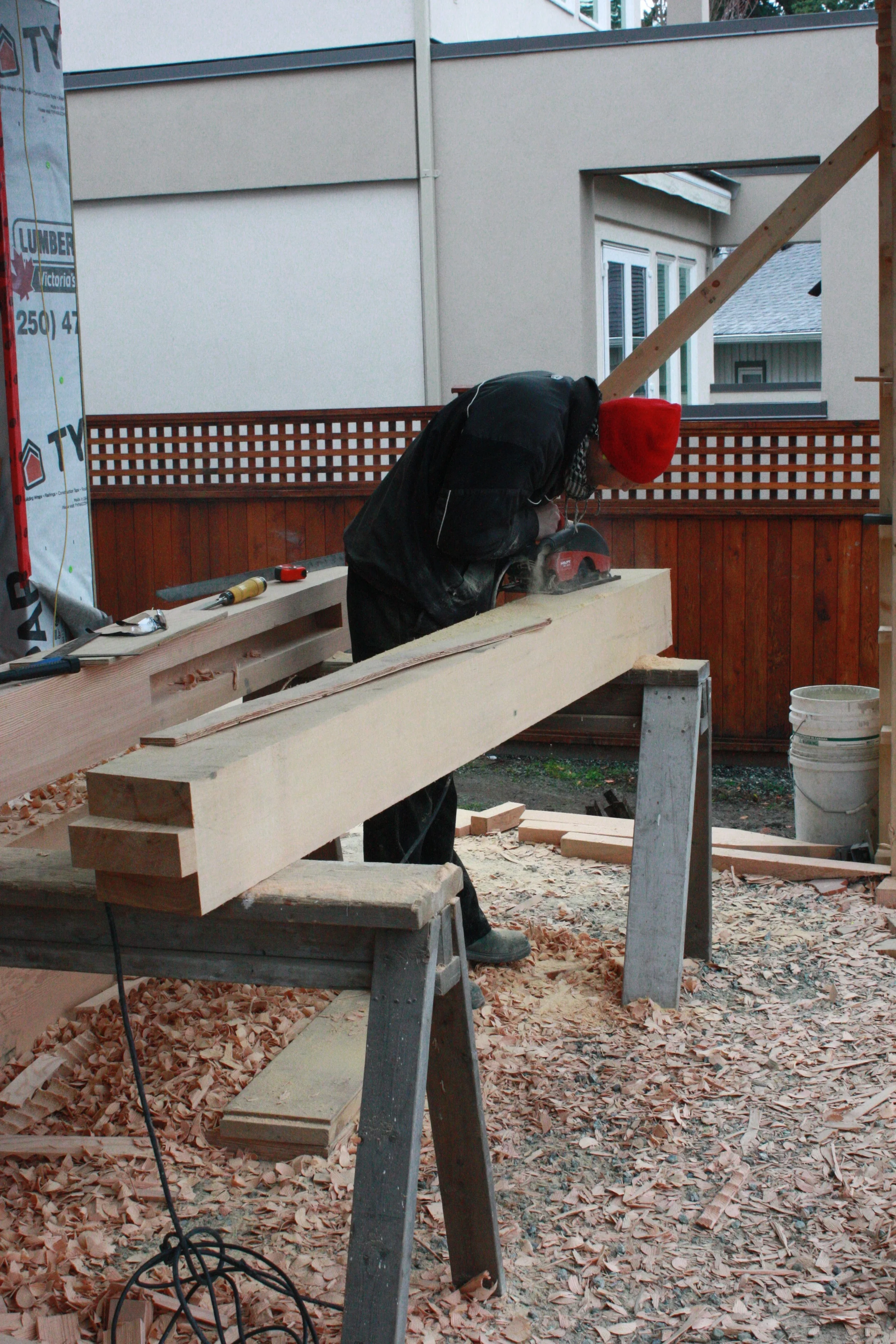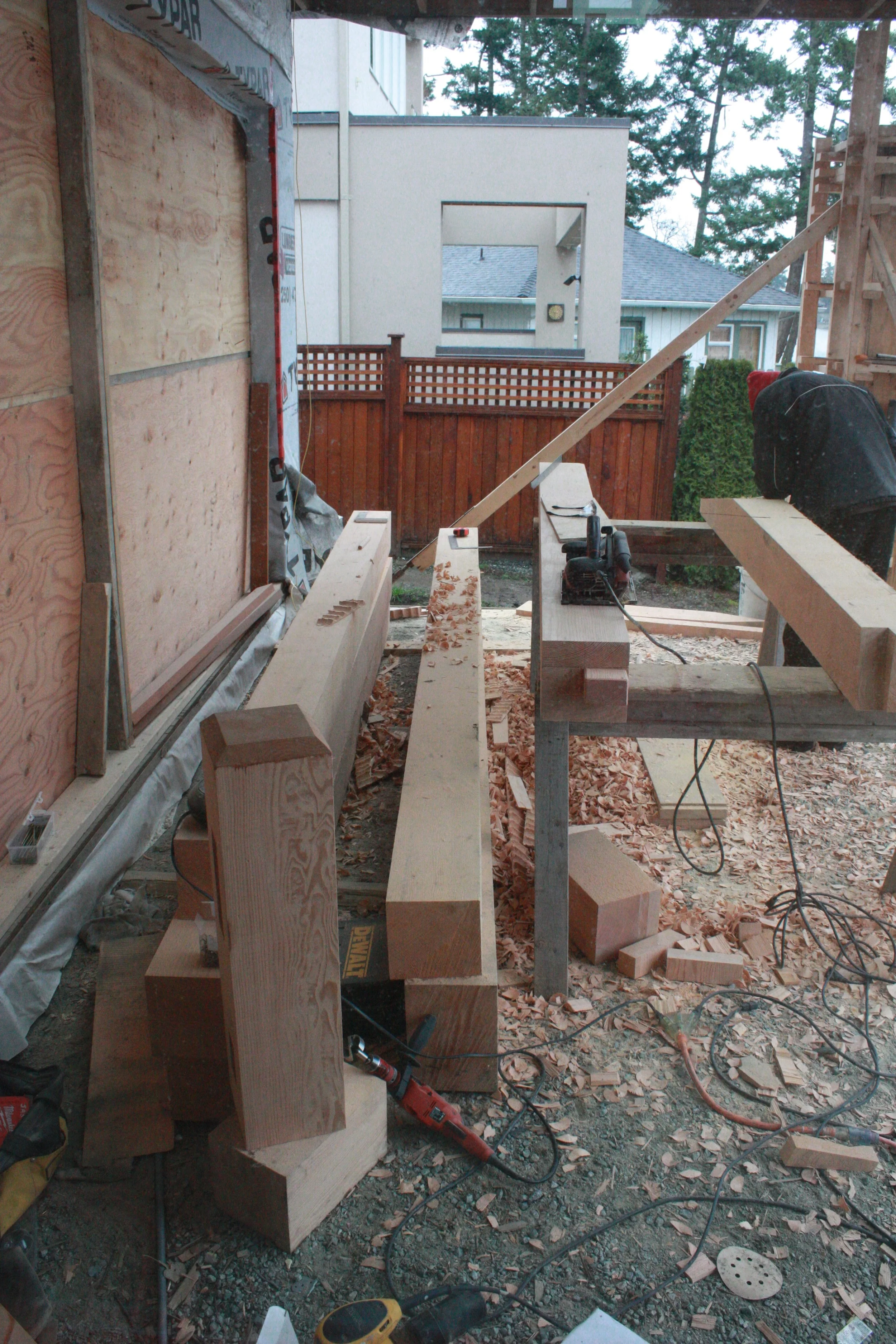 Feb. 13: Don continues to work on the amazing columns of fir, crafting them into the struts or knee braces that are placed on the front of the garage, beside the front door and the West side of the patio. I love the all wood, hand construction of this detail.