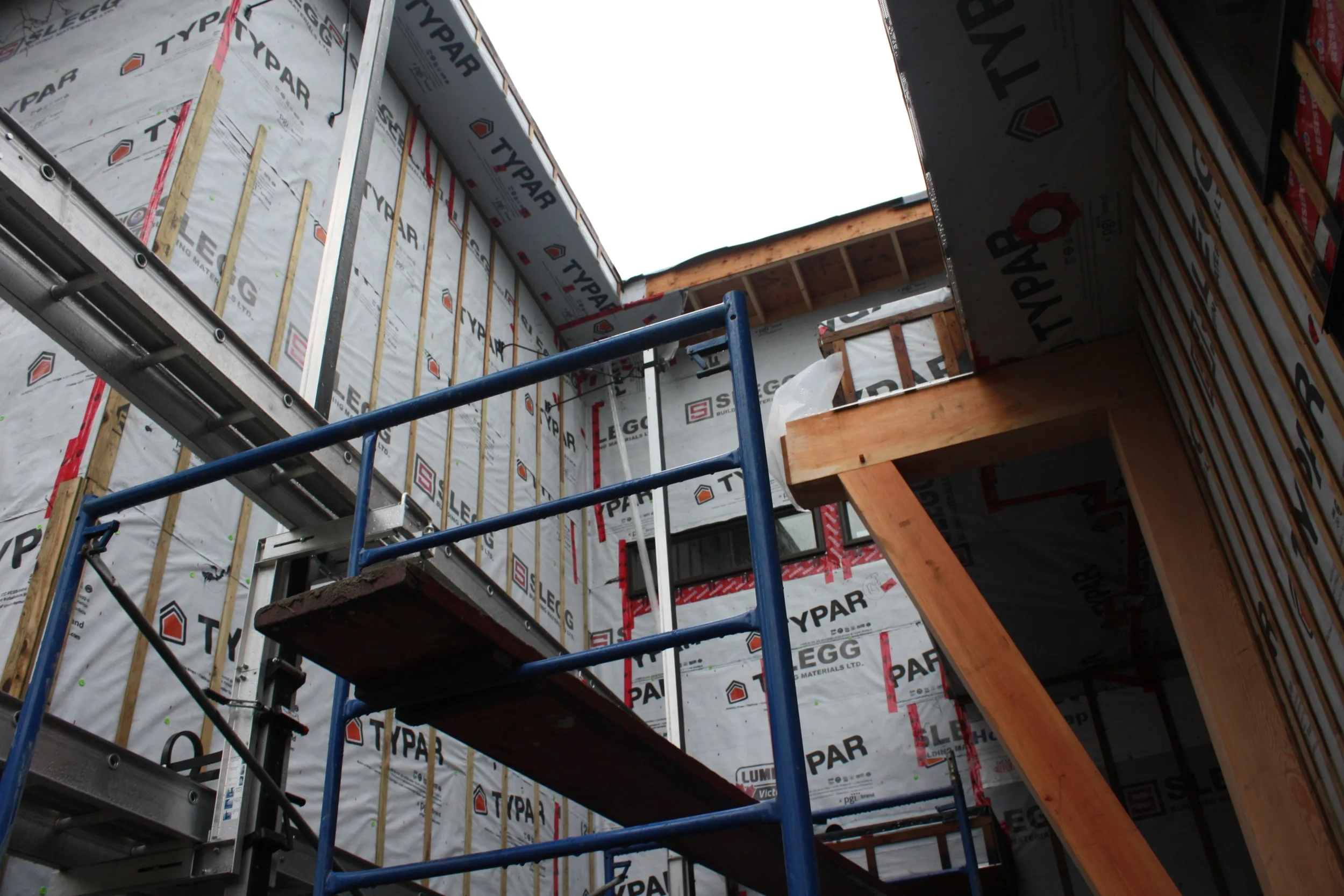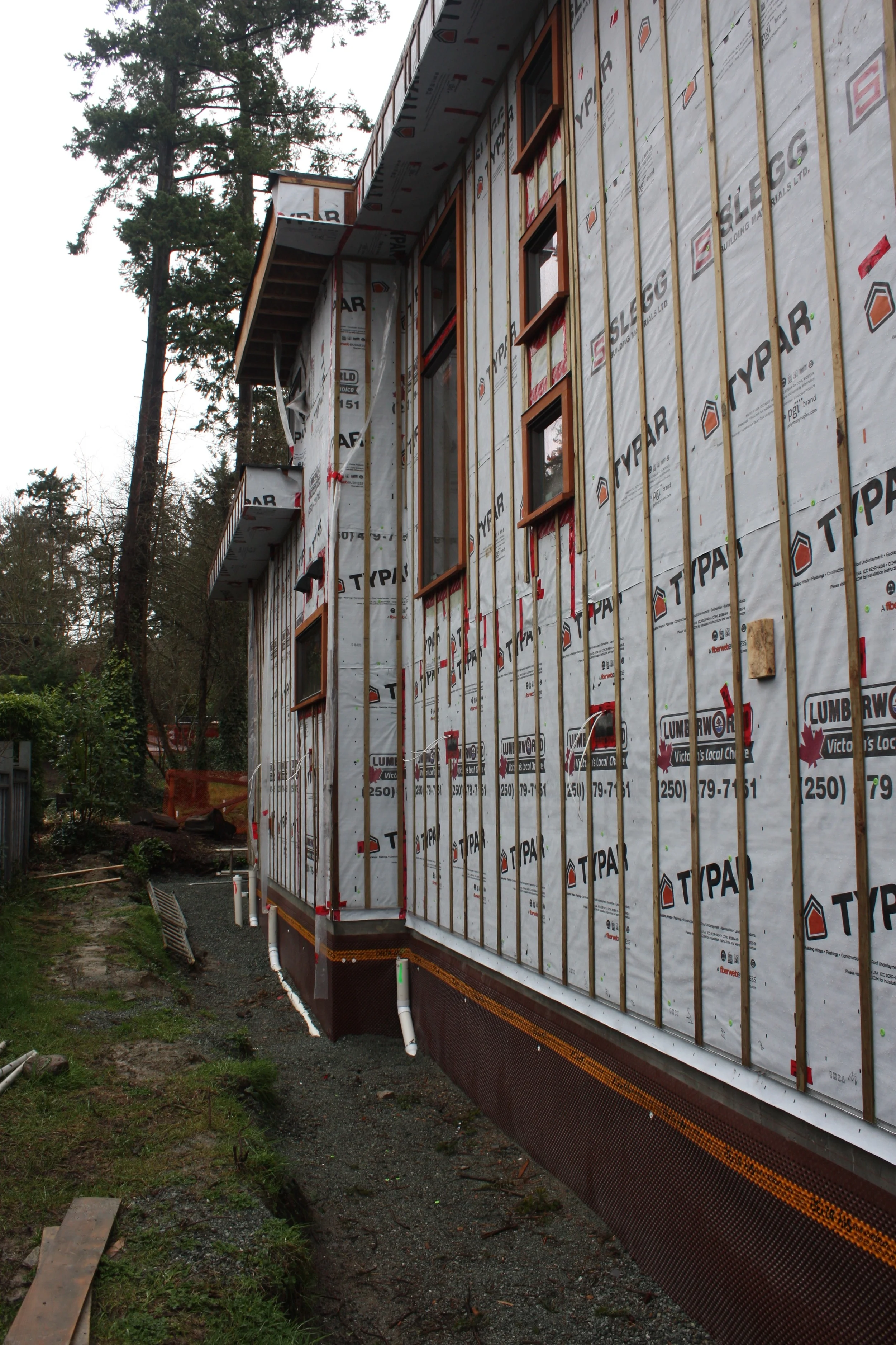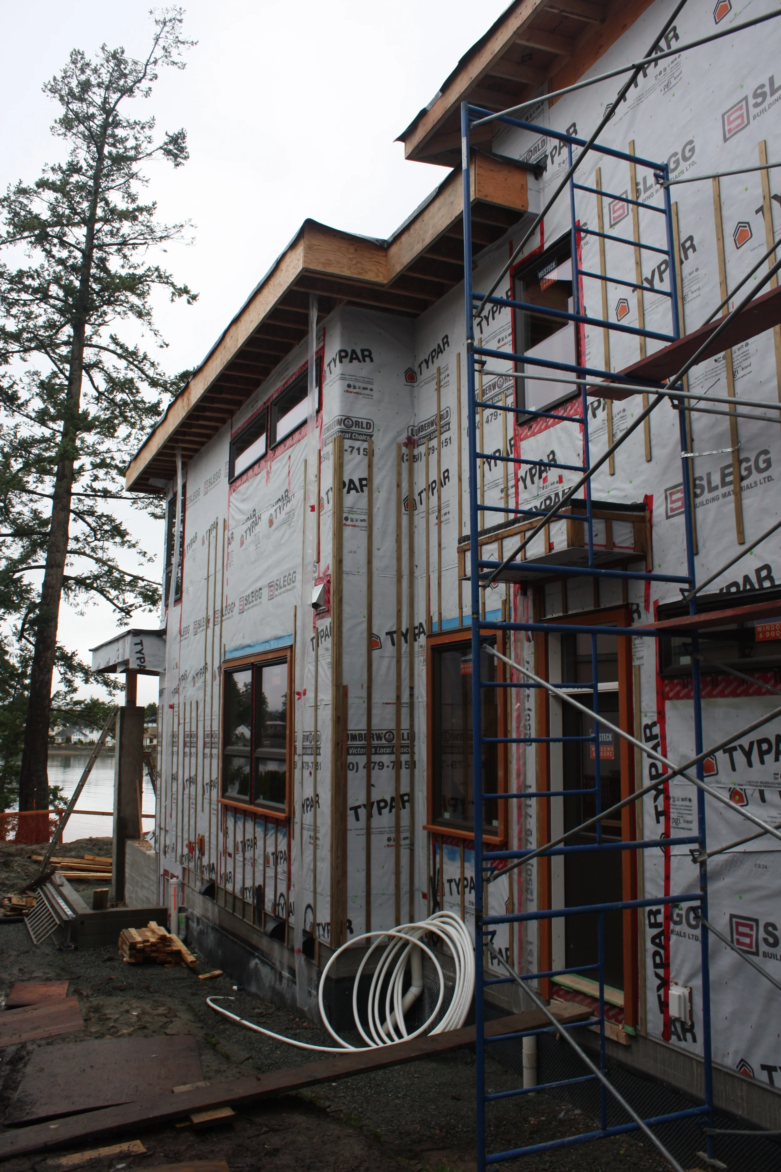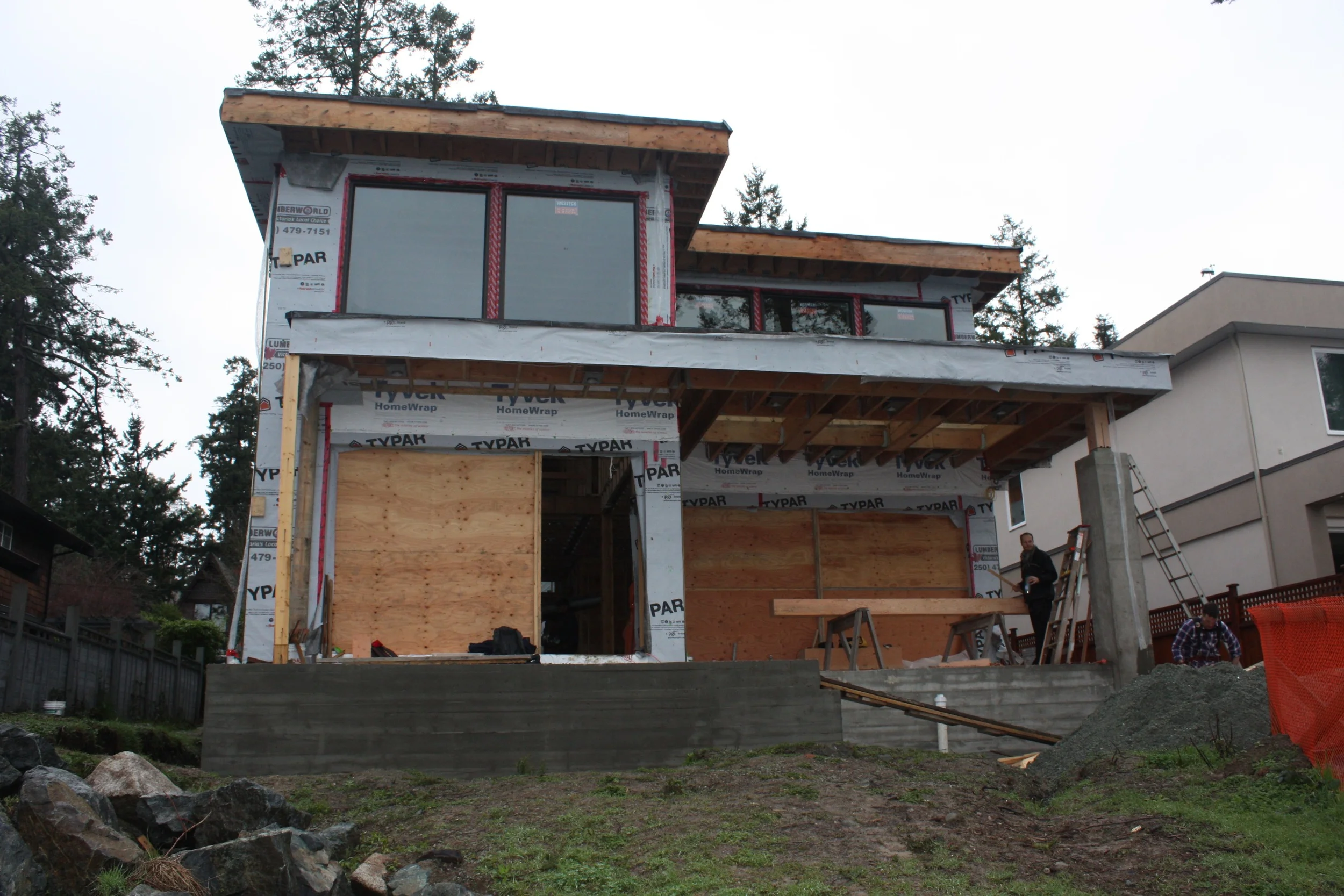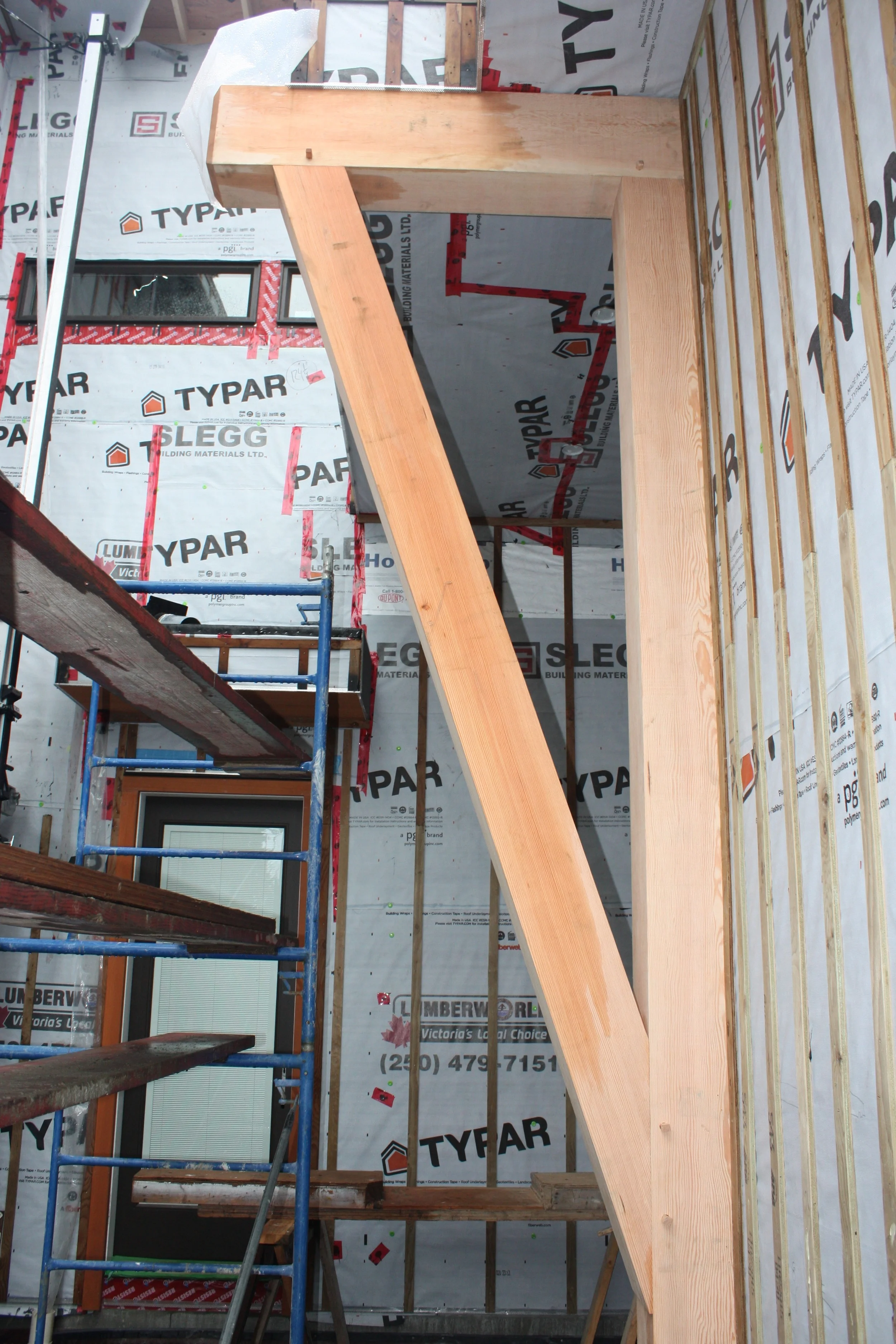 Feb. 18: The cool, rainy week in Sidney has not stopped the team working on the outside of the house preparing it for siding and masonry. Don completed the largest 'knee brace' or strut installed at the front entrance - it is over 12' tall!!. Setting it was a huge job, requiring the efforts of the entire team for most of an afternoon. It seems to float beside the front door, but will eventually have a stone base to rest upon. Concrete was poured on the floors of the garage, and the mechanical room, as well as within the framing for the column on the East side of the outdoor covered patio. The framing was removed, and the Fir pillar was set on top of the column, so it now supports the patio roof. The column will soon be adorned with stone facade, as will the patio walls, the front of the garage and strategic corners of the house - can't wait to see the masons at work.
