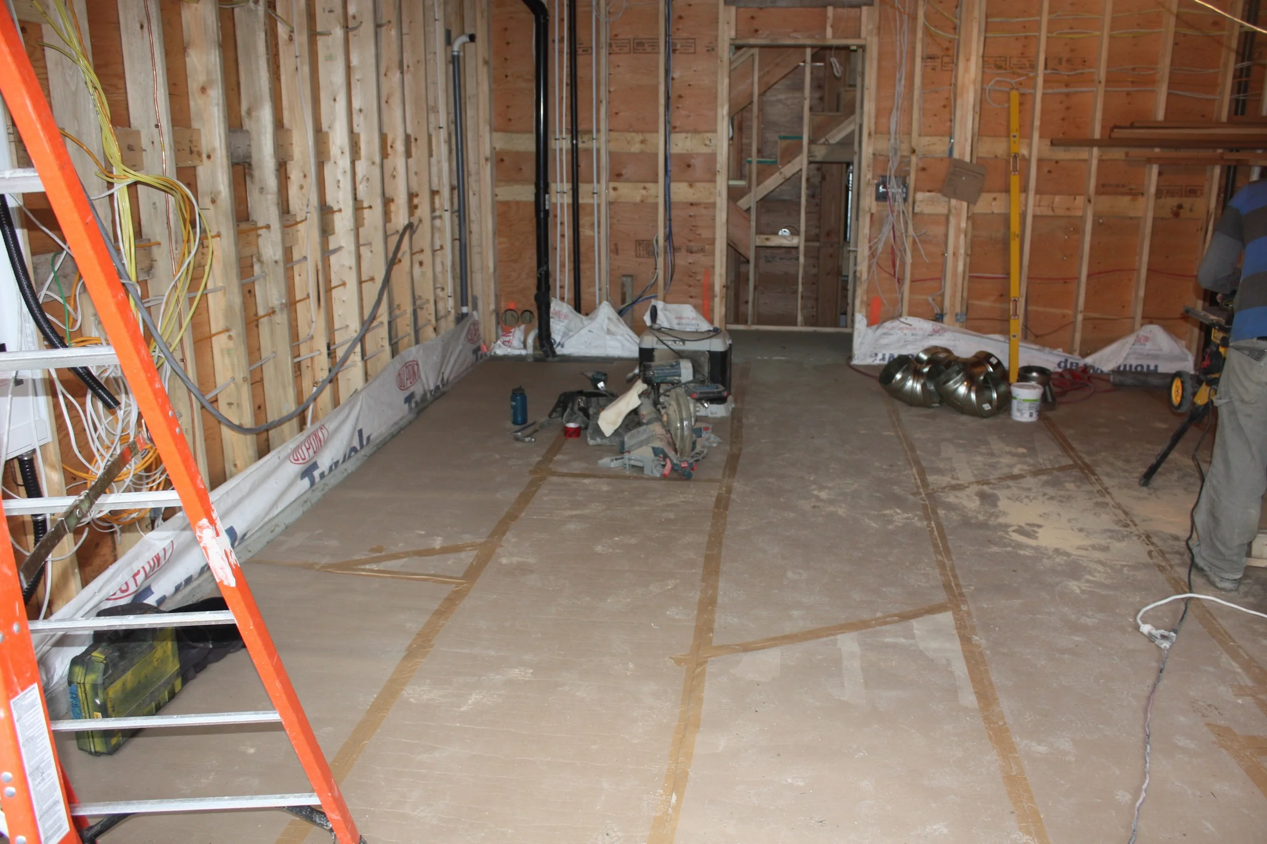 Cement floor poured in the garage, and covered with cardboard to protect it during construction