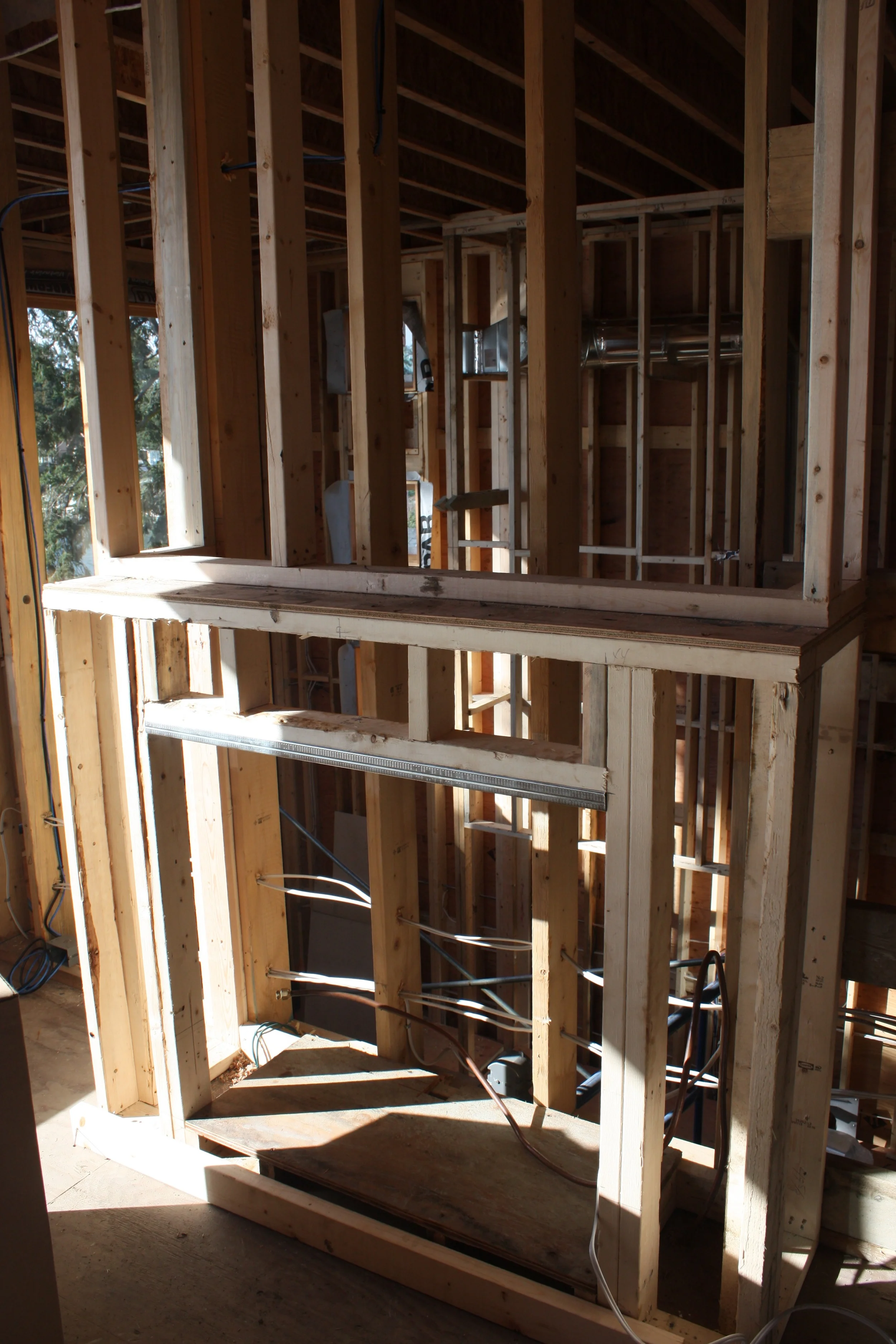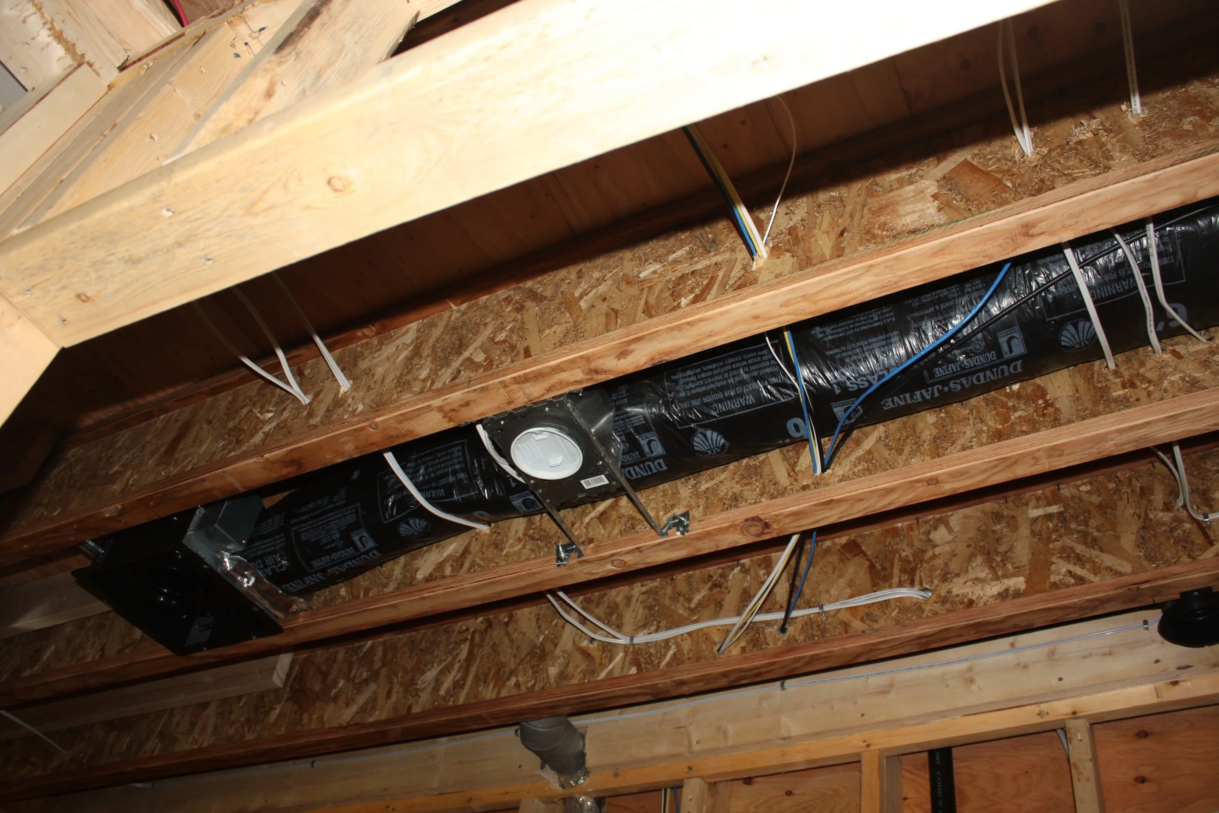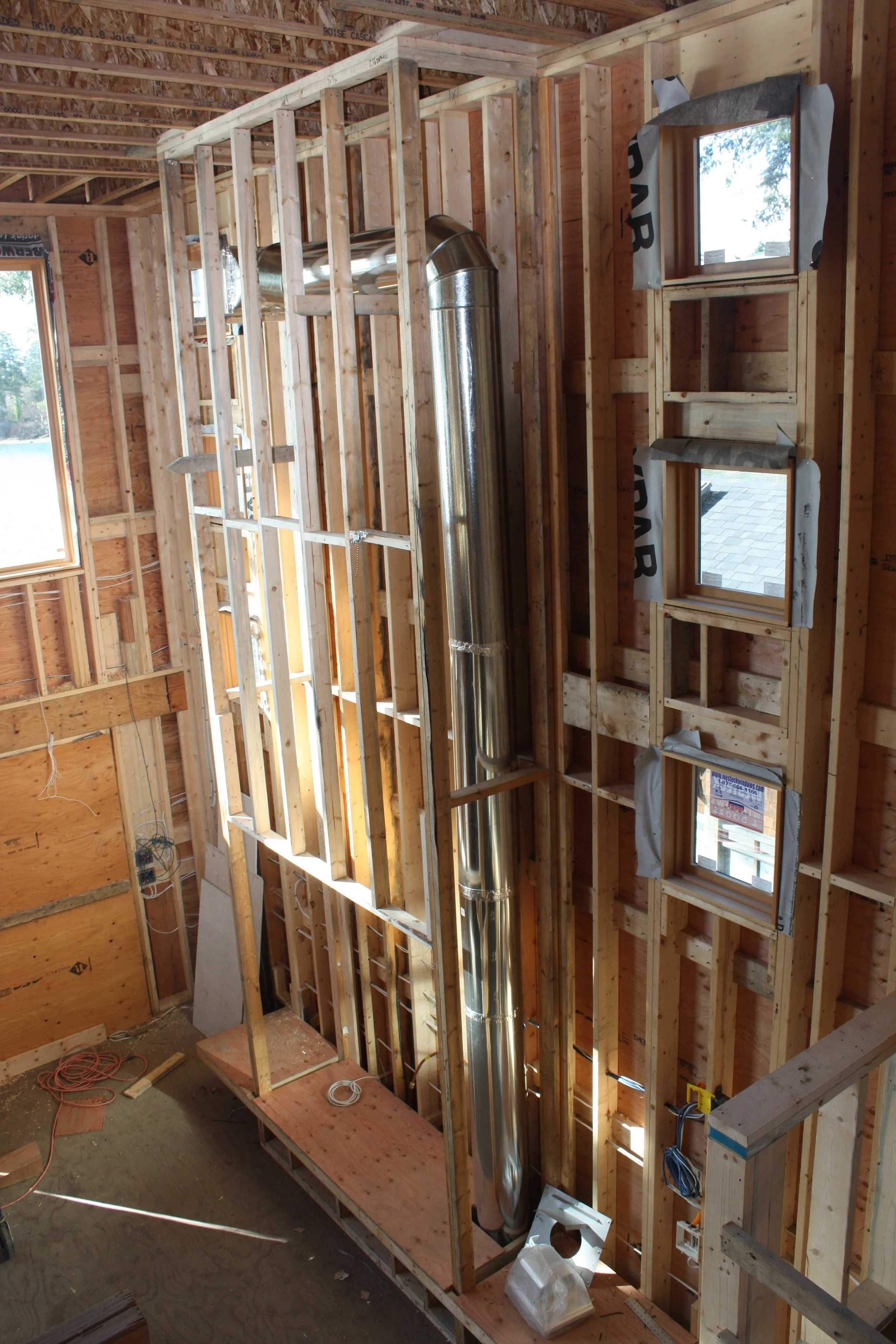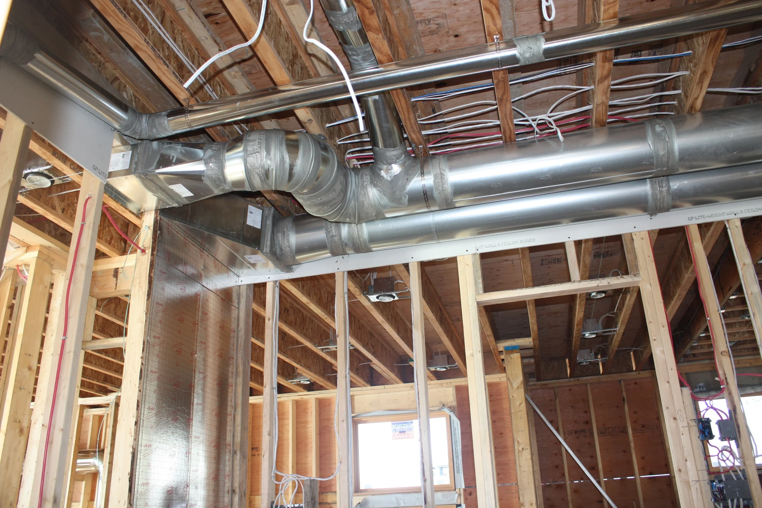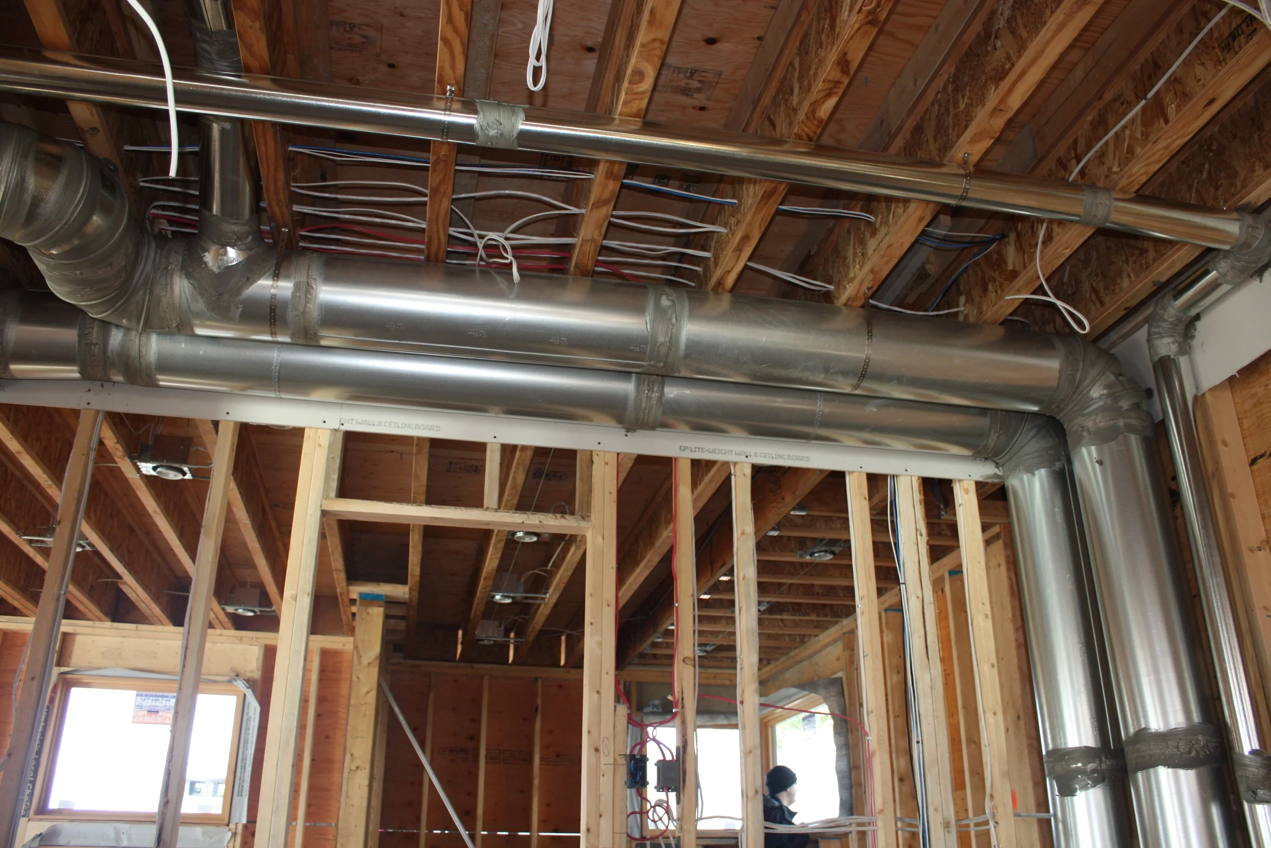 Heat/Ventilation/Recovery pipe installed within the fireplace structure in the great room. The AC ducts exit below the floating hearth on both sides.
