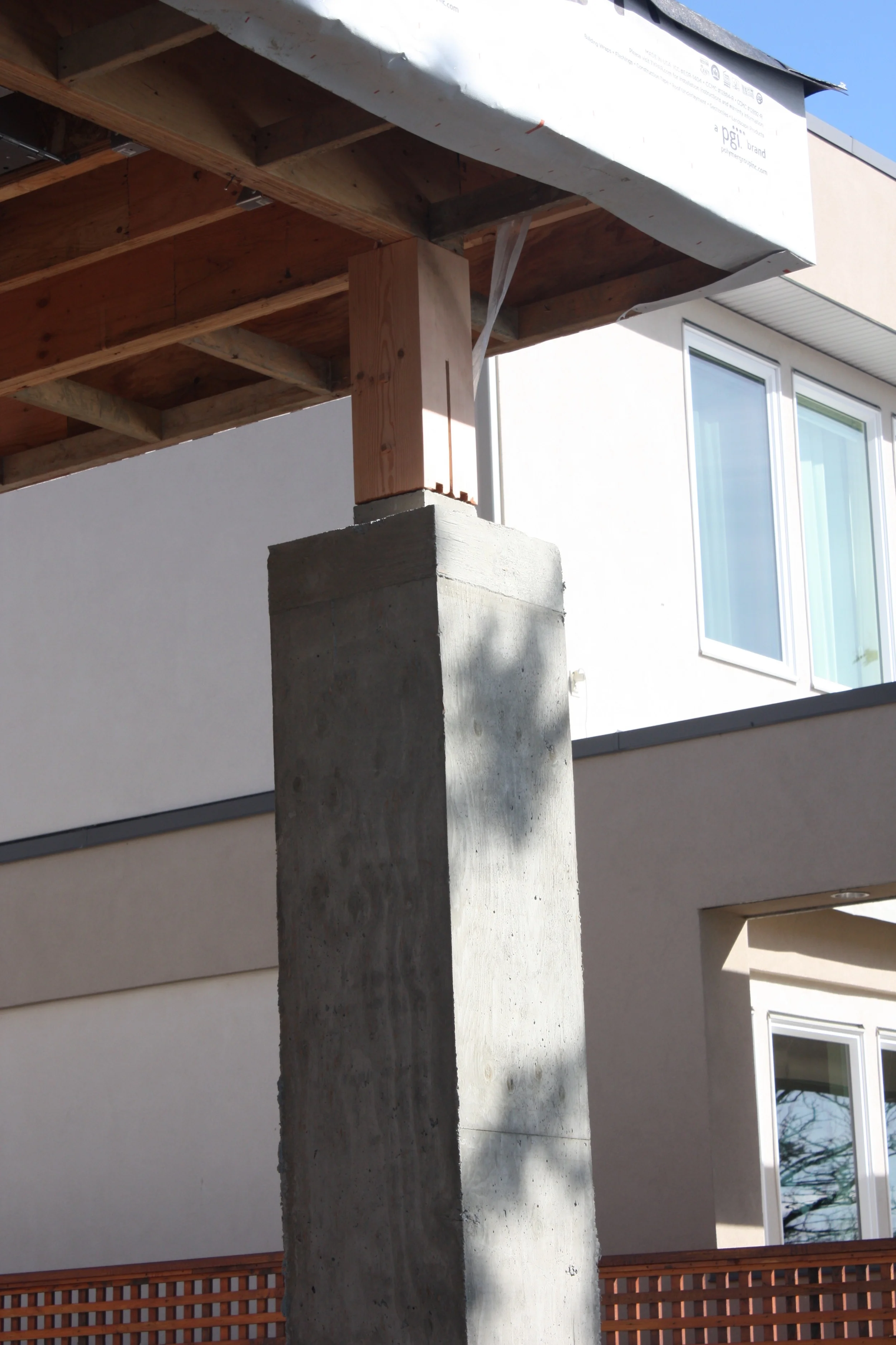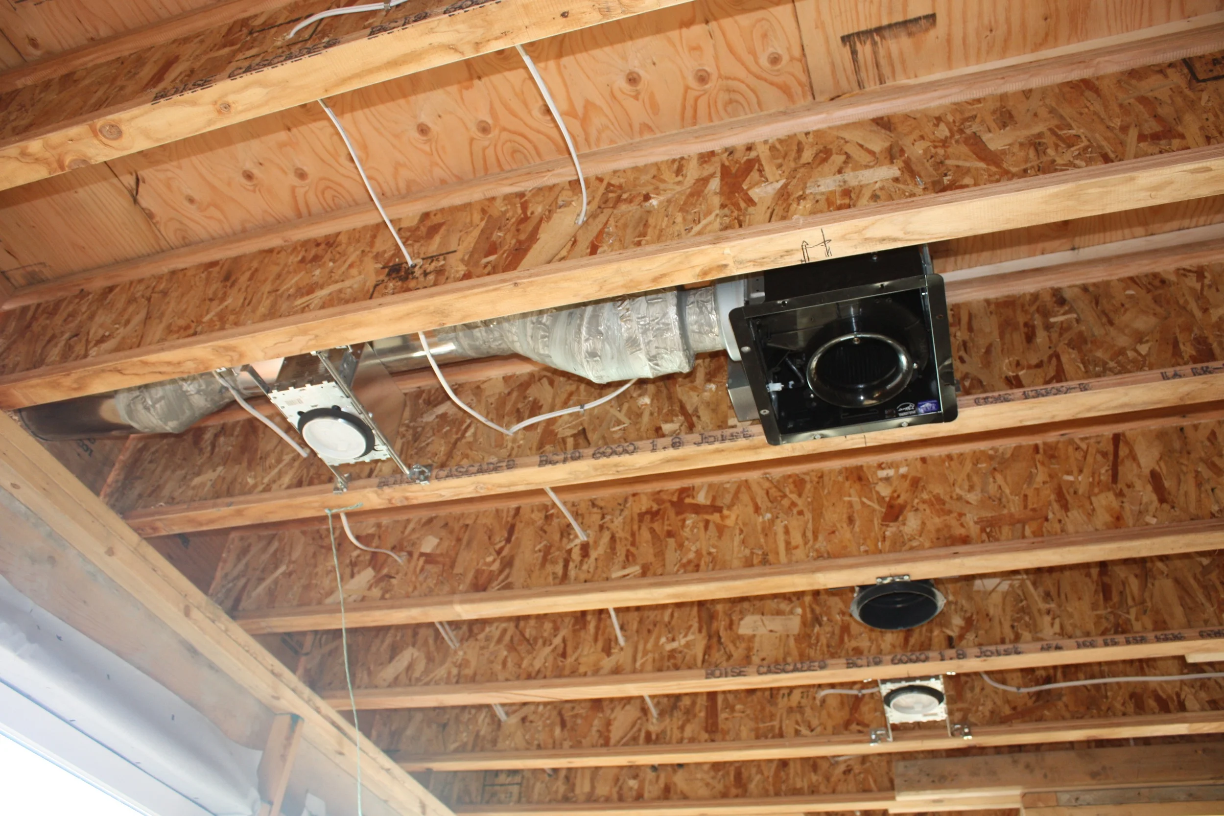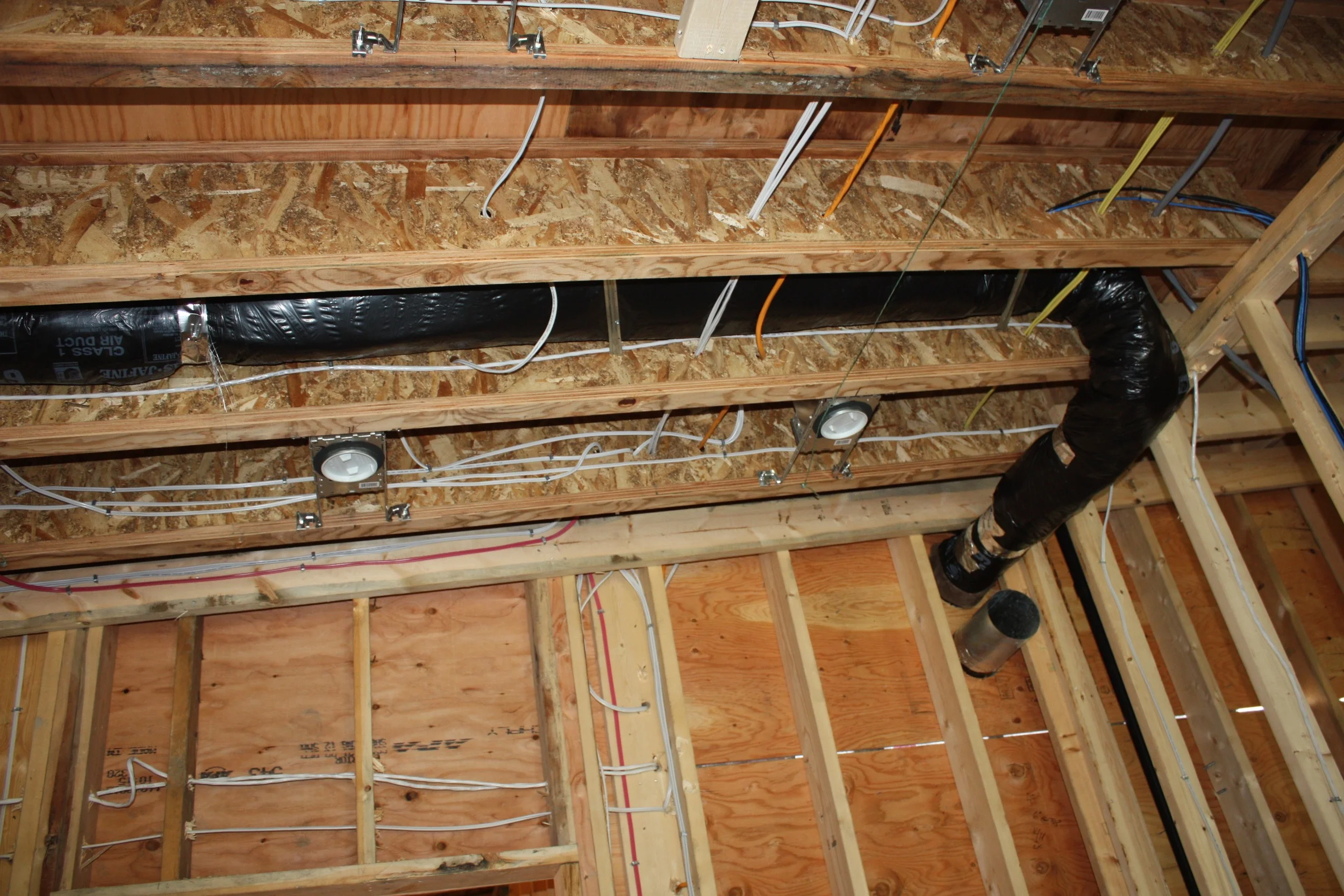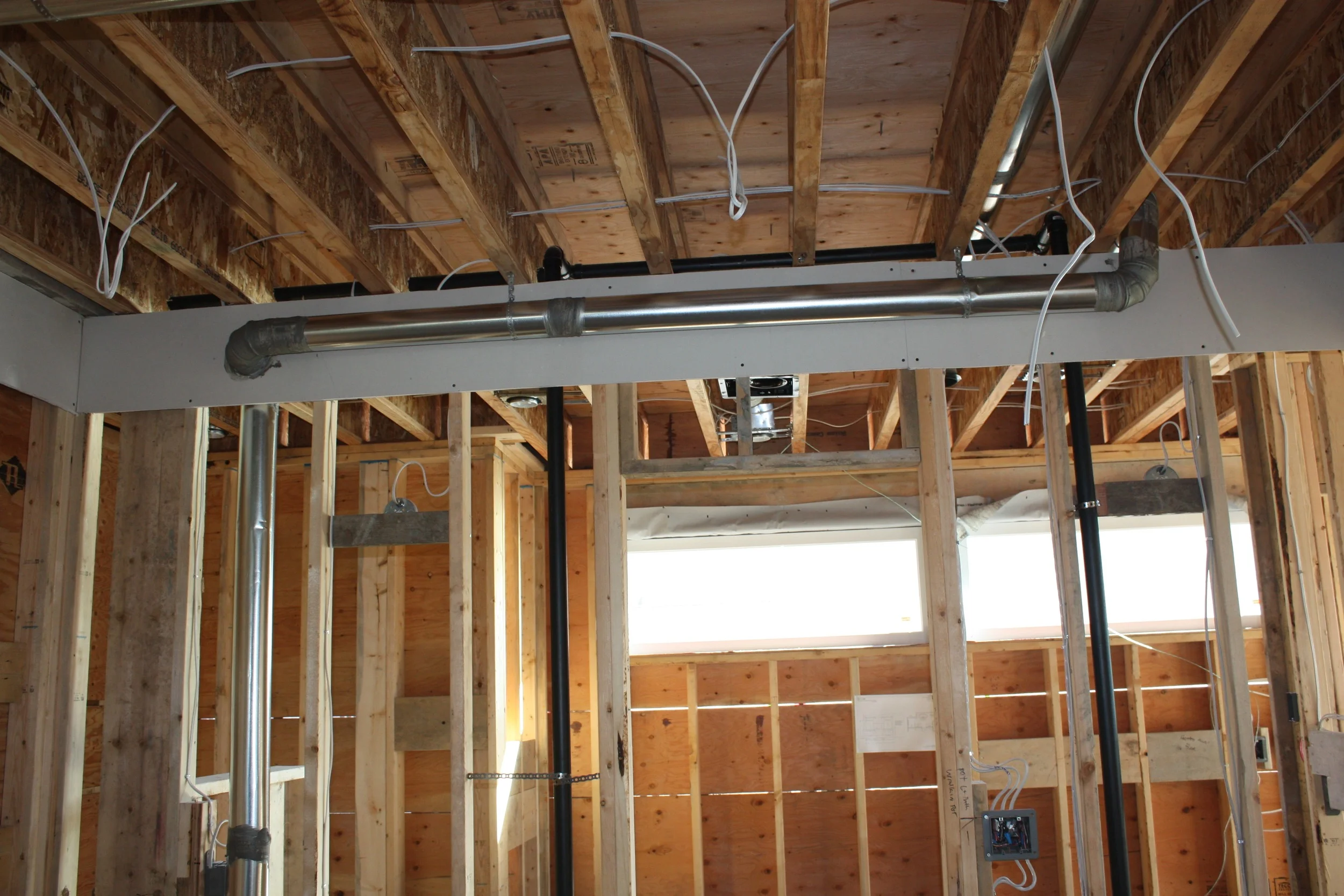 The bathroom fan and kitchenette venting rough-in exit on the south wall of the rooms above the garage.