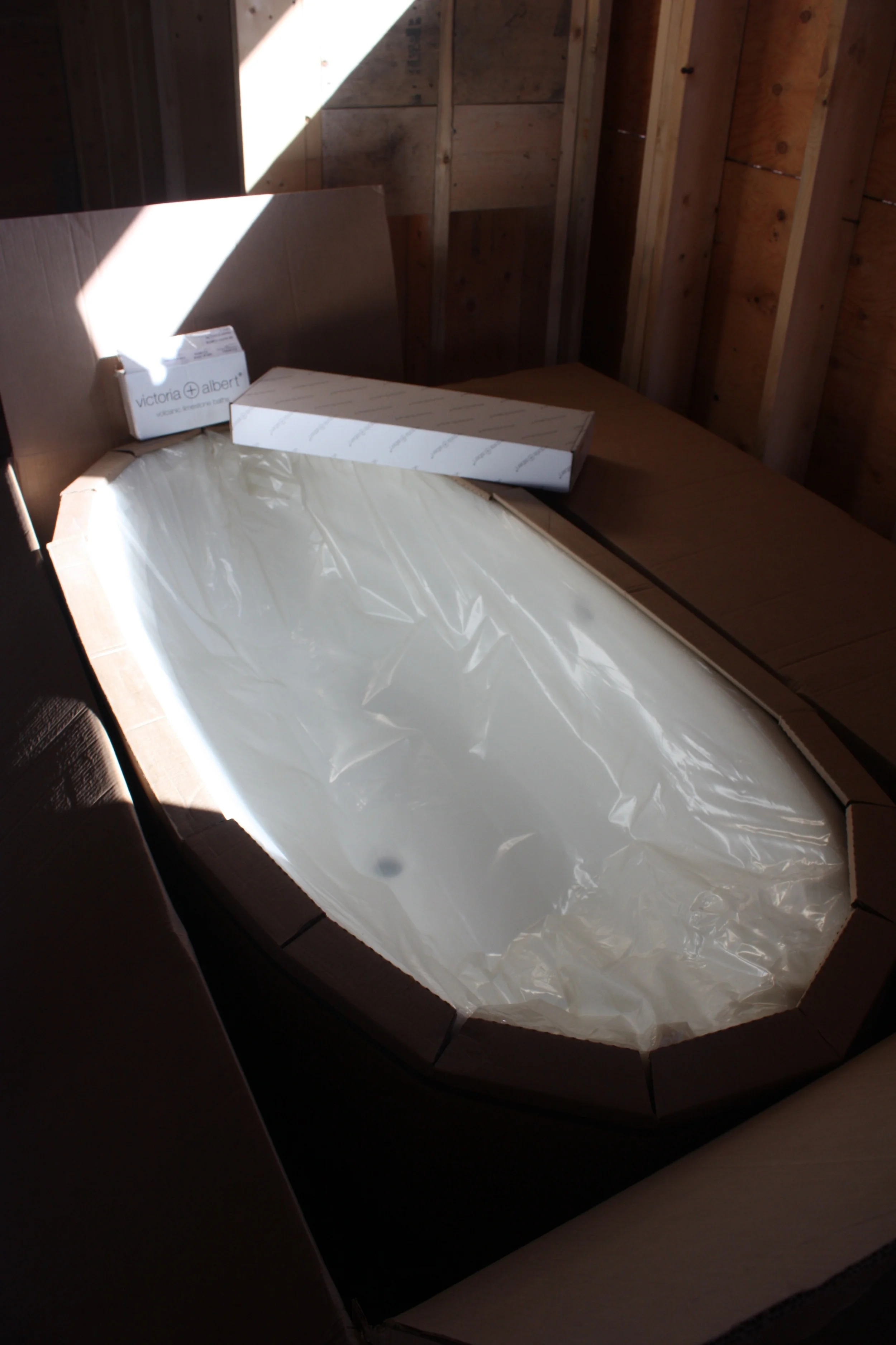 Feb. 21: We are so close to completion of the utilities..... The venting "guys" worked hard this week to get the HVR and AC systems in. This has meant dropping the ceiling in the master bedroom walk in closet to allow for air distribution and recirculation pipes. Additionally, bathroom fans and kitchen venting rough-in has been installed, as well as the controls for the master ensuite shower. AND there was a surprise in the bathroom - my new bath tub has been delivered! And speaking of deliveries, the Nana walls have arrived from Germany. They are in the garage boxed up, to be installed at a later date. All very exciting.