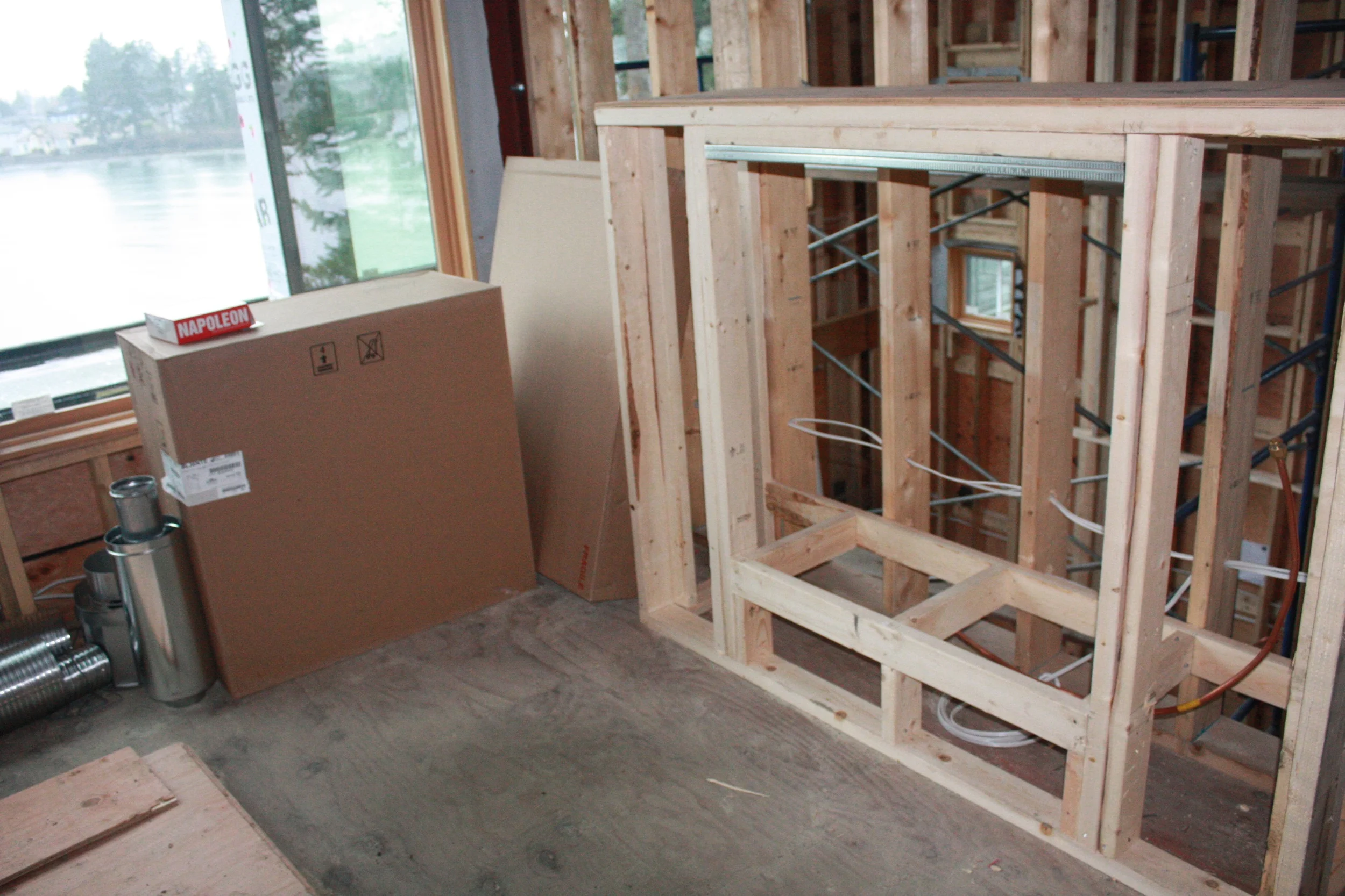 Master bedroom fireplace framing and fireplace in a box beside the frame!!!