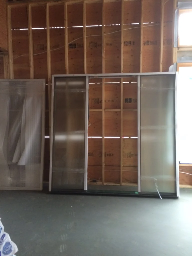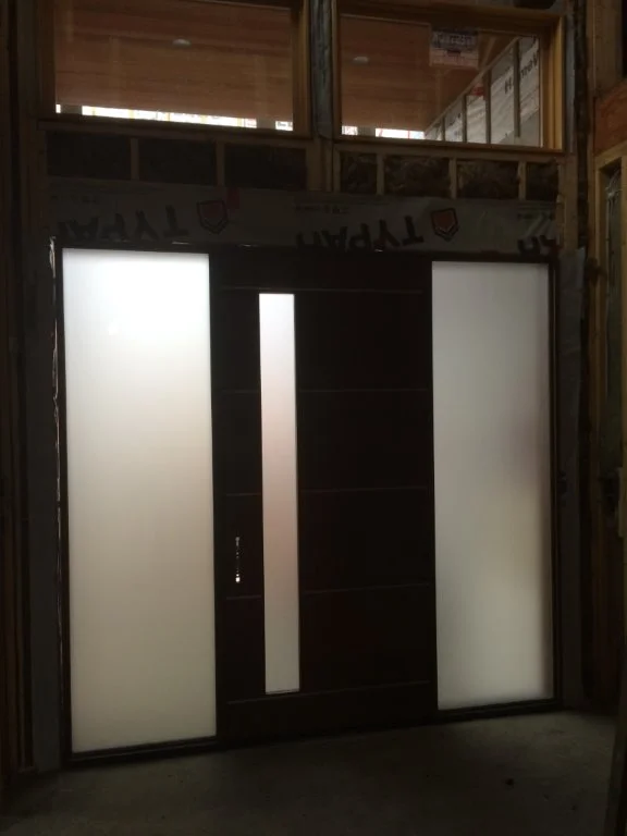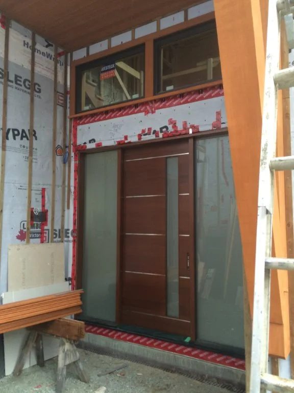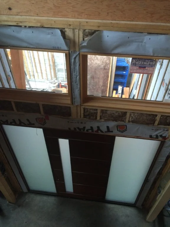 March 14: We are weather tight! The front door arrived, and was installed late last week. It has been months since I ordered the thing, and I was quite nervous to see the finished product. The door window panes look quite opaque in the pictures, but actually do have visibility through them at close range. I am really pleased with the door and installation!