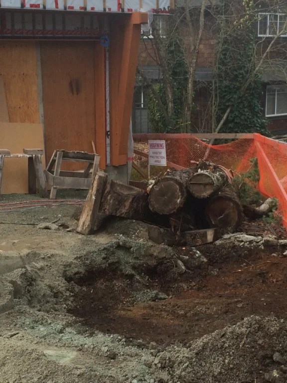 Working around the tree that was felled prior to construction. We hope the tree will be outdoor furniture one day.....