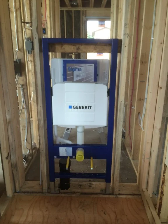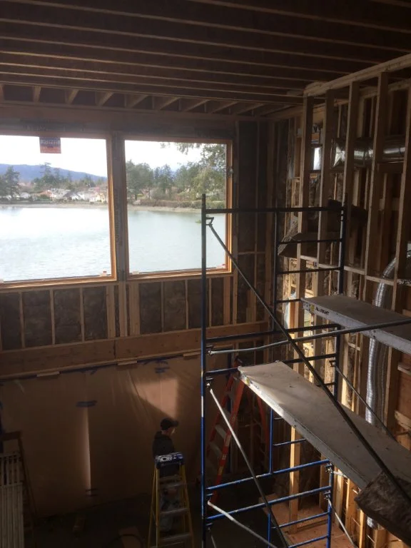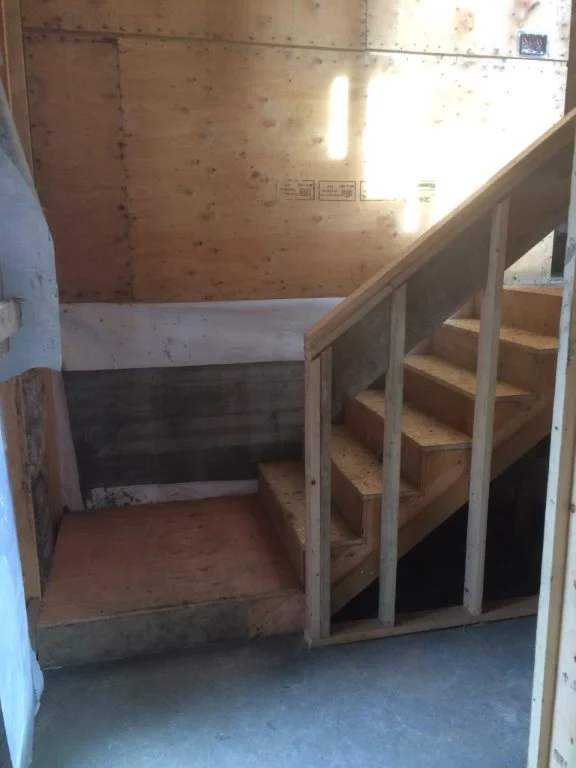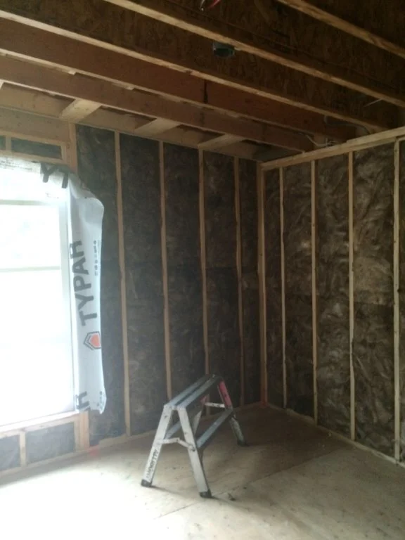 March 14: The insulation process has started, and should take about a week. There are several products being used in the house; a fiberglass product on the exterior walls, and a wool product on the interior walls that work as both insulation and sound barrier. Spray insulation will be used in the roofs, and of course there was already foam core sheet insulation on the exterior of the roof. Actually the list of individual products used throughout the build is extensive - our contractor is very detail orientated. Also, the rough in (I believe) is finally completed - the toilets have been roughed in, and the back staircase complete.