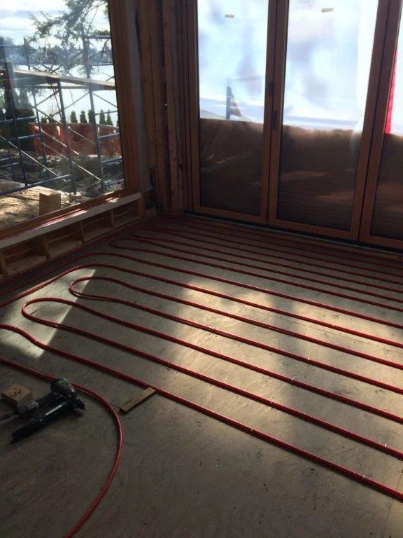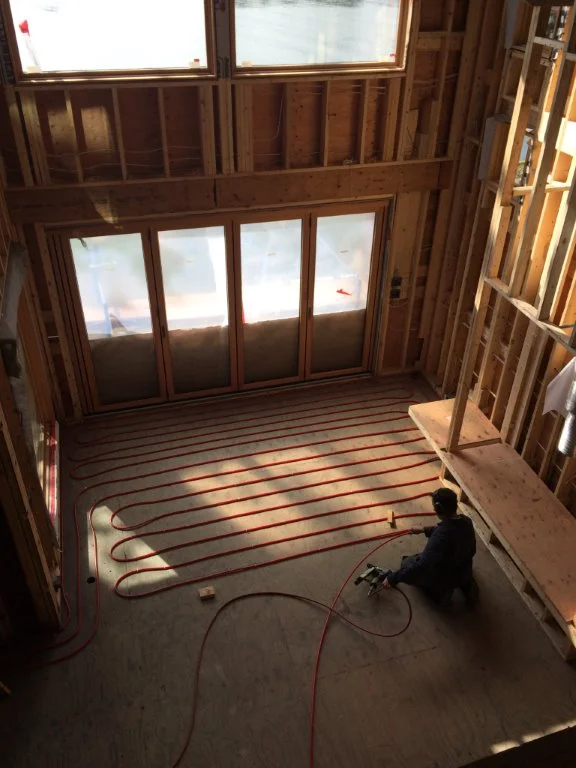 Mar. 3: The process of installing the in-floor heating has begun, and should complete this week. Long tubes made of recycled PVC are "stapled" to the sub-floor and through a series of manifolds and valves, attached to a boiler that lives in the mechanical room. The main floor is divided into four zones that can be heated independently (or not) and controlled by the home automation system. Once all the pipes are down, a layer of concrete will be poured and leveled - readied for the wood floor installation. Upstairs we will utilize baseboard heaters and small gas fireplaces to heat the spaces.