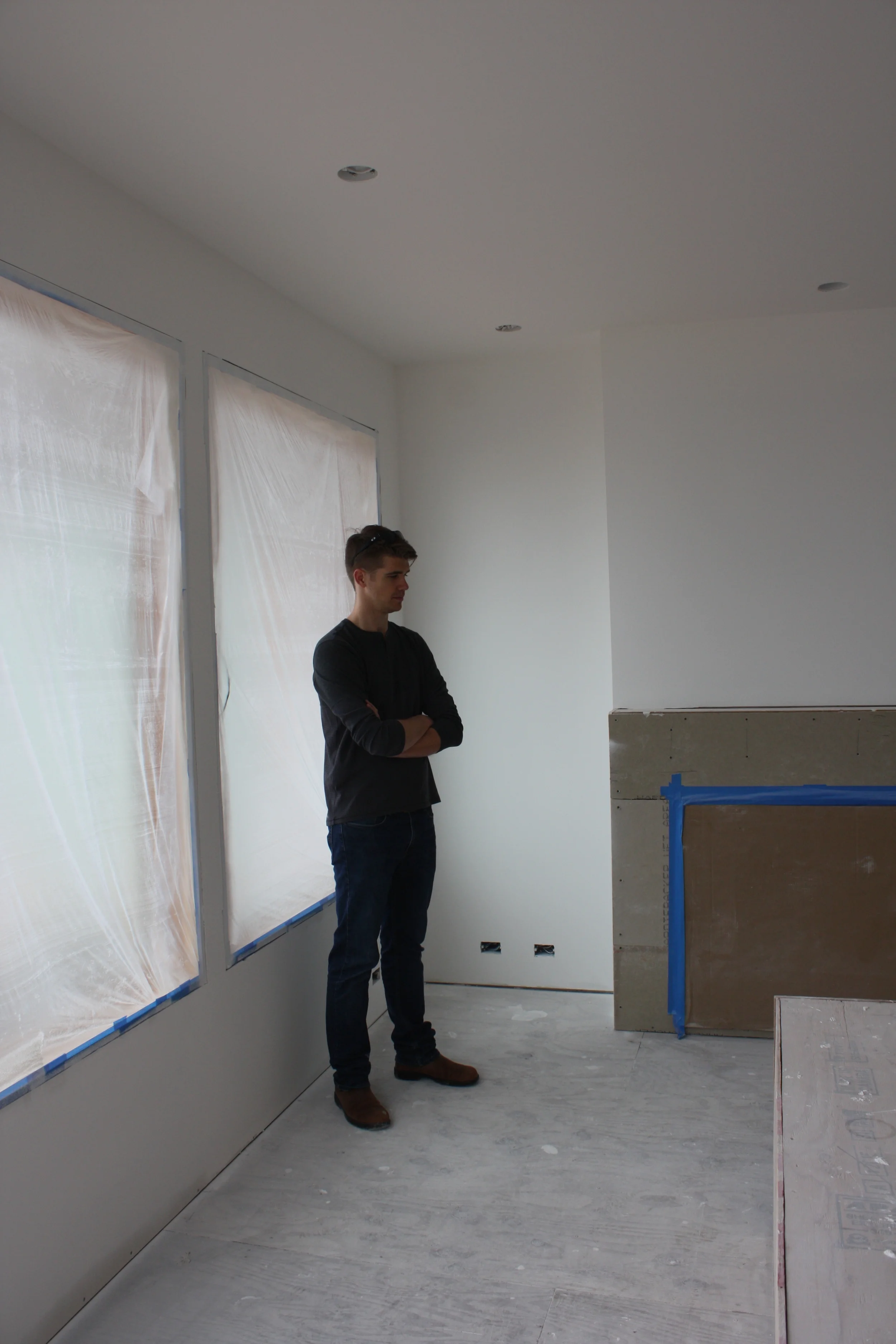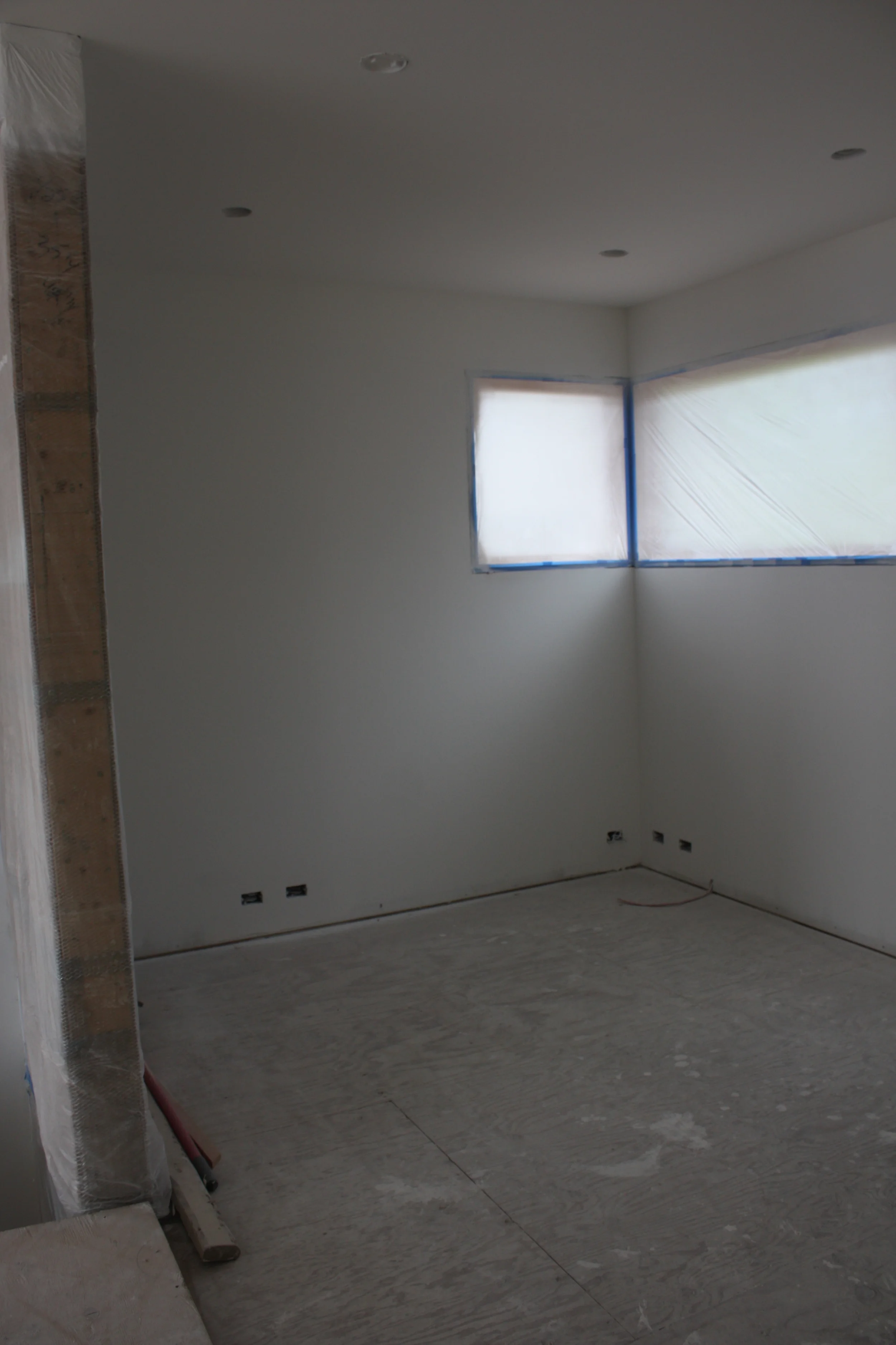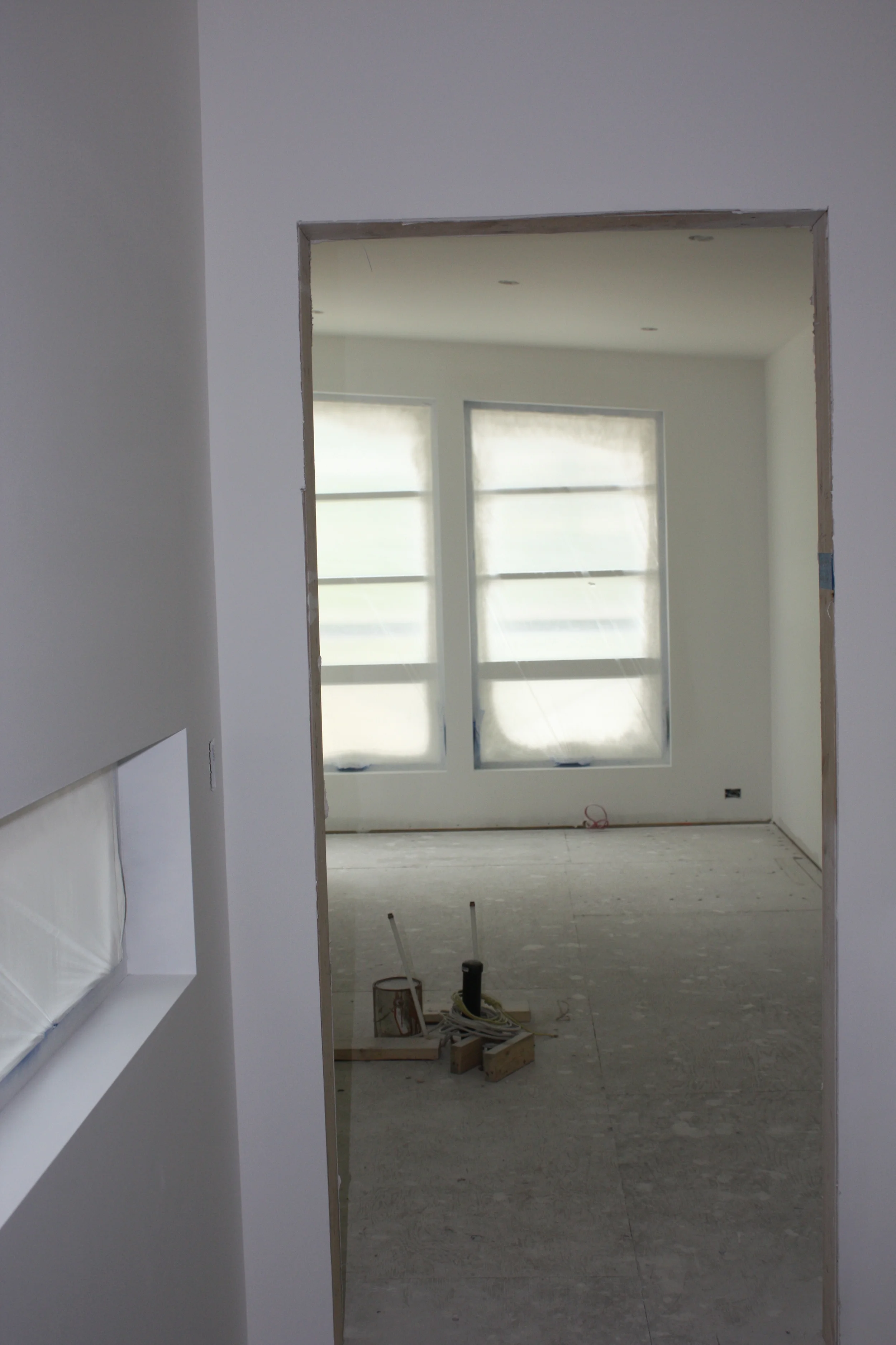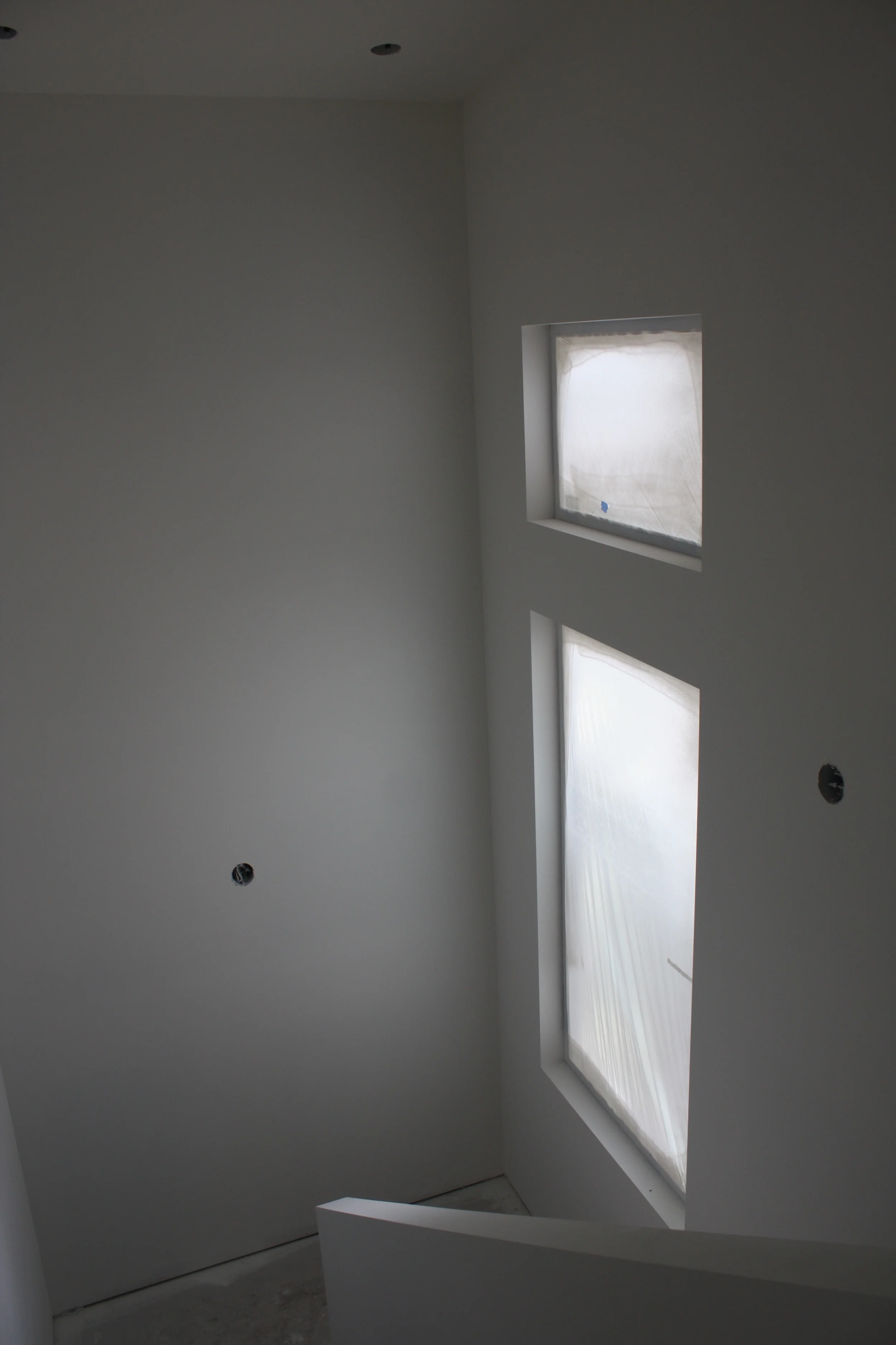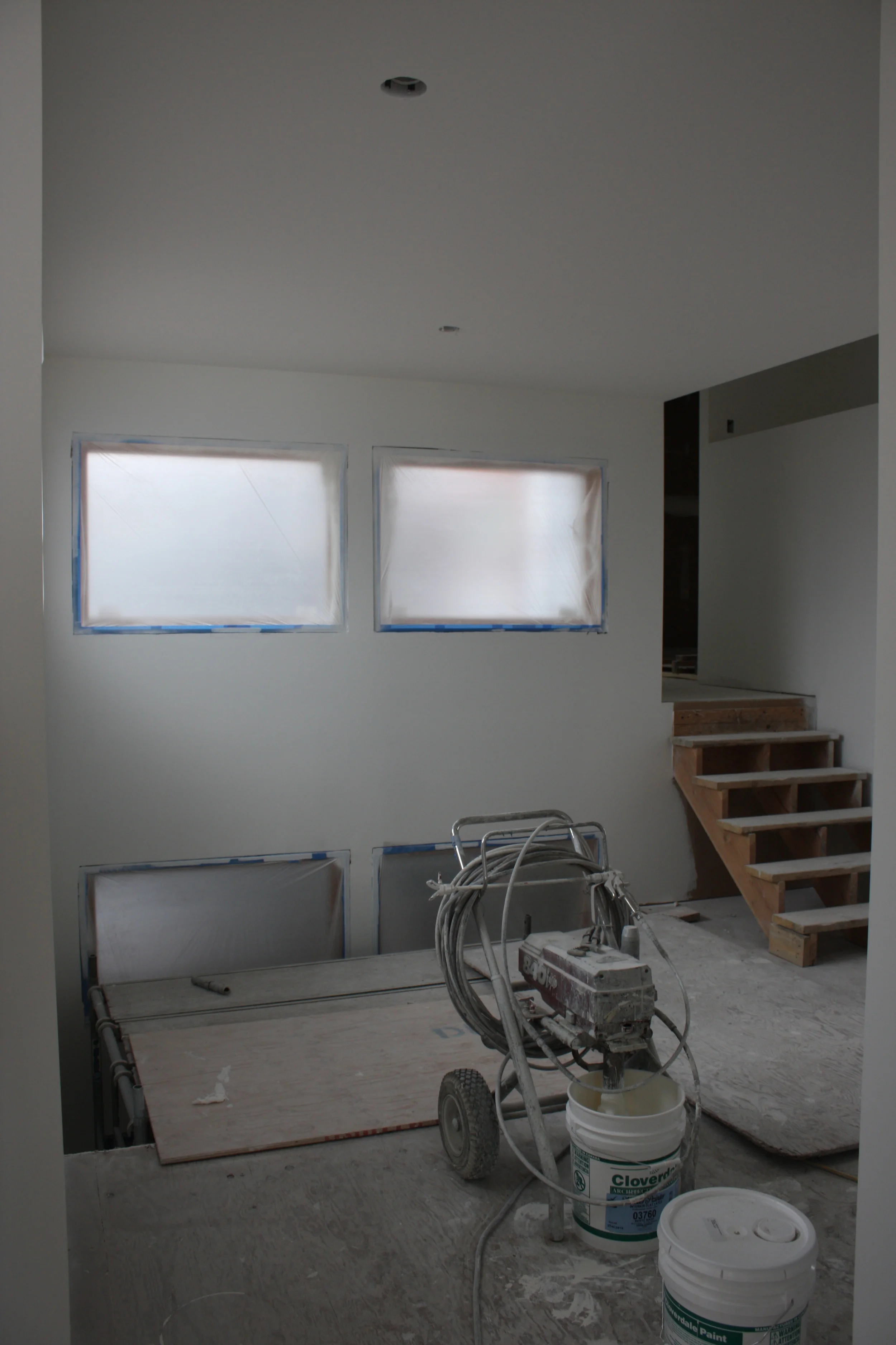 April 27: The drywall process seems to be complete for now... hard to tell as the inside scaffolding remains for the painters and carpenters to install the window trims. For months I visited a construction site daily.... and now I see a house taking shape. The painters started late last week - spraying and rolling on the drywall sealant and primer. The colour goes on this week. I have not gone the house much during the painting process as I don't have a respirator - the fine mist of paint is everywhere!! I will post pics when they finish....