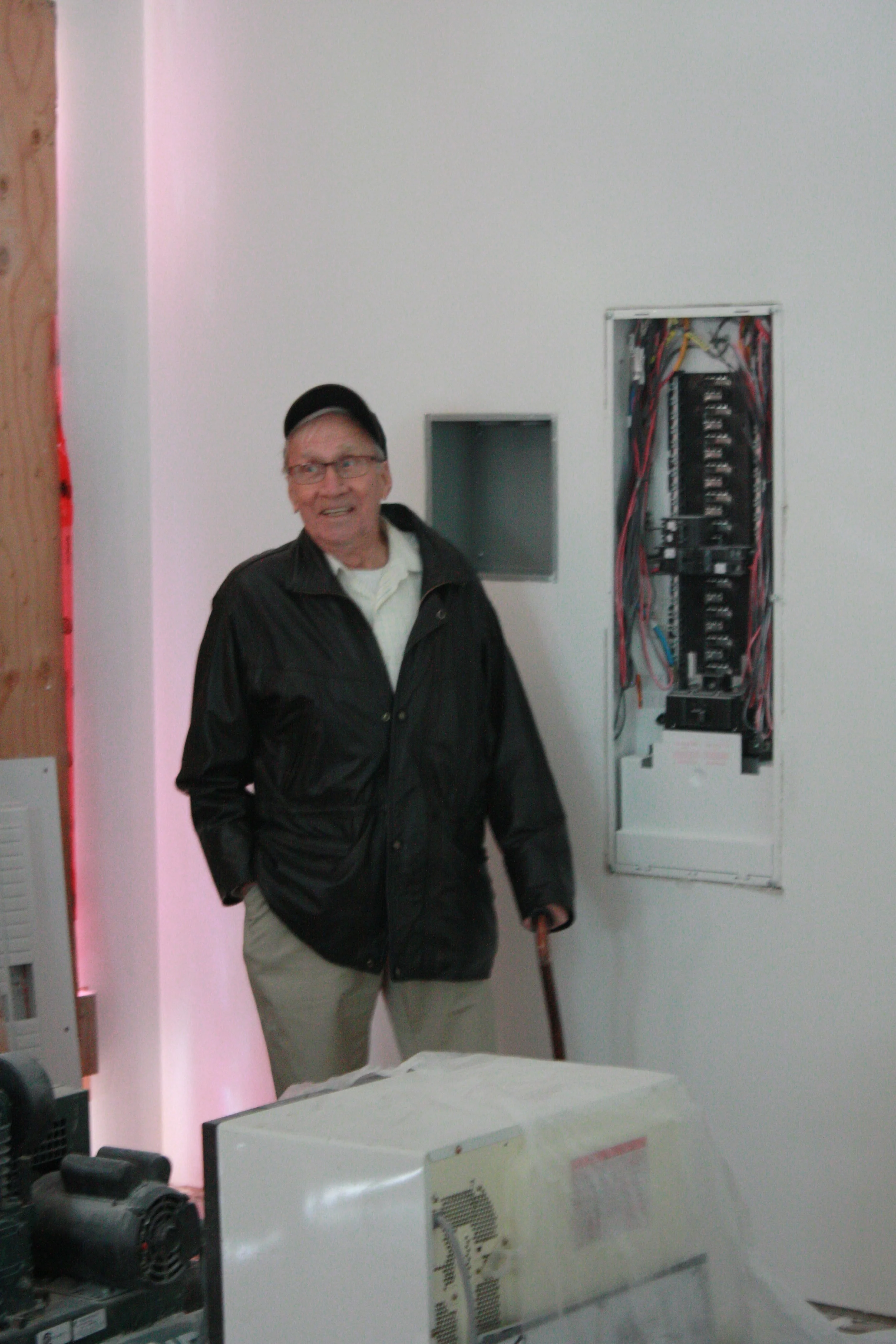 In the garage - my father (the electrician) checking out the fuse box.