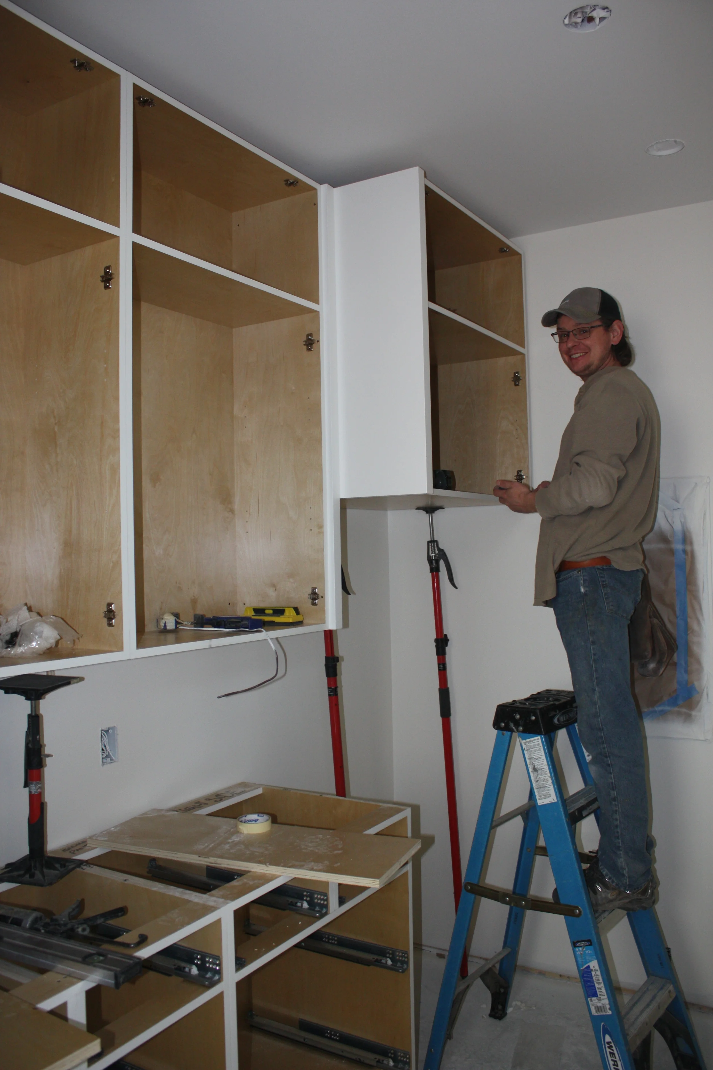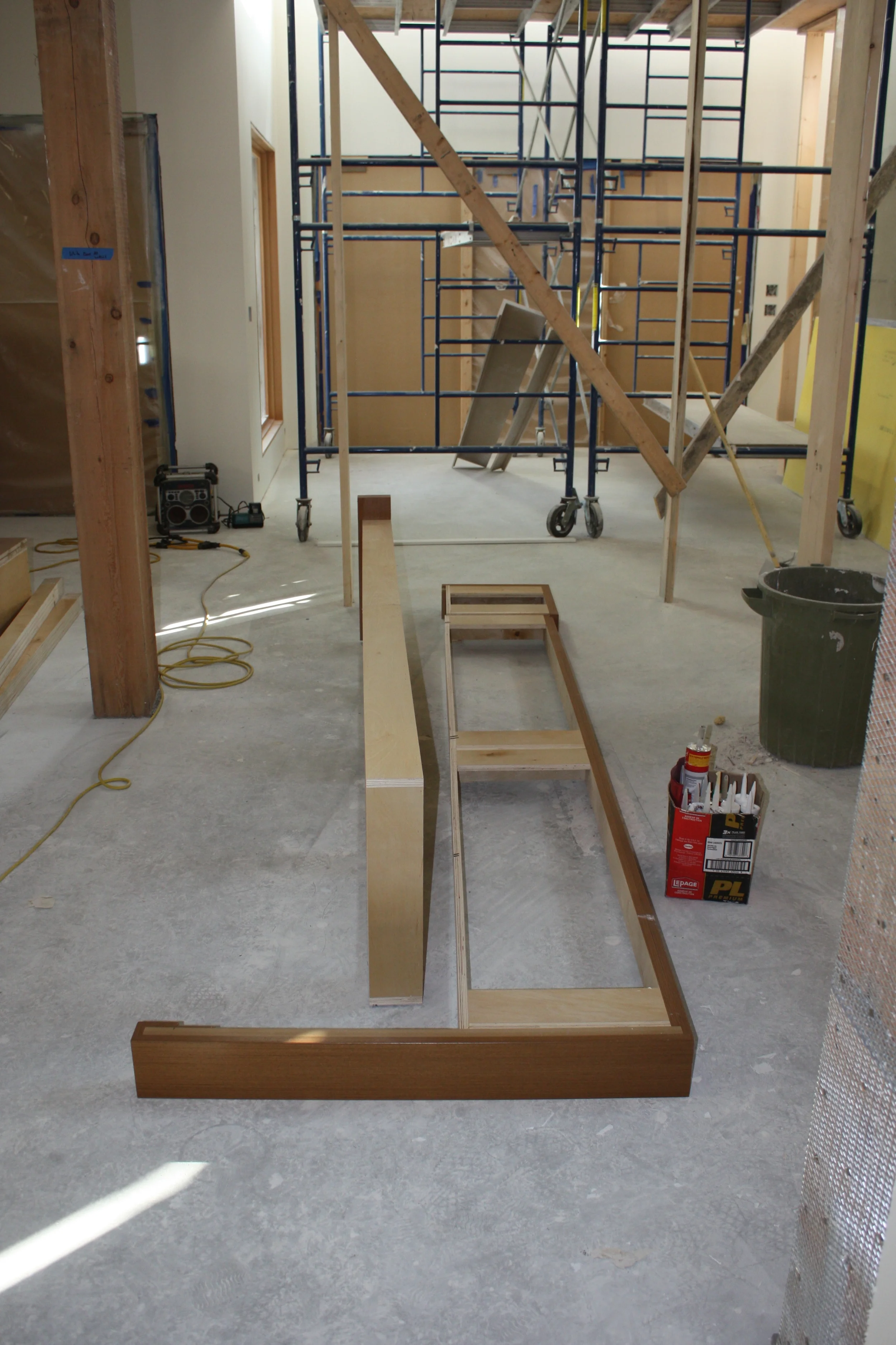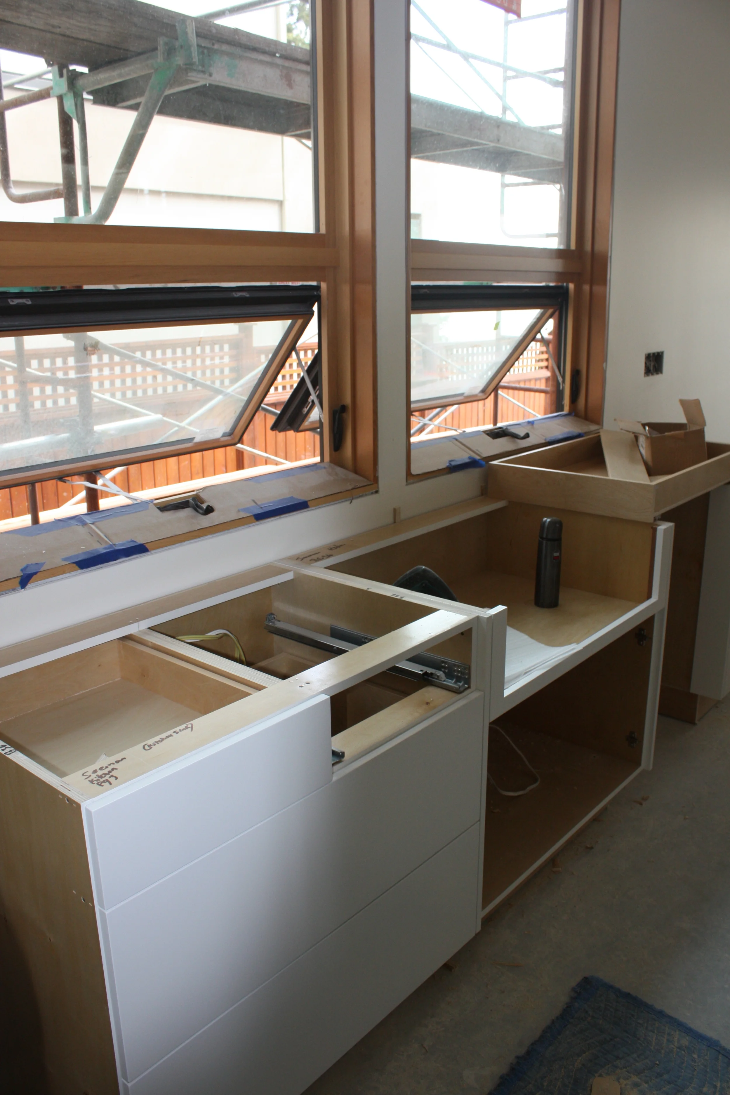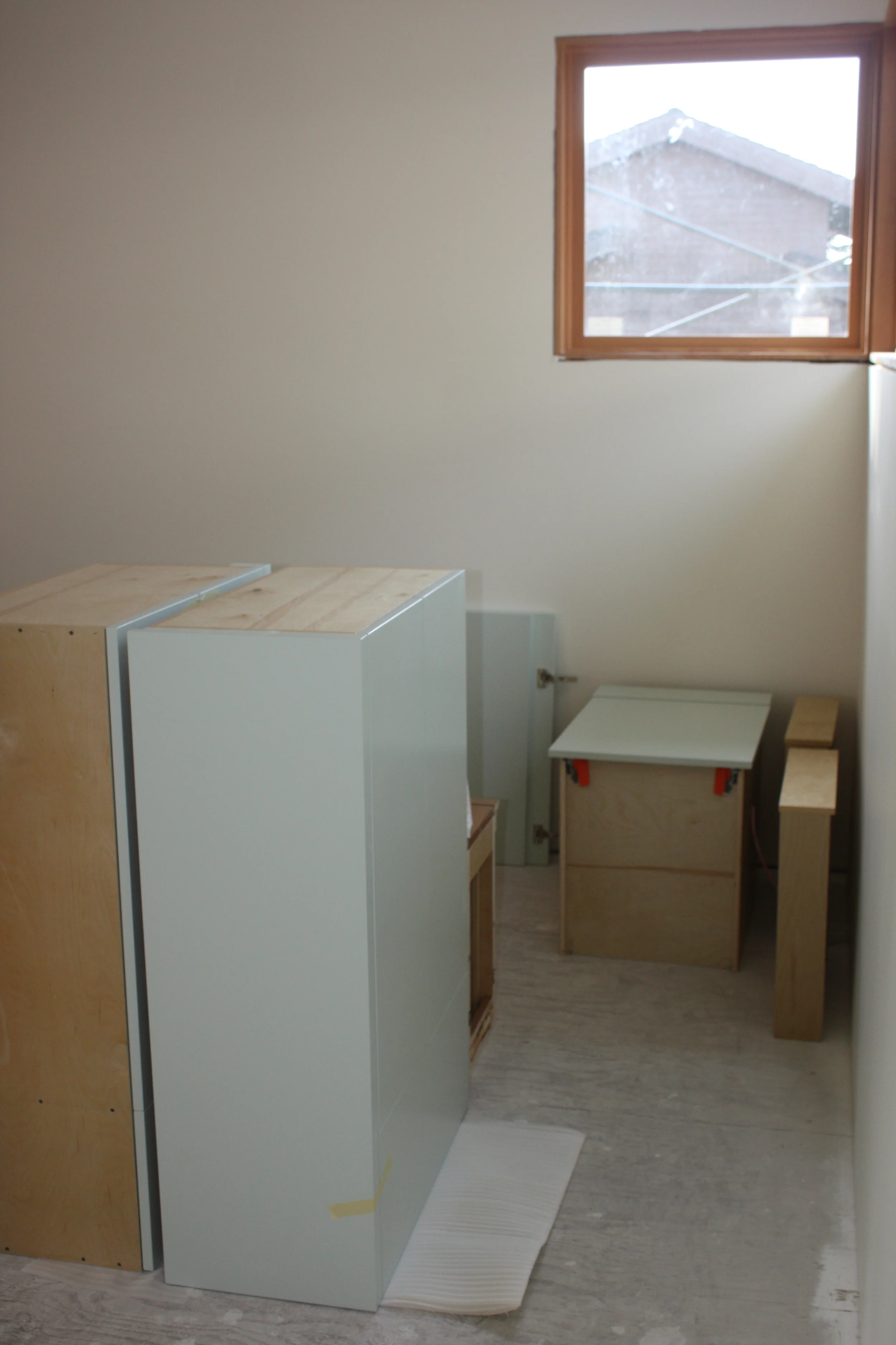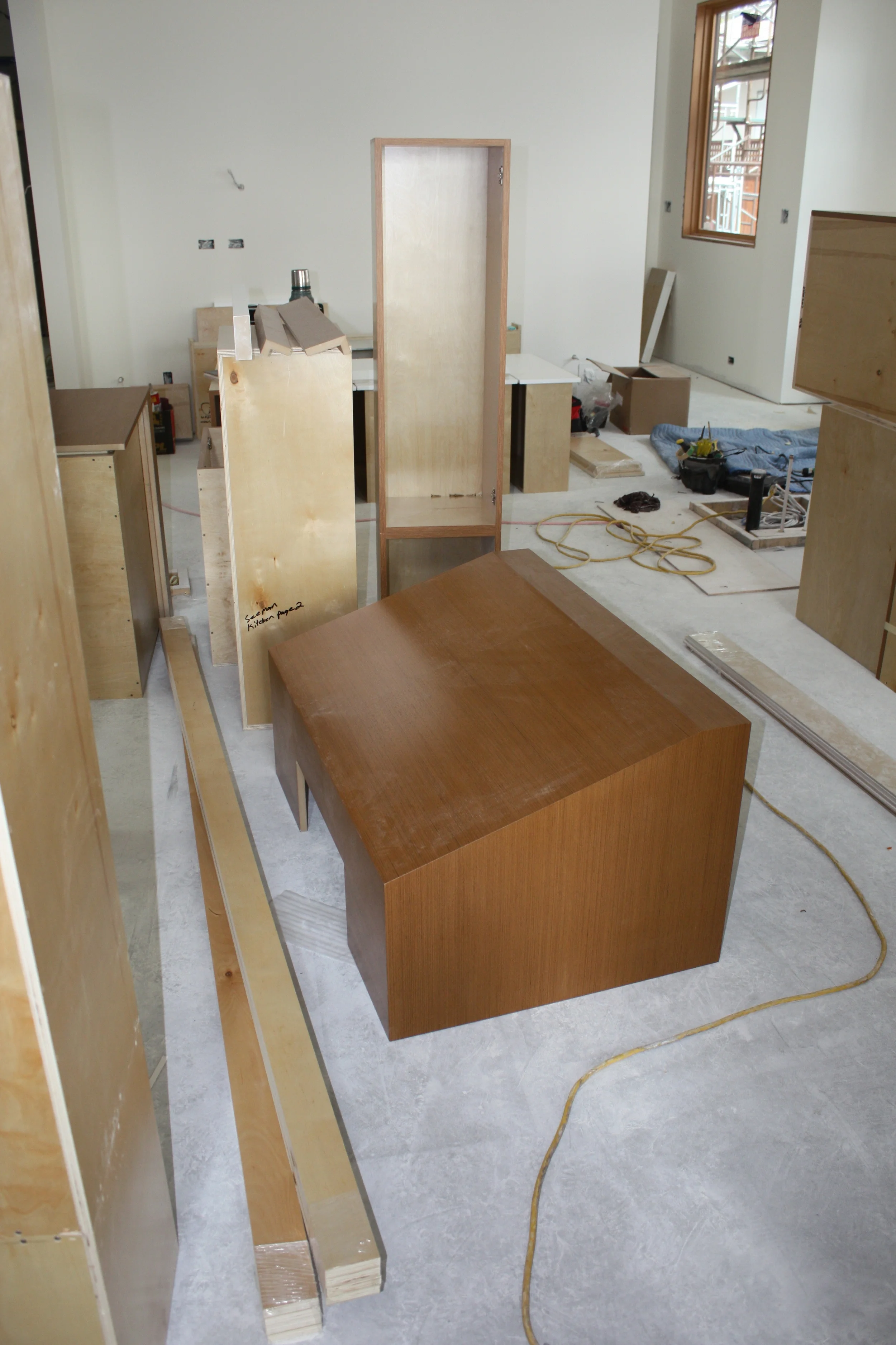 The cabinets are the first 'finishings' that are installed. There are lots of cabinets, and they fill the dining room, mudroom, etc. waiting to be sorted, measured and set into place. Geoff Hobson's crew are efficient and precise. I am told this process can take weeks, and my patience needs to match their attention to detail and careful pace.