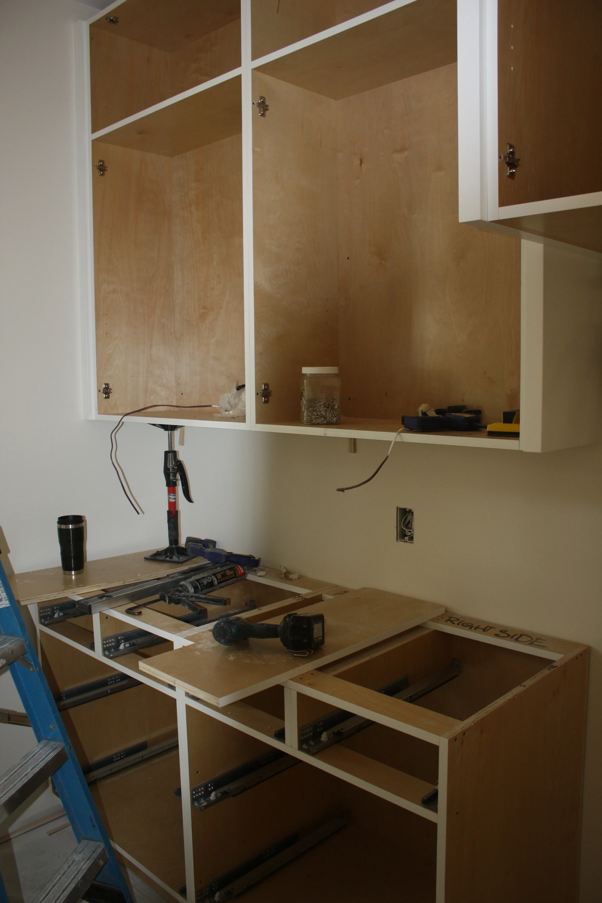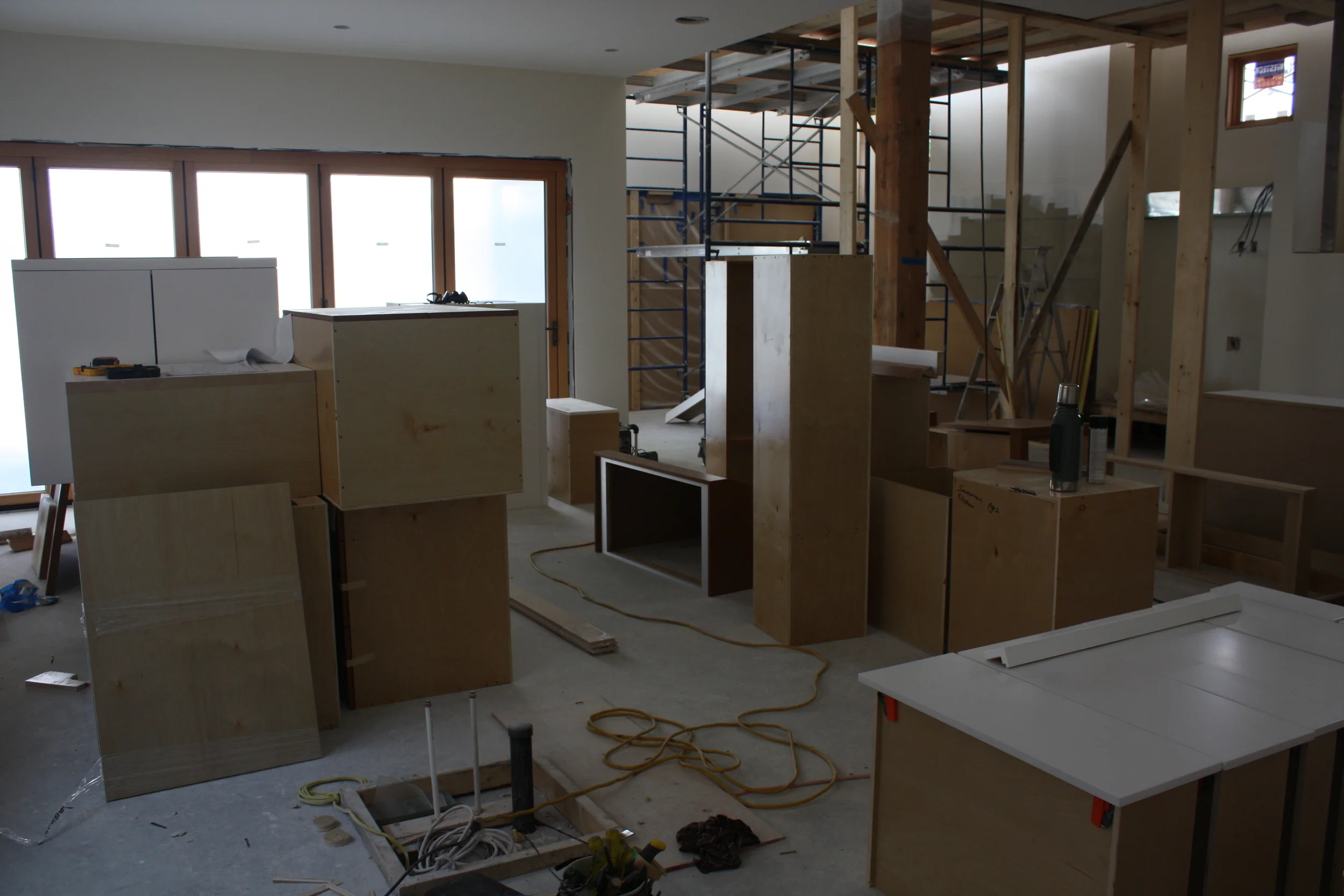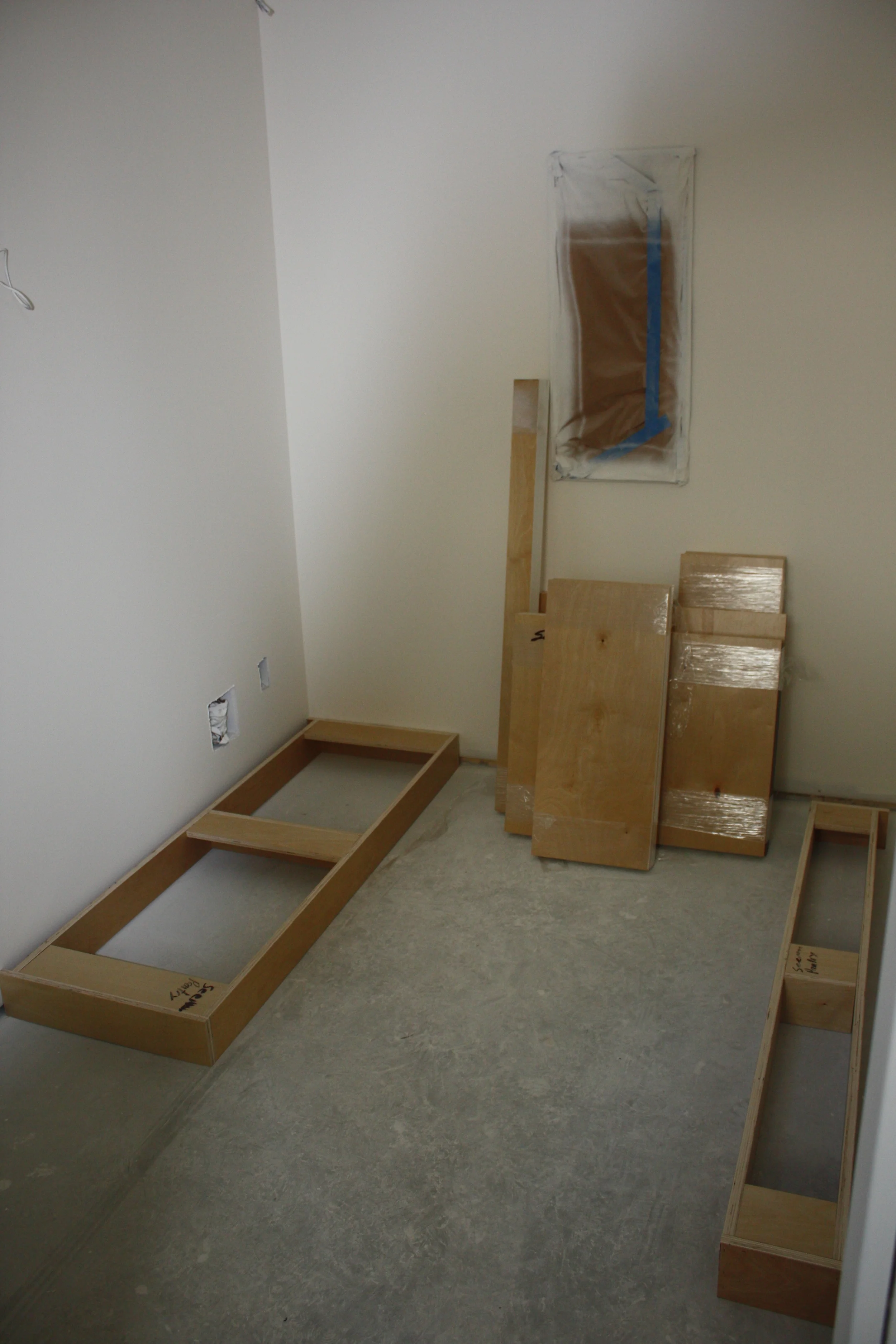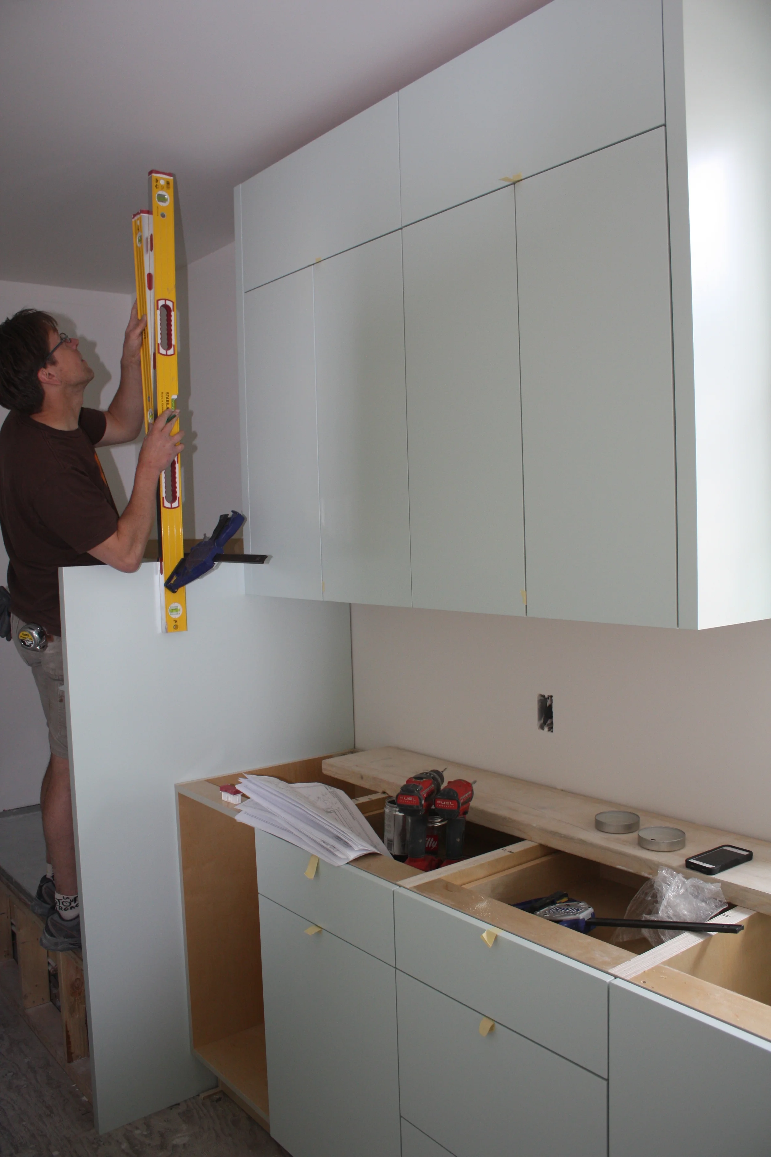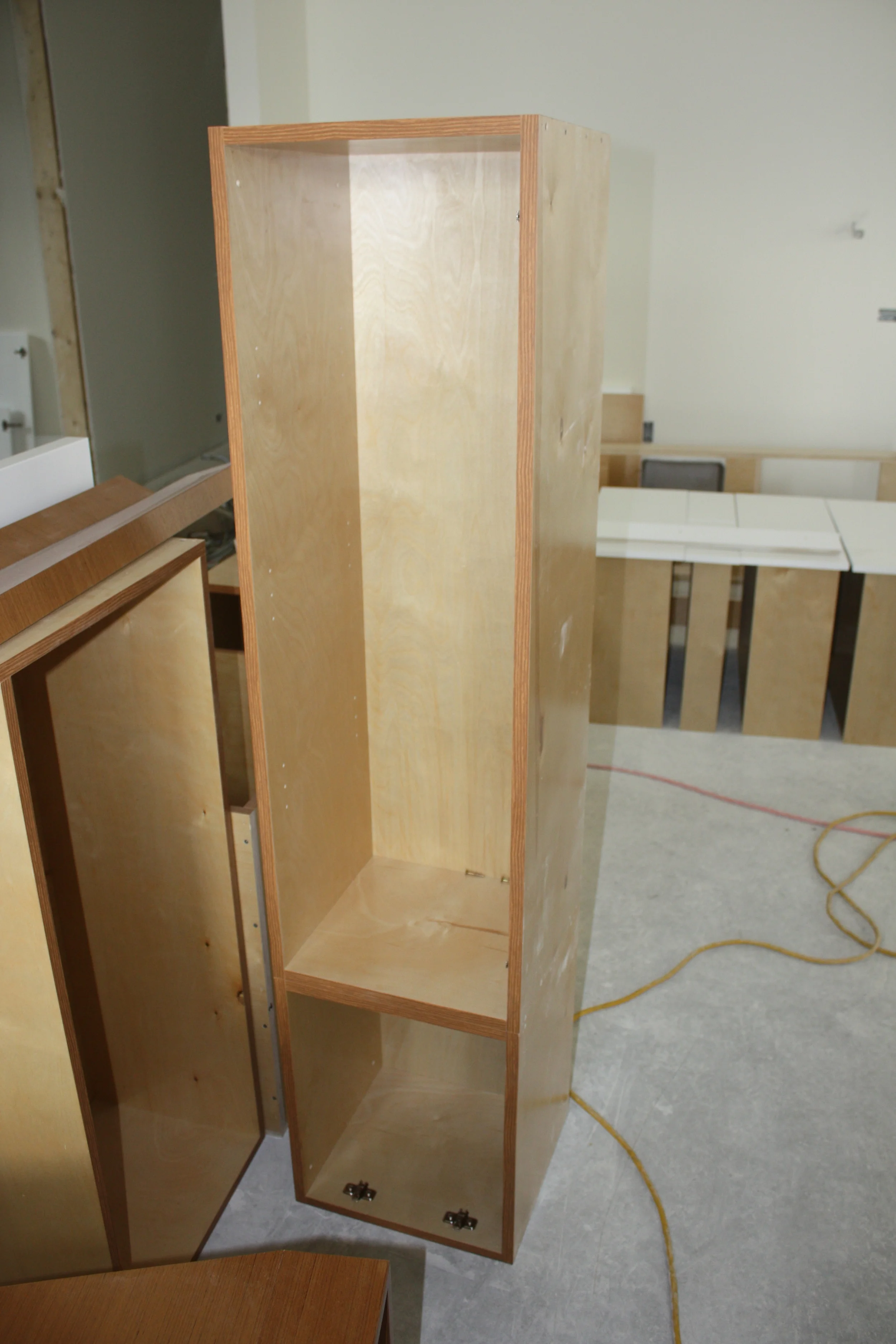 The cabinets are the first 'finishings' that are installed. There are lots of cabinets, and they fill the dining room, mudroom, etc. waiting to be sorted, measured and set into place. Geoff Hobson's crew are efficient and precise. I am told this process can take weeks, and my patience needs to match their attention to detail and careful pace.