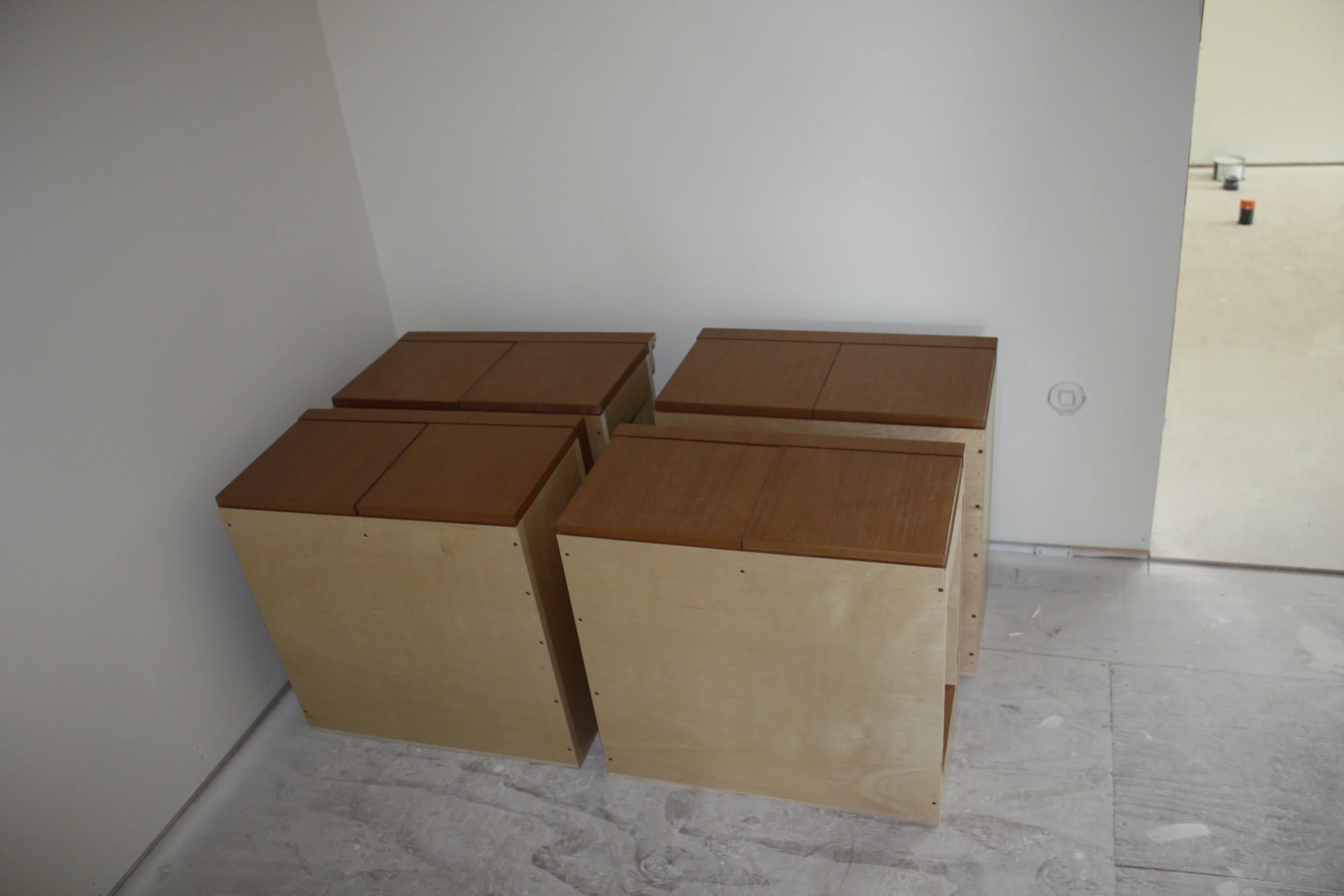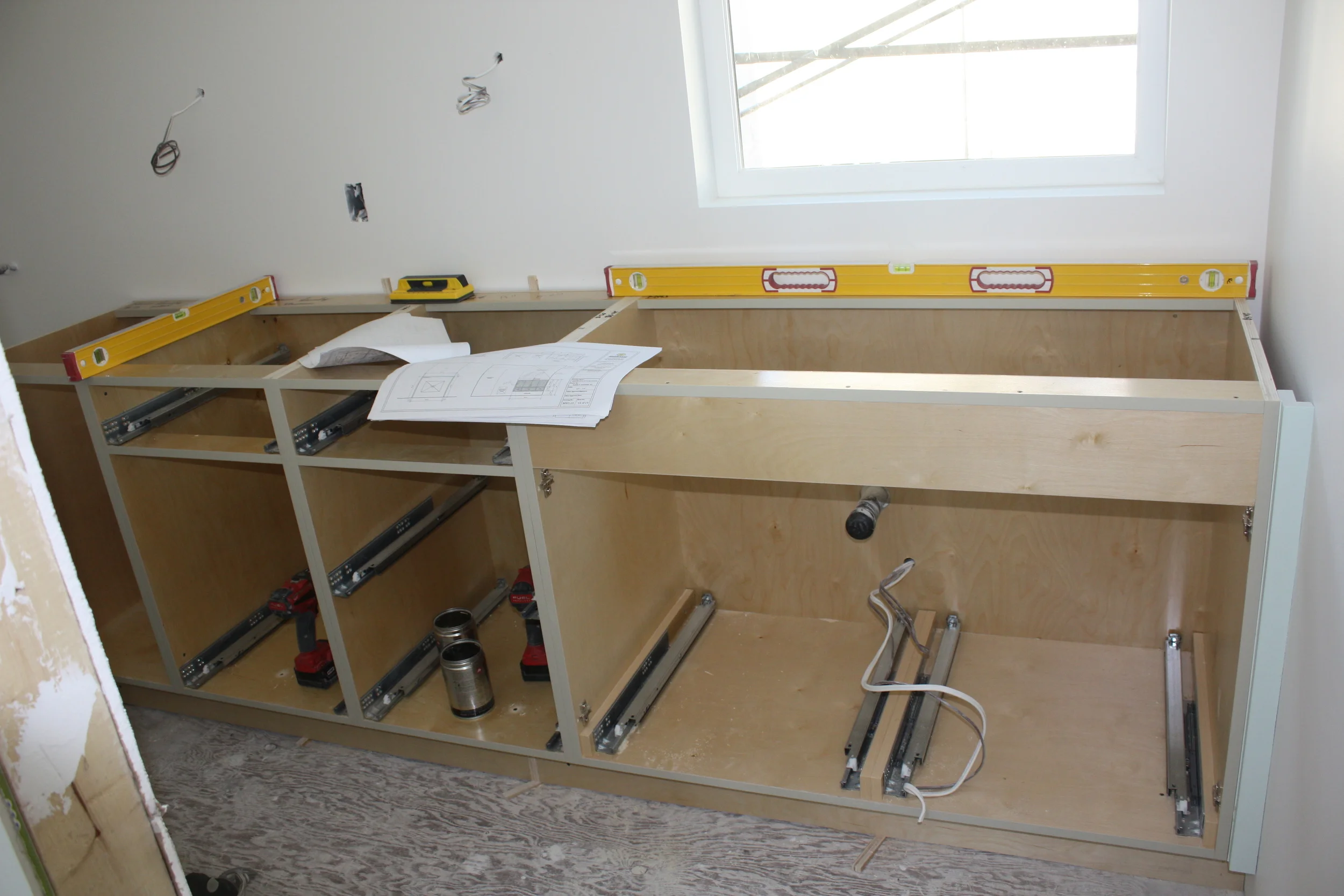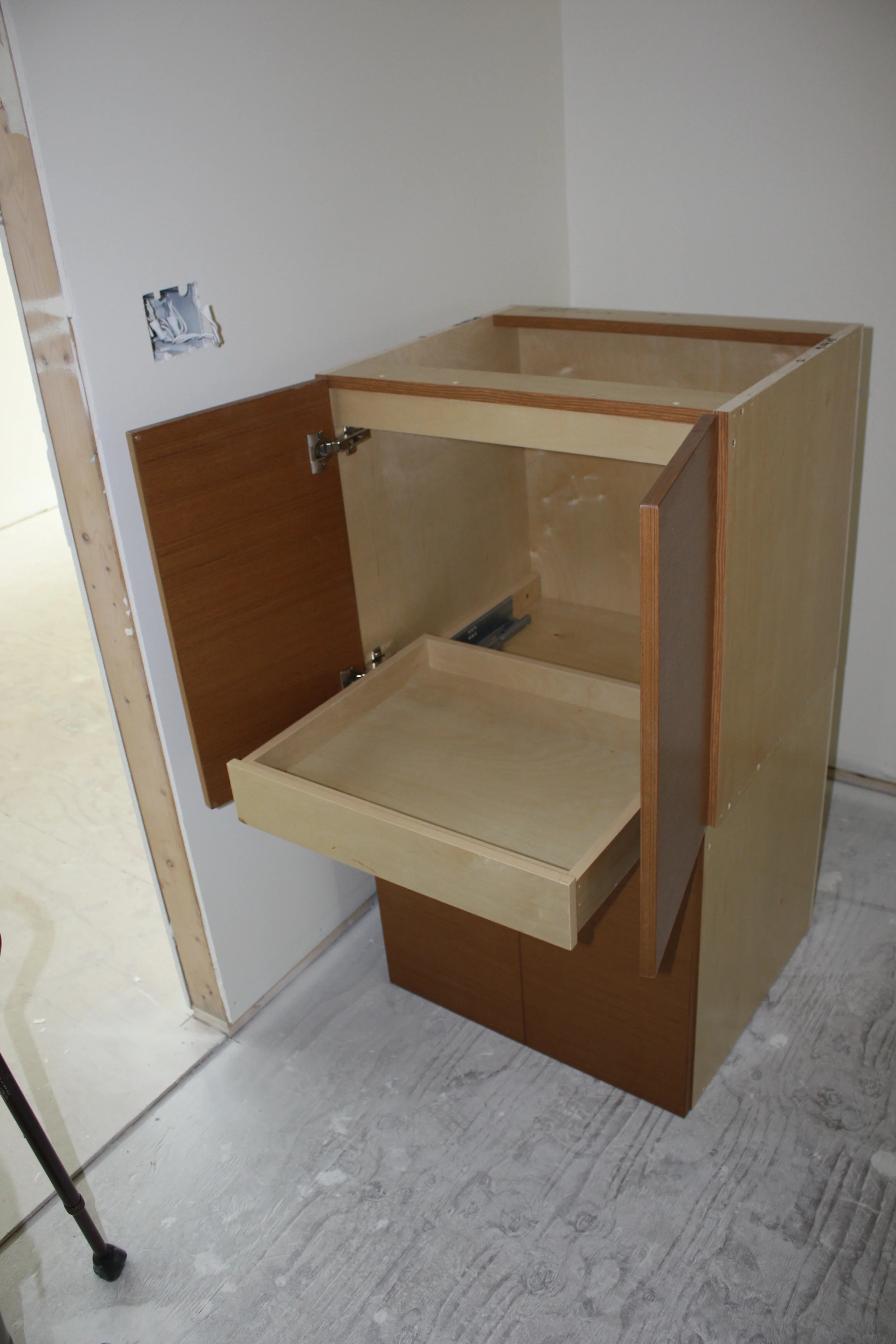 Lower cabinets for the ensuite vanities with roll-out drawers