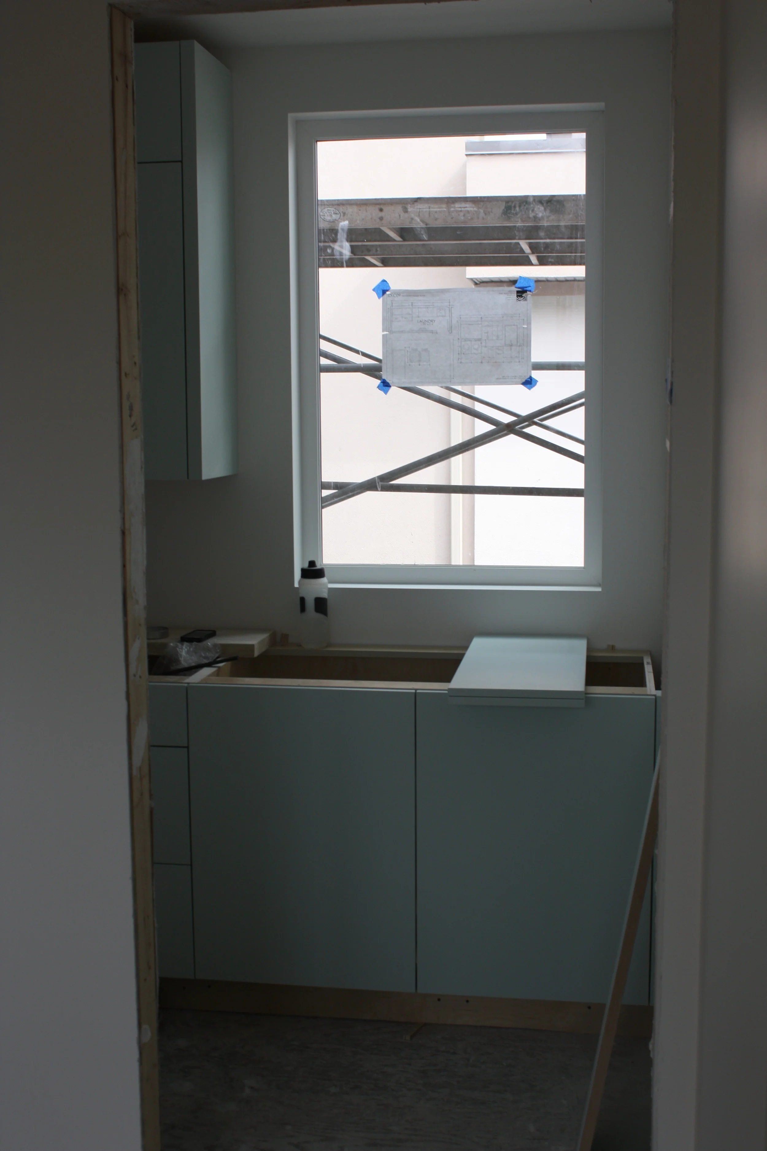 The East wall of the kitchen - will house the refrigerator (on the left), dishwasher and sink.