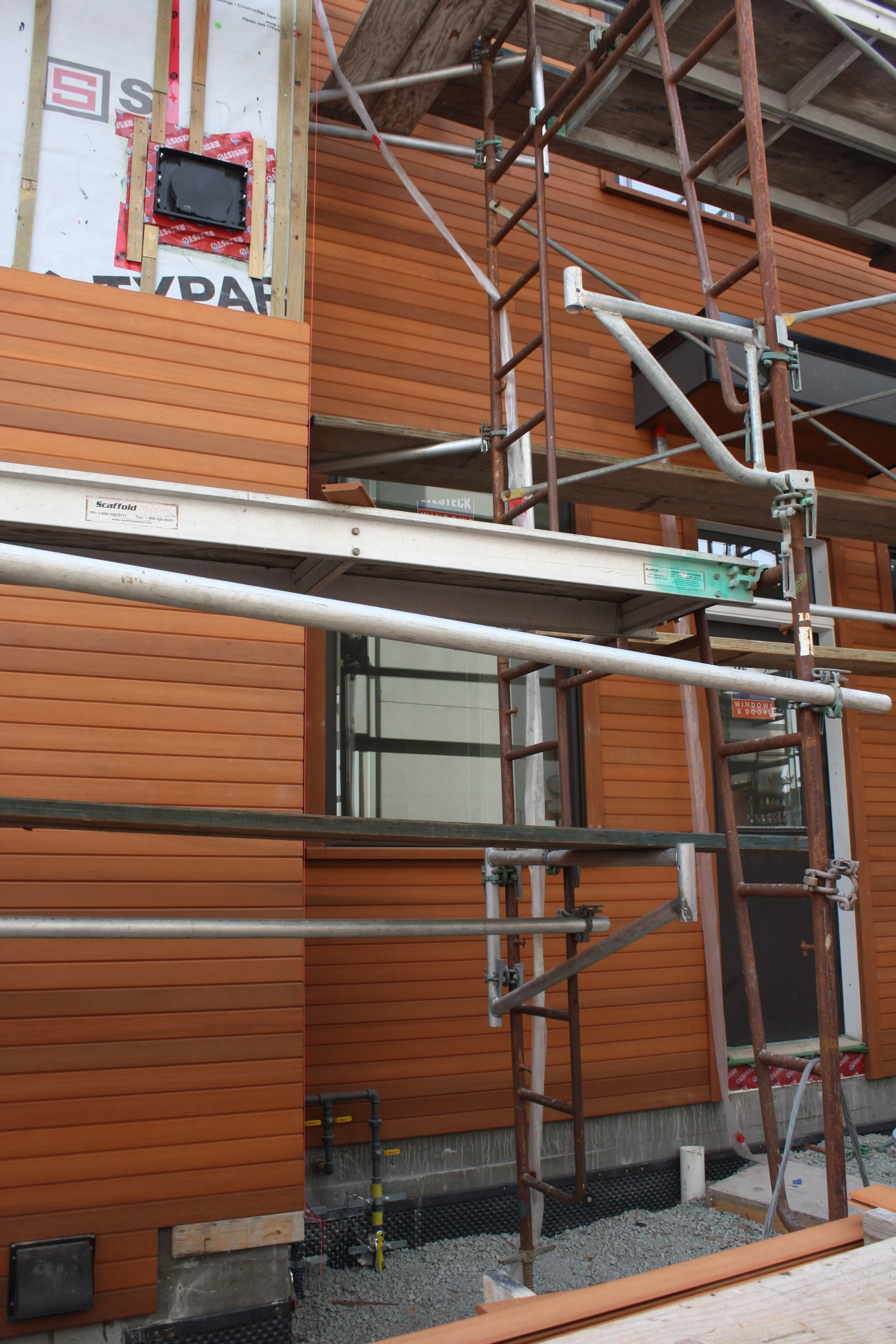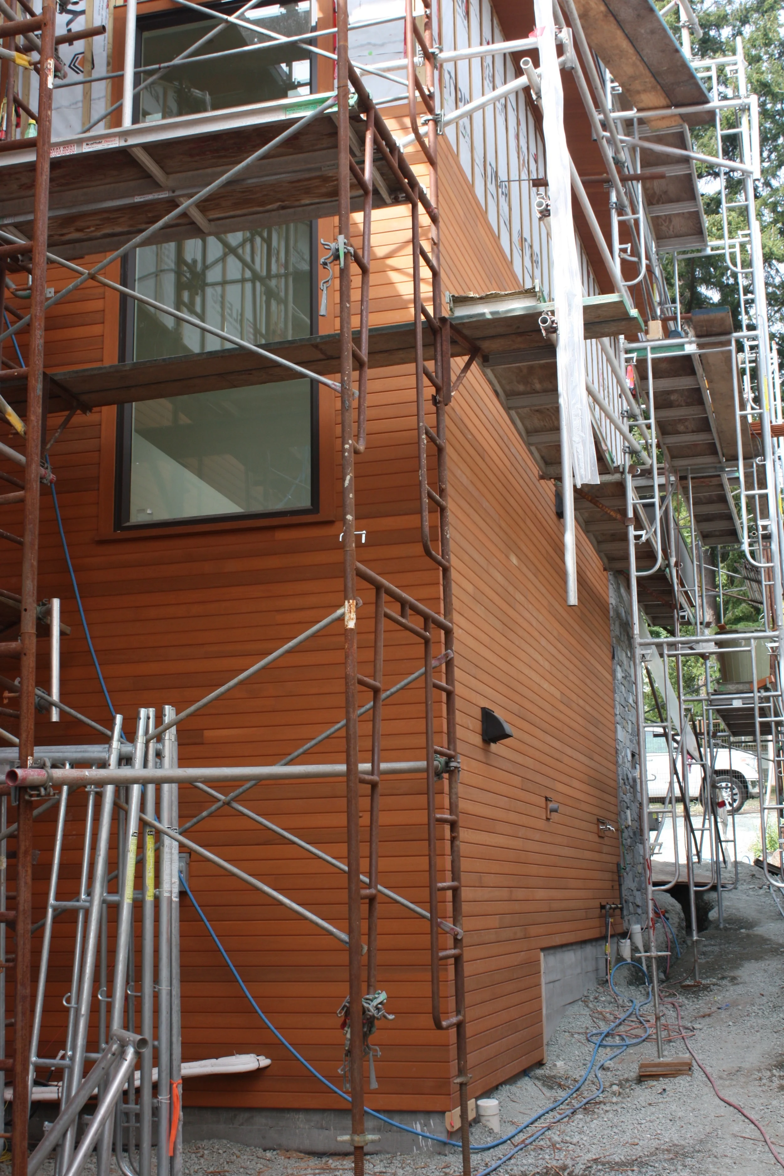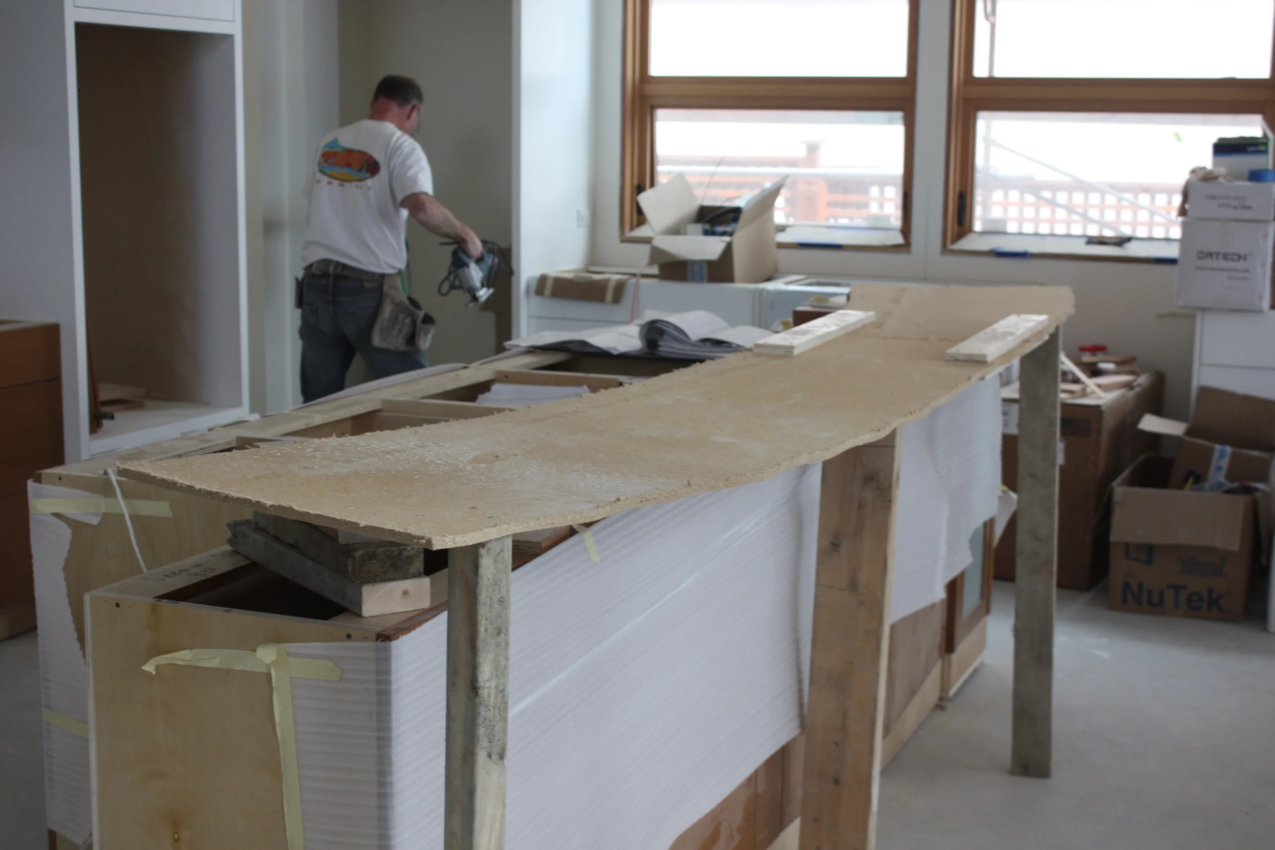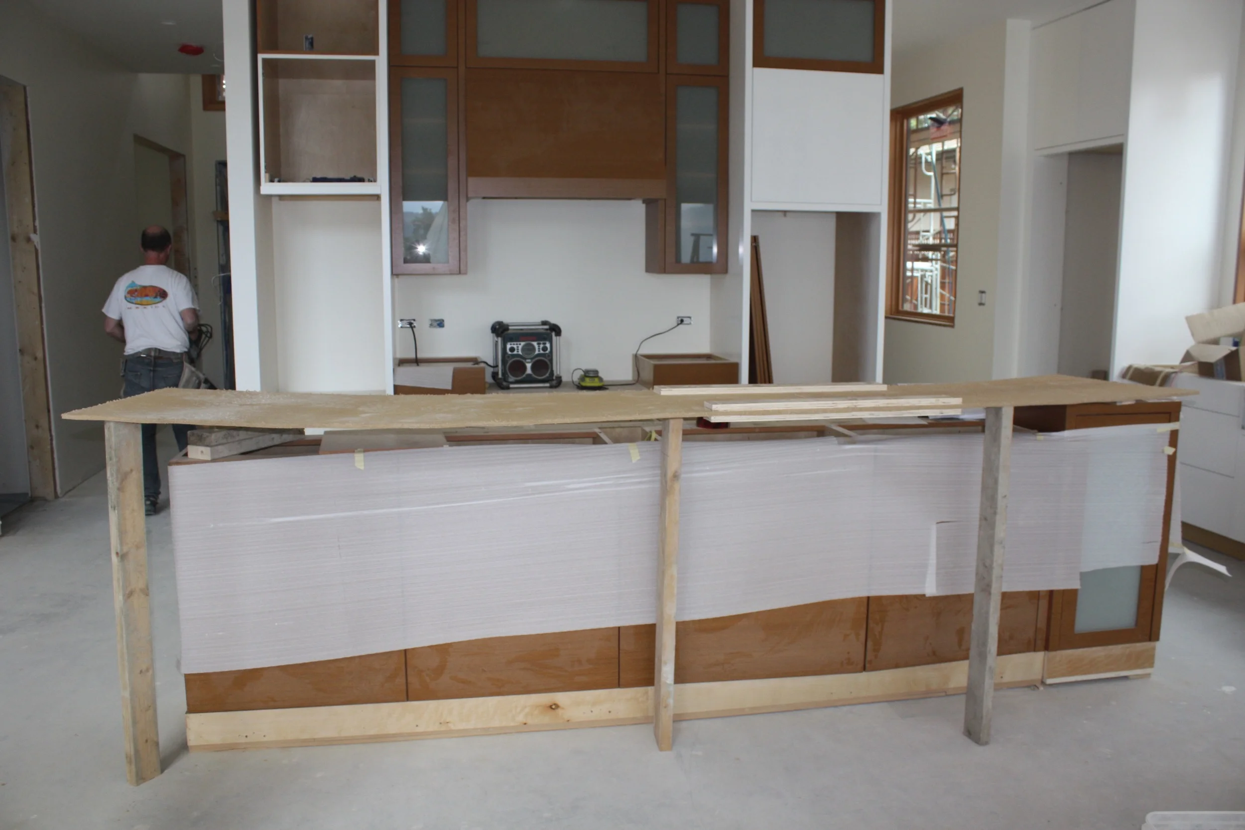 May 19: It continues to be a quiet week on the build - no tile or cabinet installers onsite. Paul has cut a template the size of our bar over the counter. It is a large piece, and we spent some time positioning it on the island. I think we finally got there. Outside the siding is going up well, the carpenters have made some significant progress in the last couple of days.