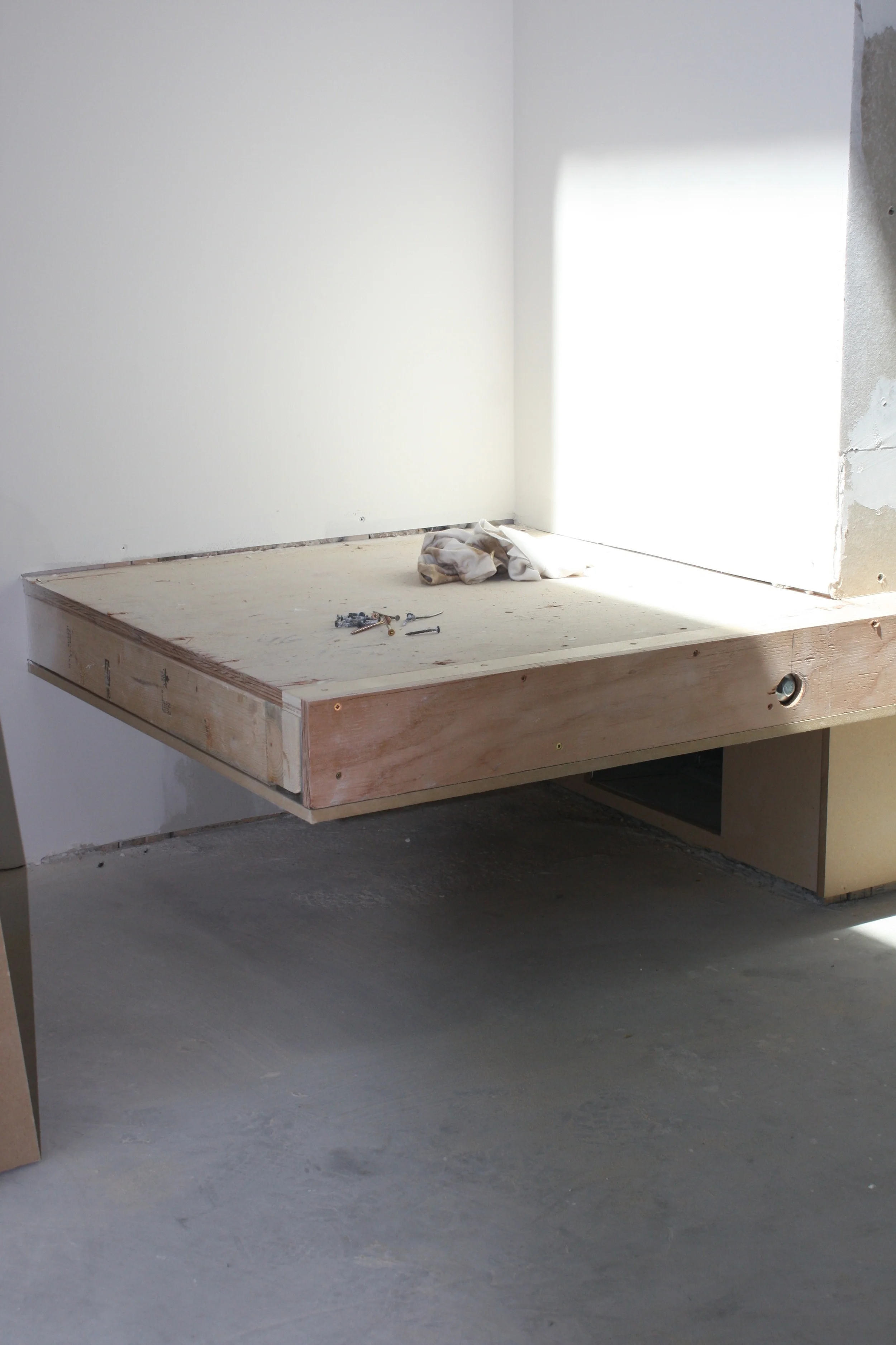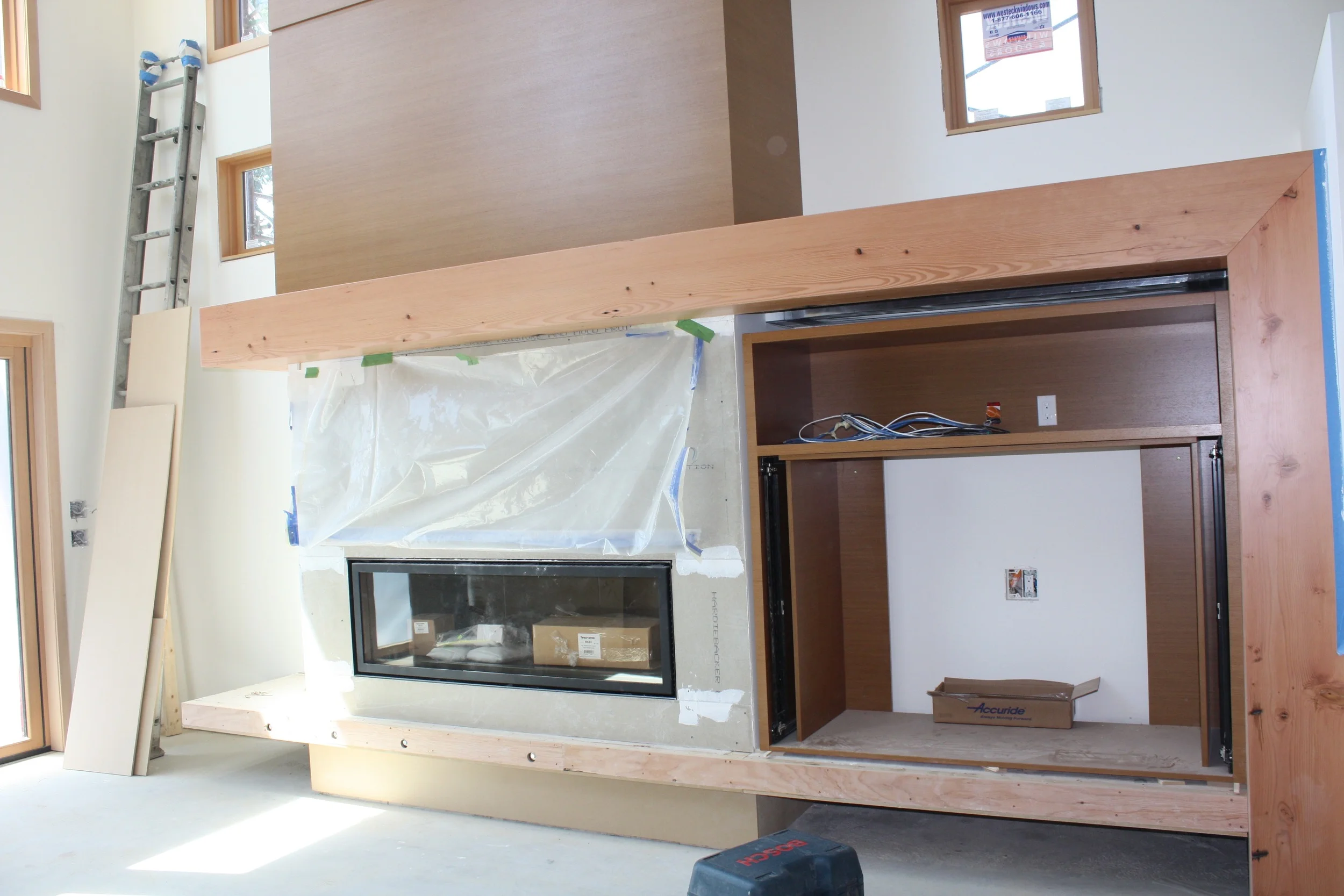 Fireplace and mantel without the scaffolding. The porcelain product Neolith, in a grey/black colour will be applied to the front of the fireplace and below the fireplace opening under the hearth. We were hoping for a completely floating hearth, but we needed to support our very heavy fireplace.... I can live with that.