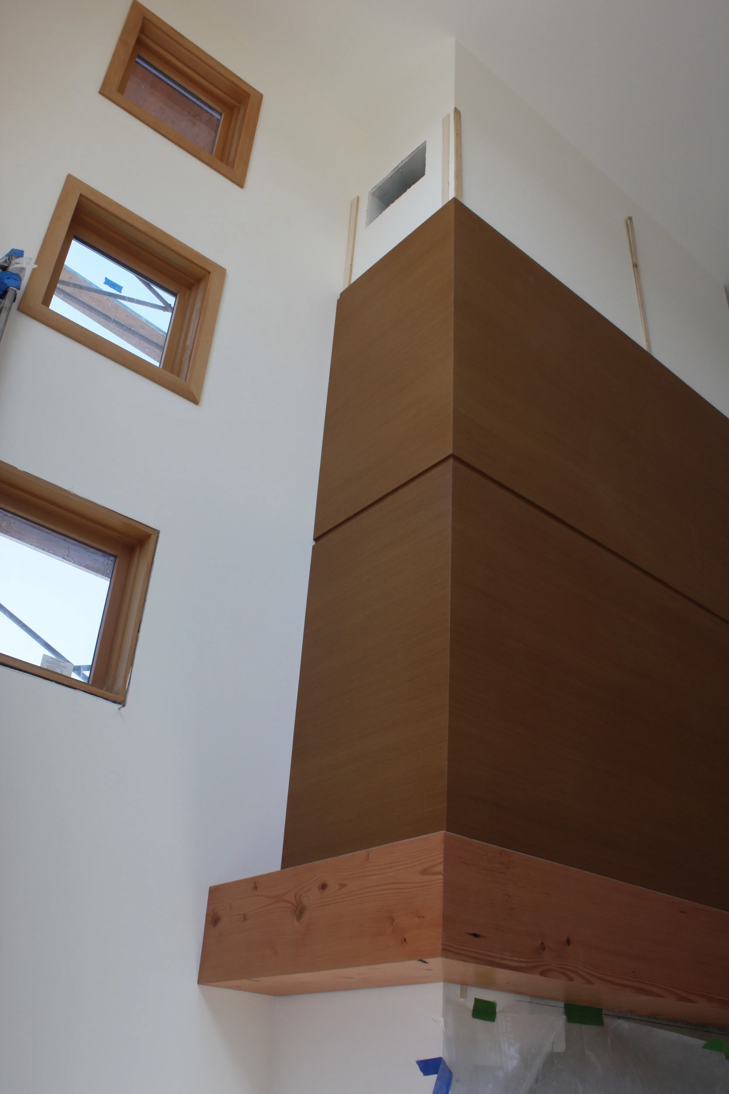 The air return vent for the great room is at the top of the fireplace on the South side. Generally, it will not be seen........ The third piece of teak facade will be applied on the top next week.