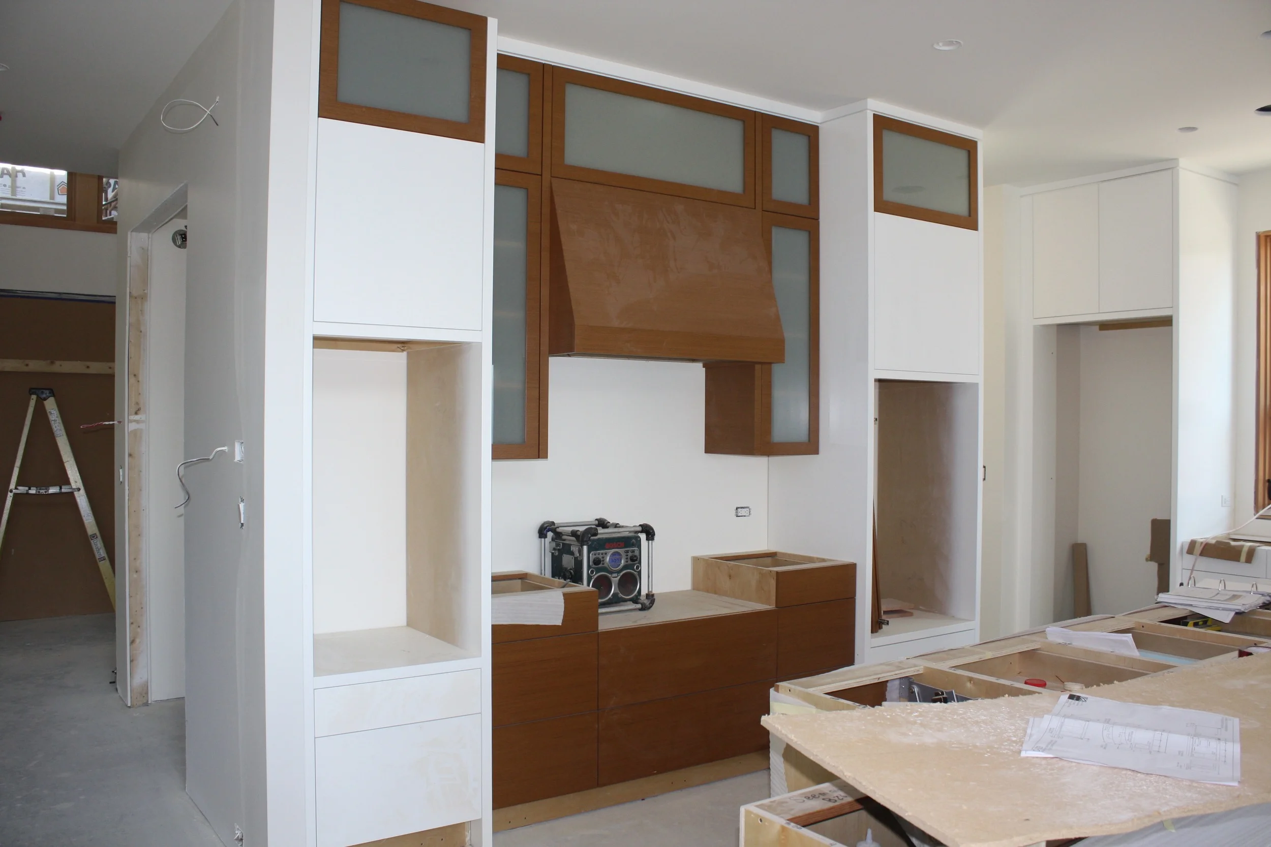 South wall of the kitchen with the final column complete. I am very happy with the blend of white and teak.... It is fresh and warm. Appliances will arrive early June....