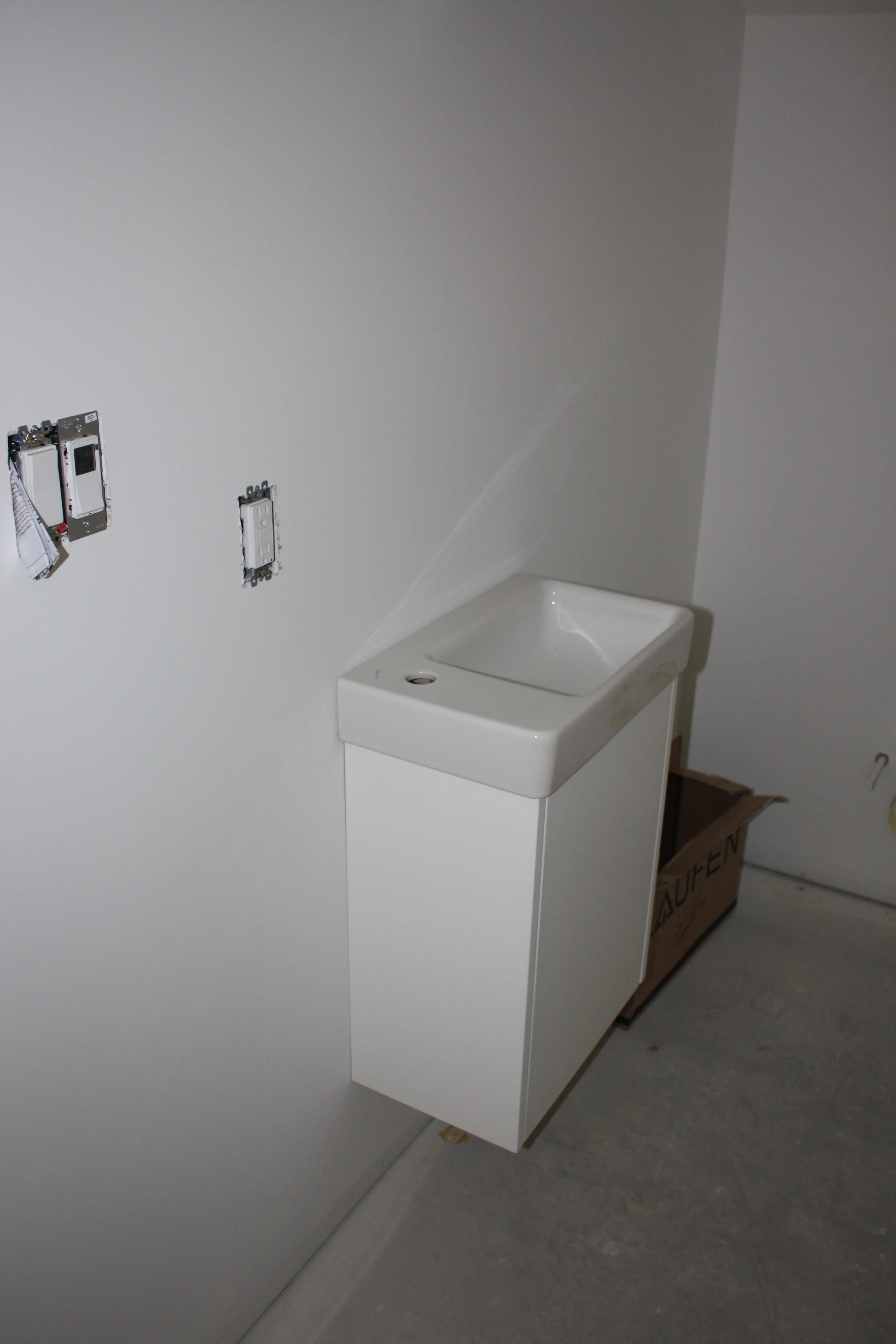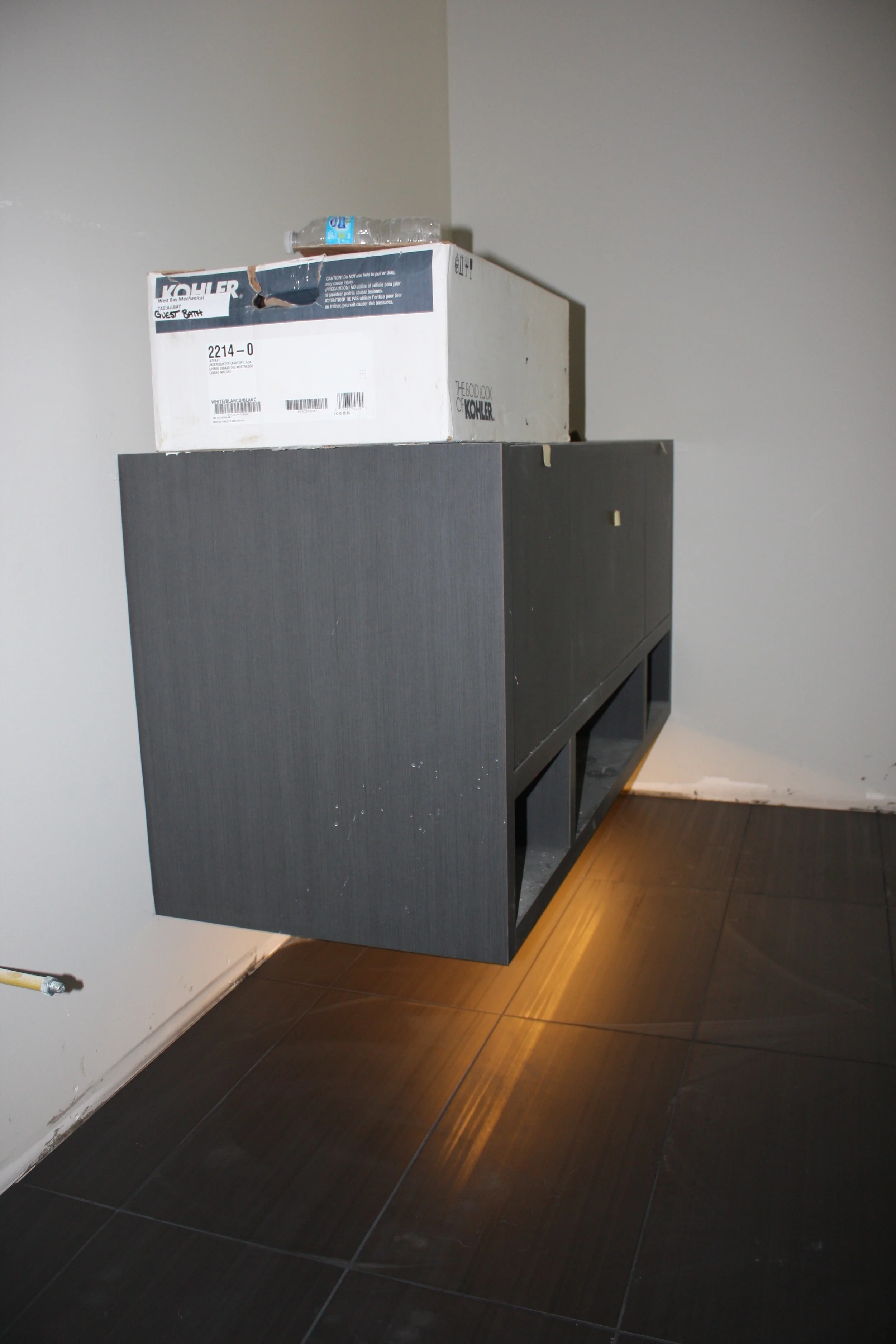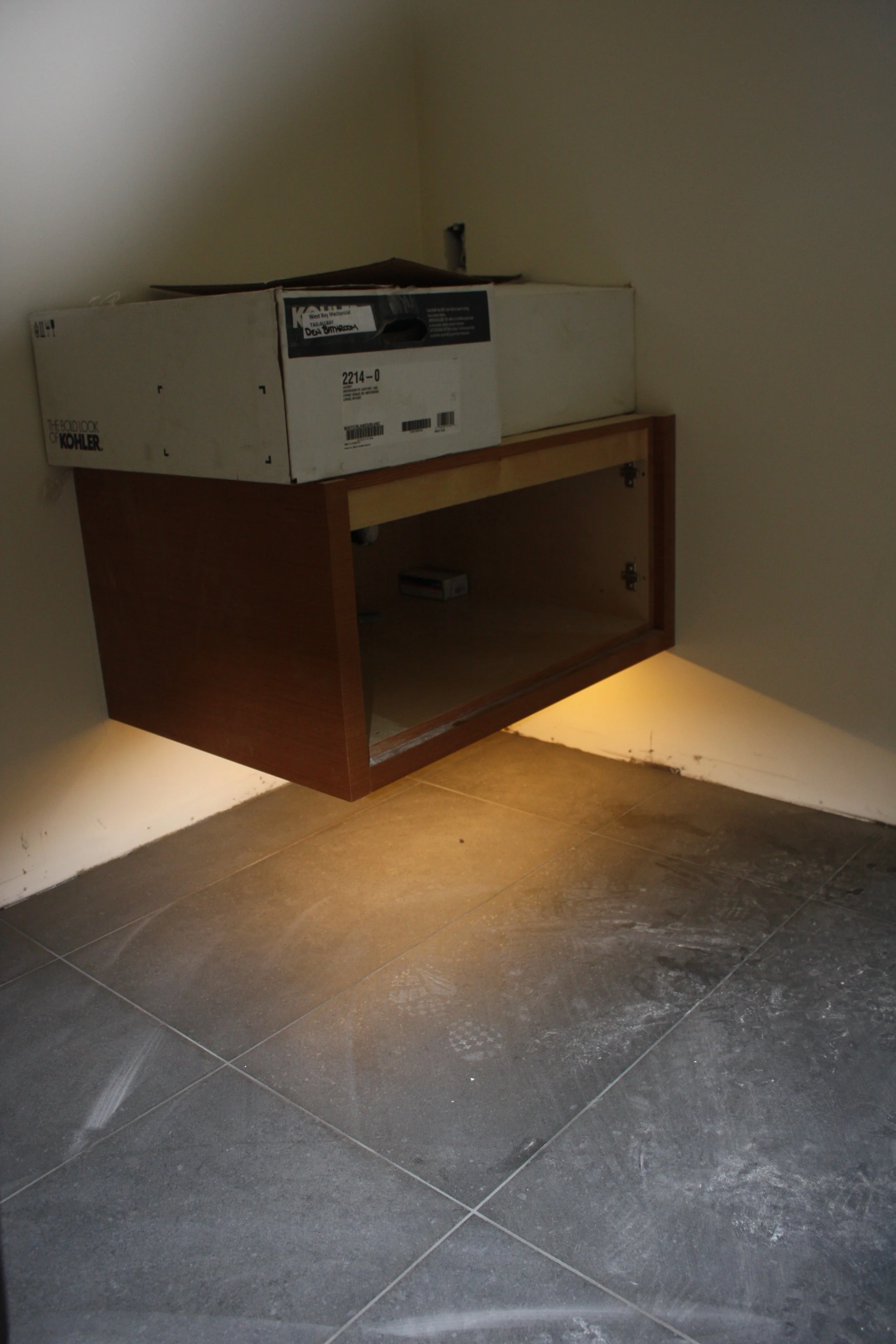Floating vanity in the guest suite - all the under vanity lights are turned on with a motion sensor.