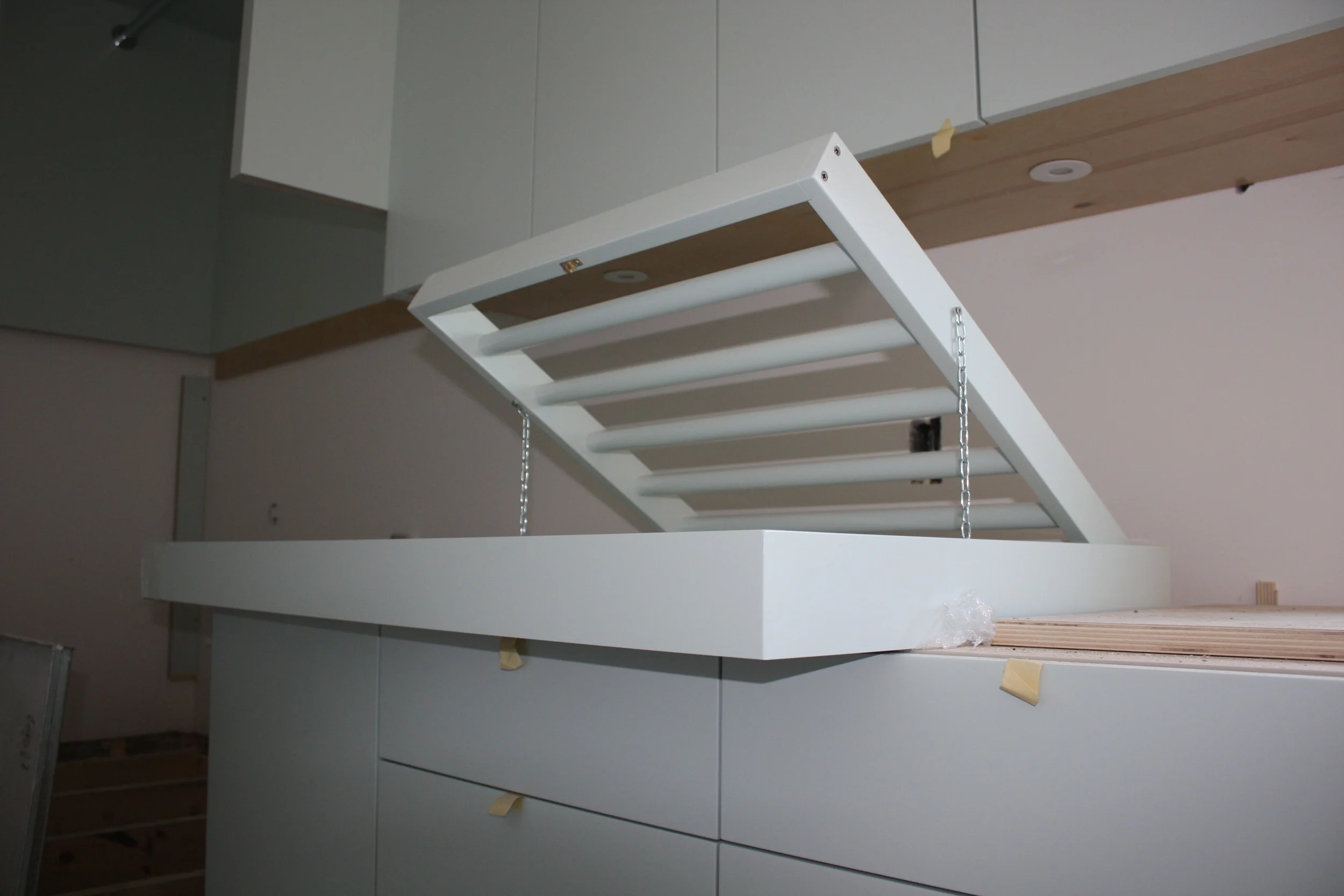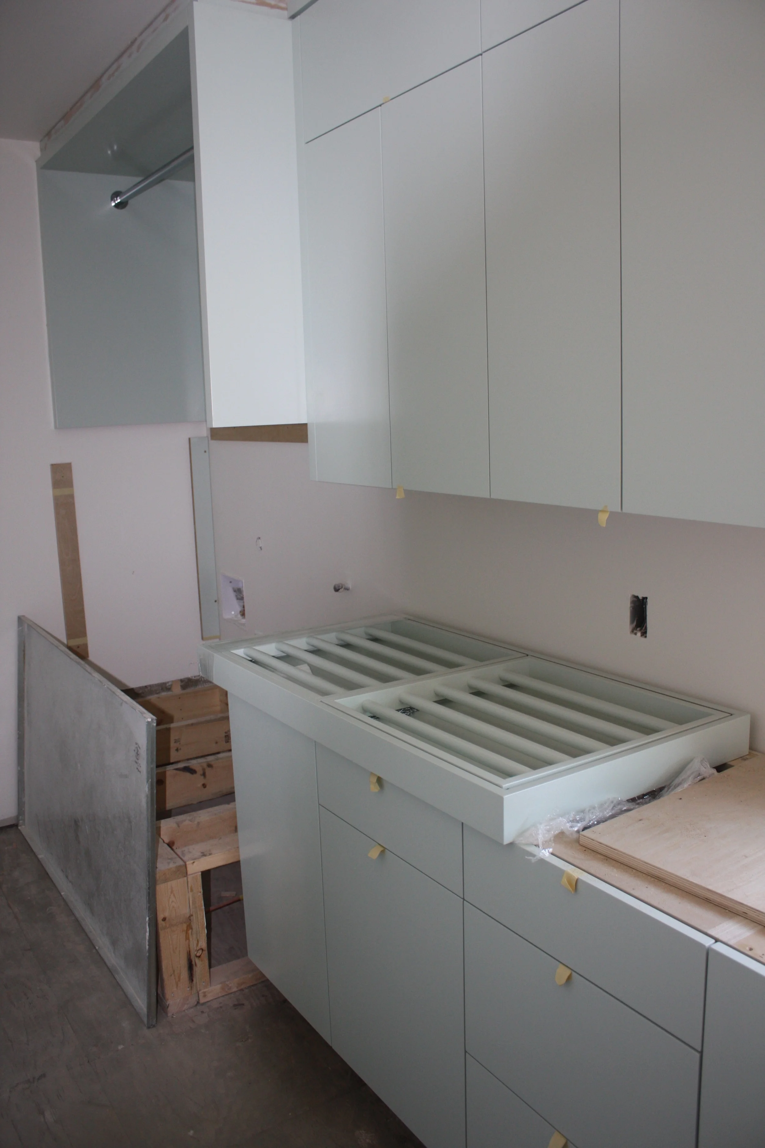 The drying racks, sitting here on the counter, will be mounted on the opposite wall.