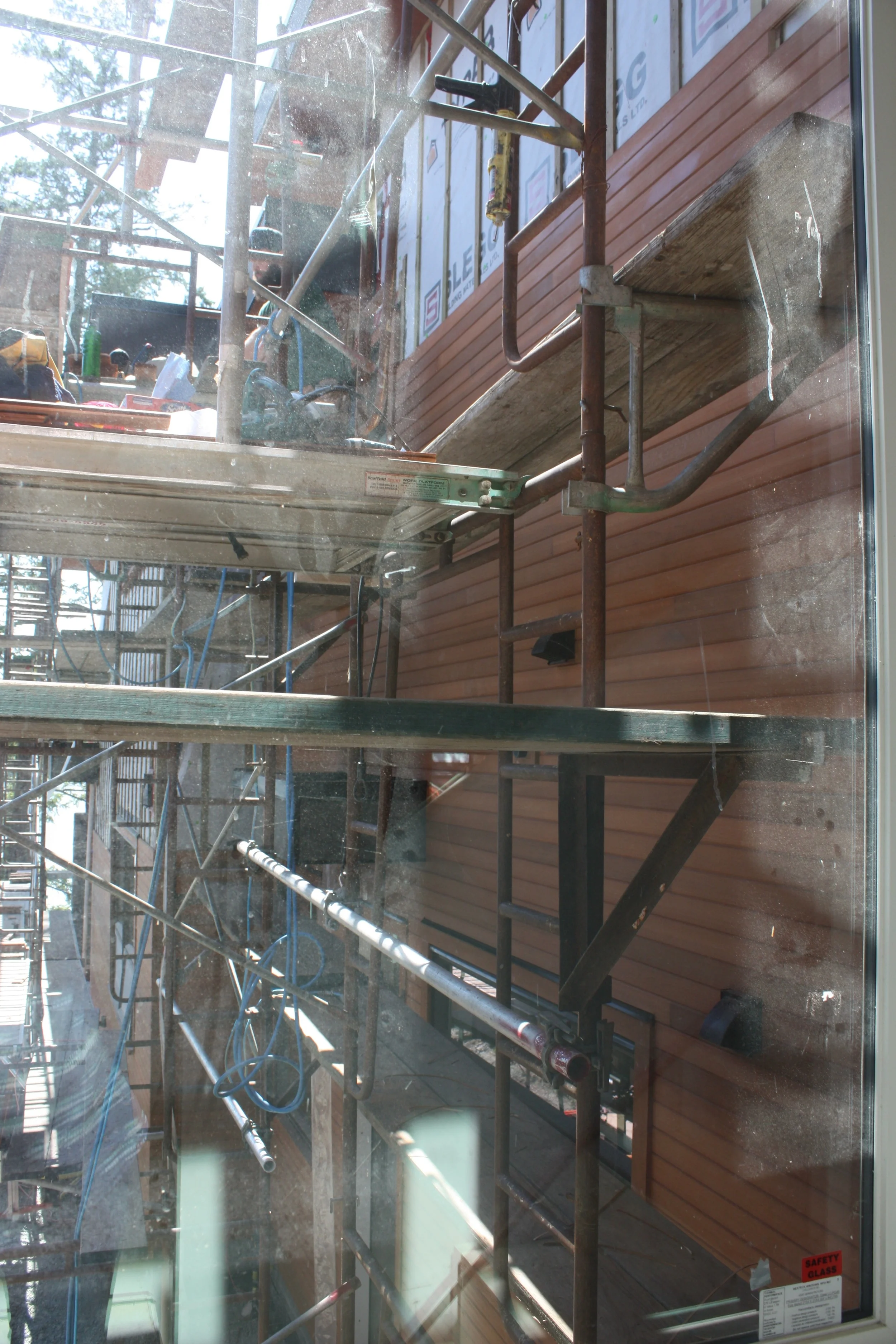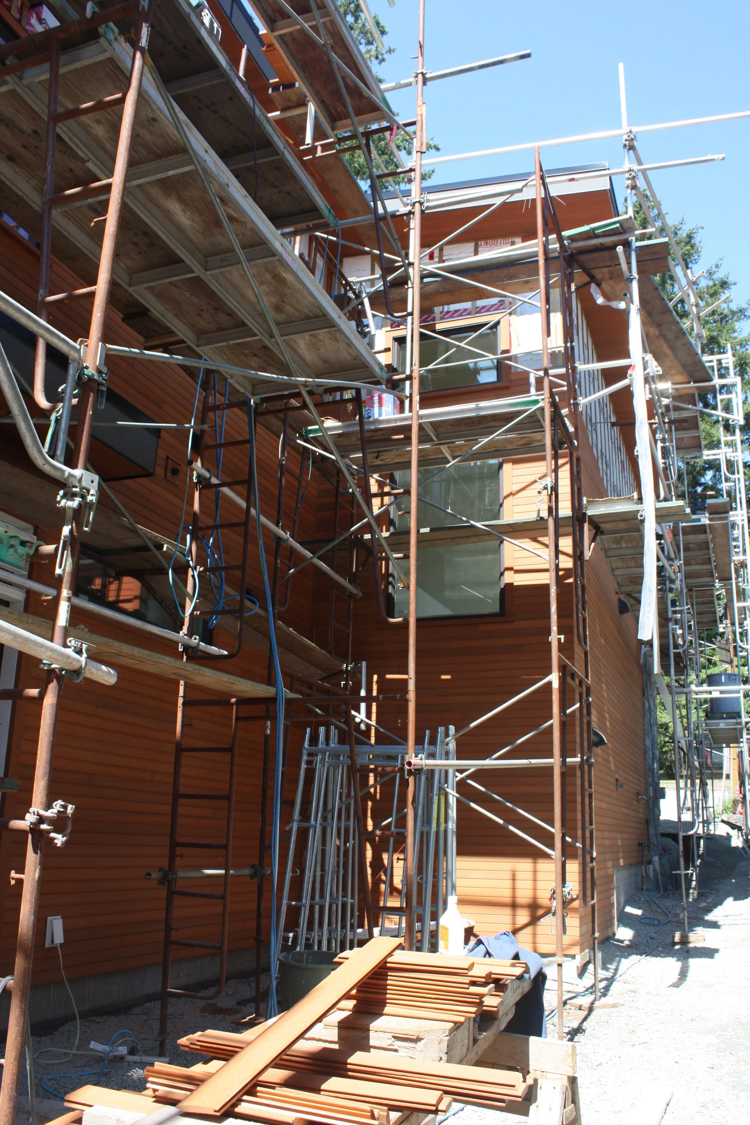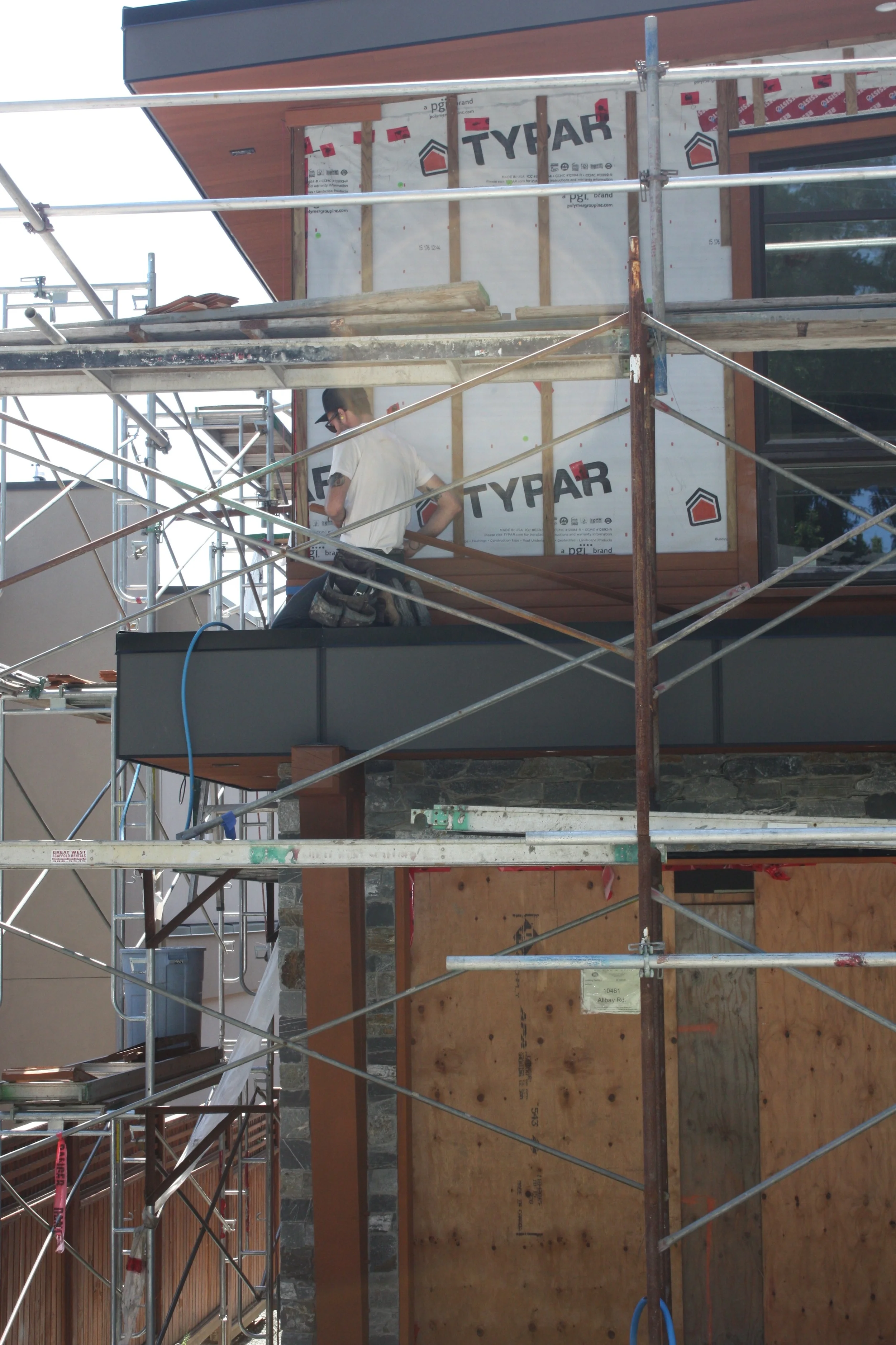 May 20: To celebrate my Aunt and Uncle's 40th wedding anniversary (YEAH), we had a wonderful dinner at the Sea Glass Restaurant, and then had a look at some new details in the house. The build has been fairly quiet this week; the mason finished up the interior rock wall on Wednesday, trim has been applied to most of the end grain fir windows (upper and lower floors), and the siding has continued to crawl up the East wall and round to the North wall above the garage. The street side of the house has been cleared up of garbage and stone (which has been distributed around the ocean side of the house for application on the patio wall) in preparation for gas hook up early next week. Oh - the garage doors should go in next week as well - cool!