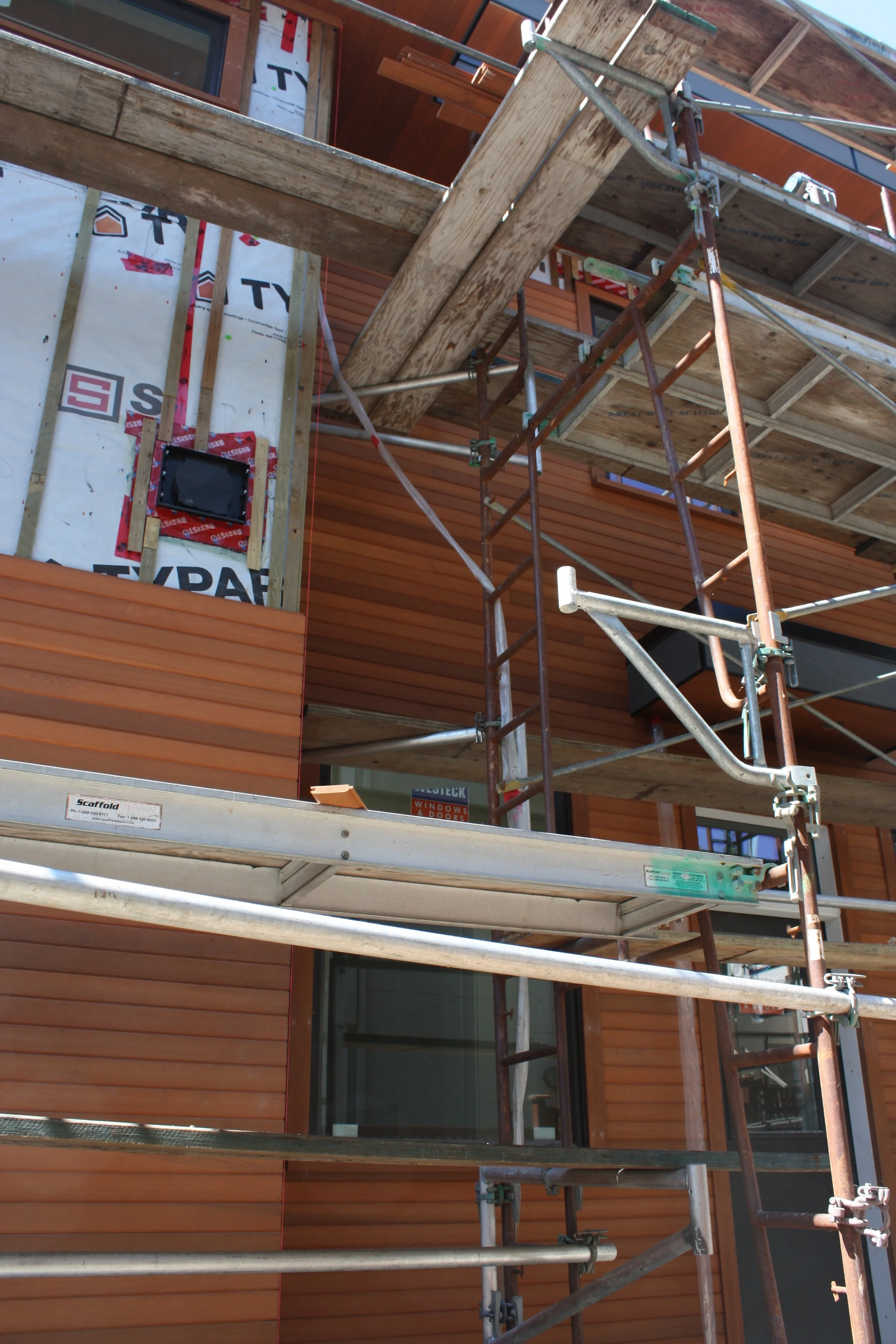 Jeremy installing siding on the street side of the house; another mitered corner.