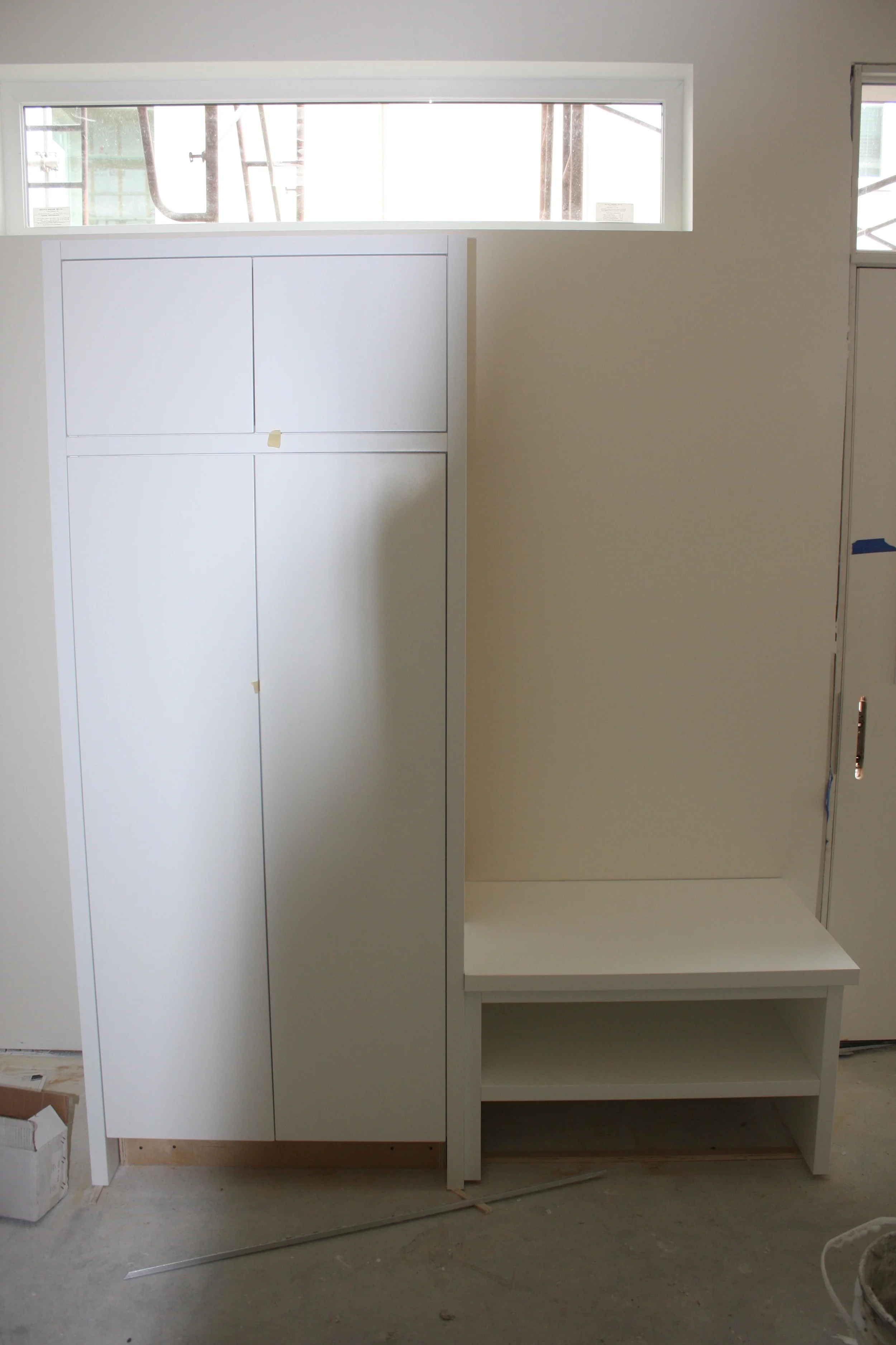 Mudroom cabinets in place..... this will be my cleaning cabinet, with a bench beside waiting for a quilted cushion.