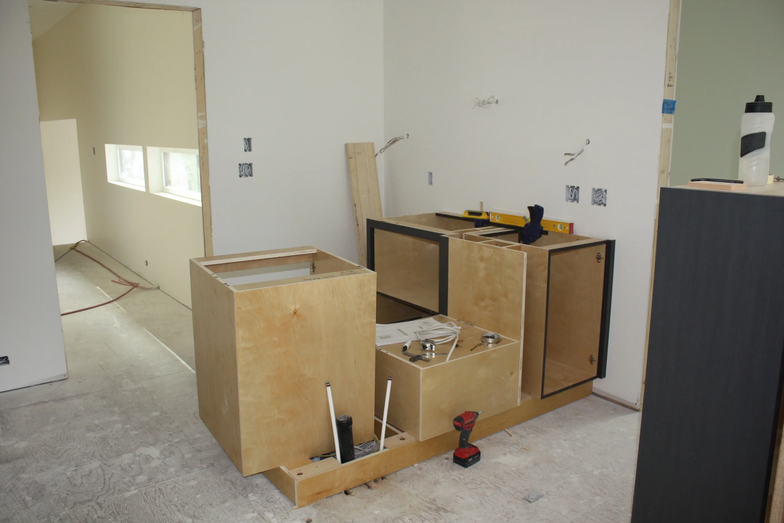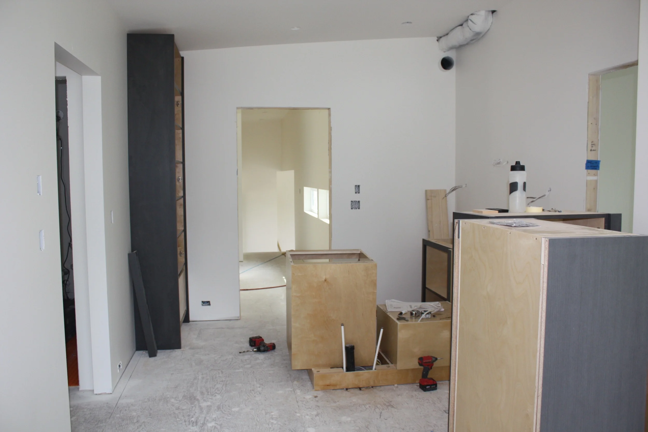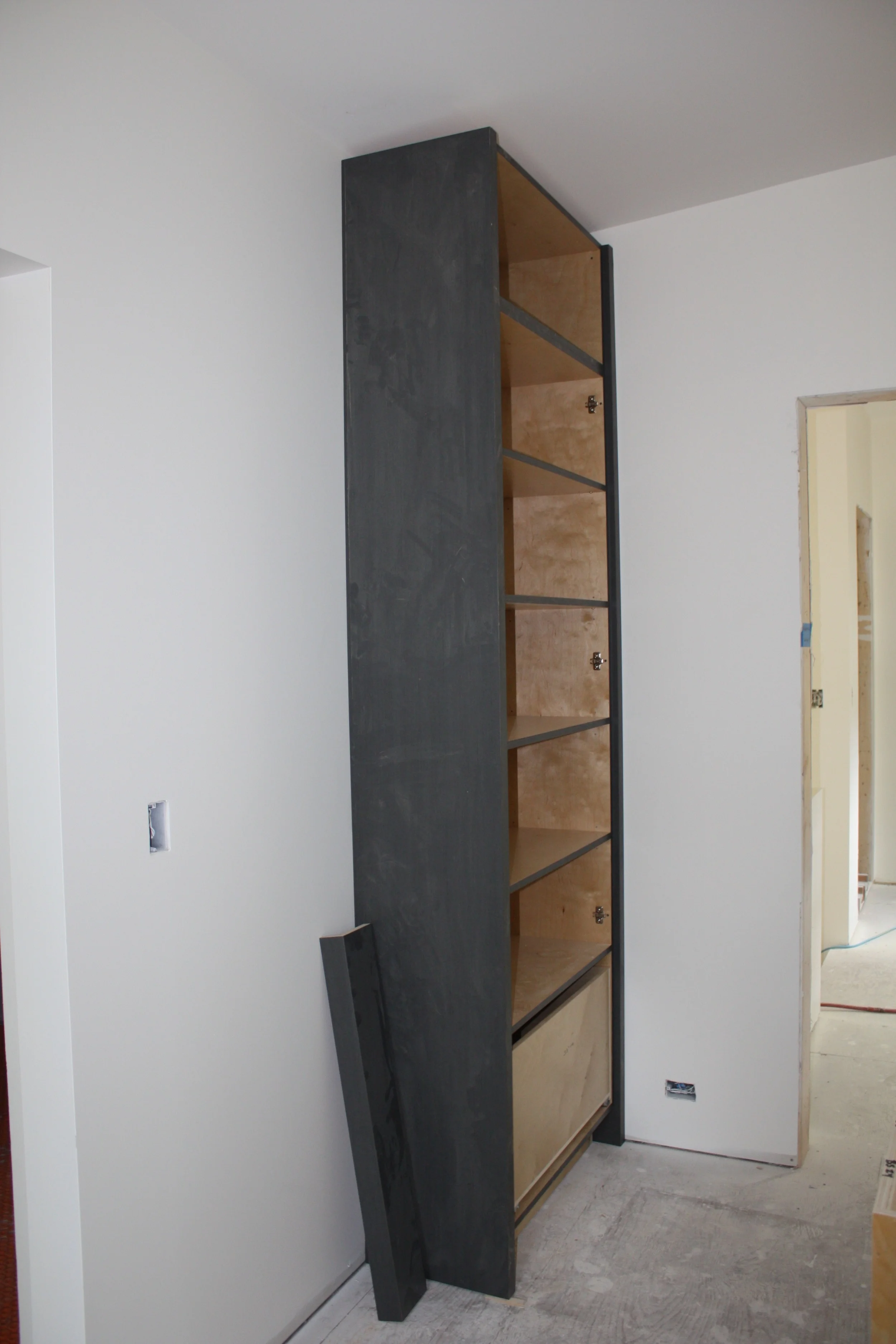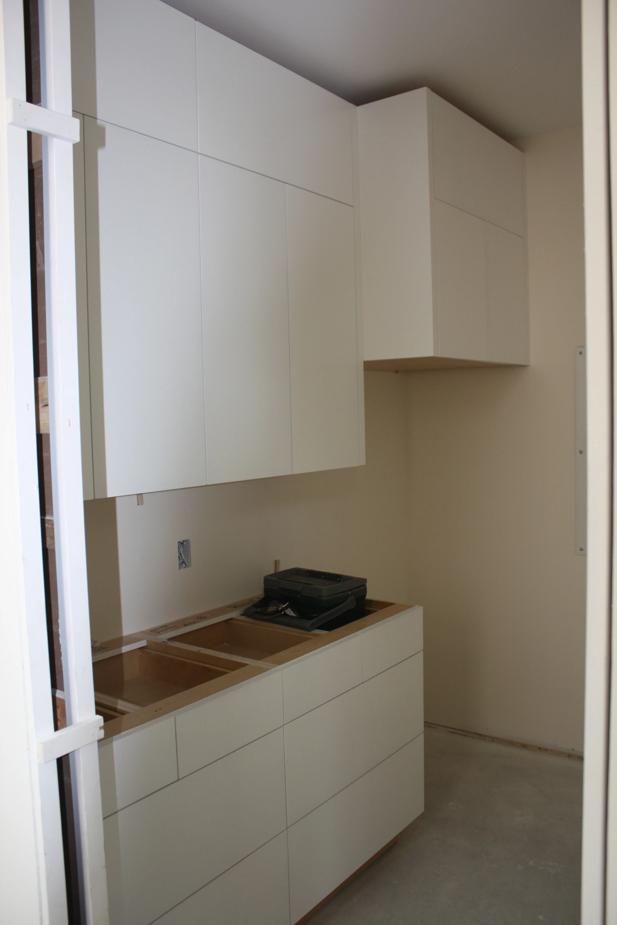 Kitchenette counter bar, wall cabinets and pantry set in place. I love the charcoal laminate!