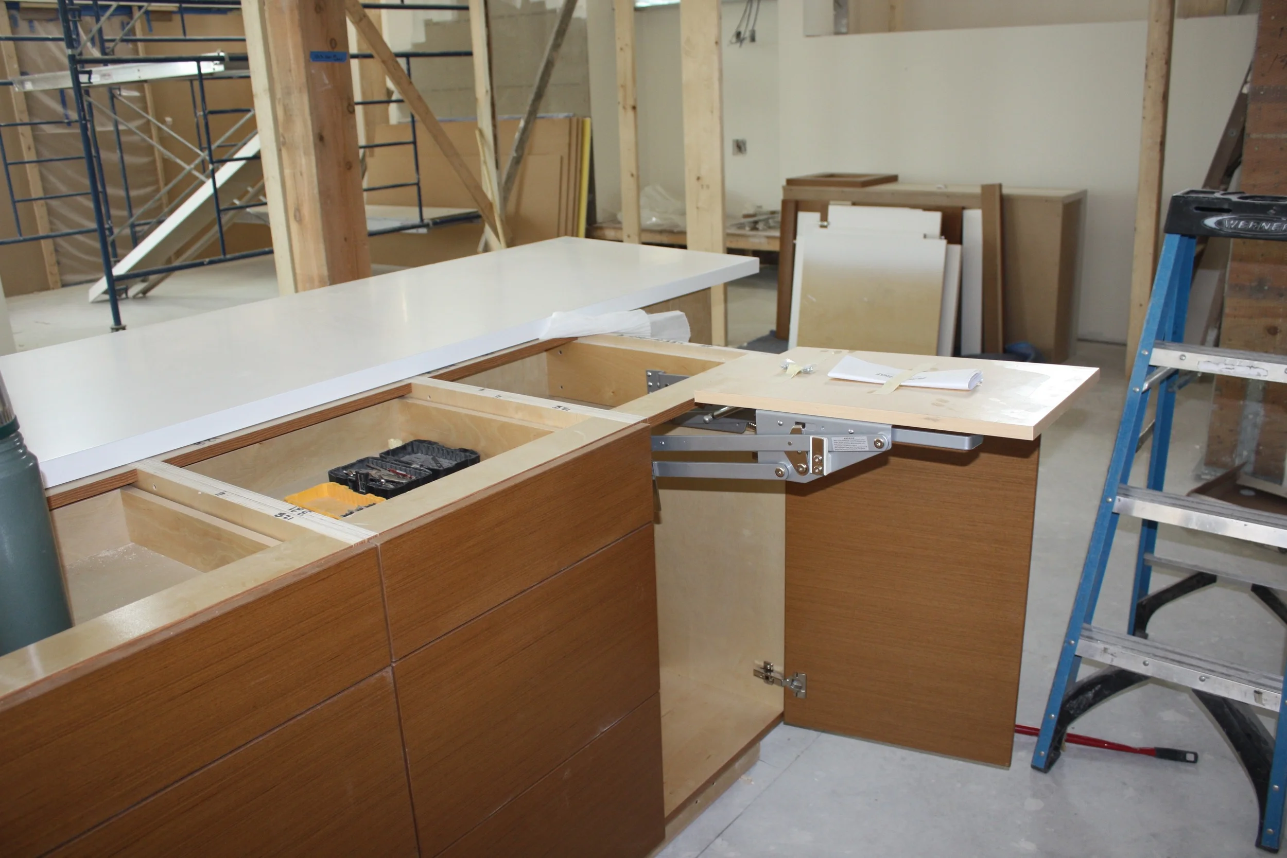 Dining room side of the island. These cabinets have pop-open latches, will be under the raised bar.