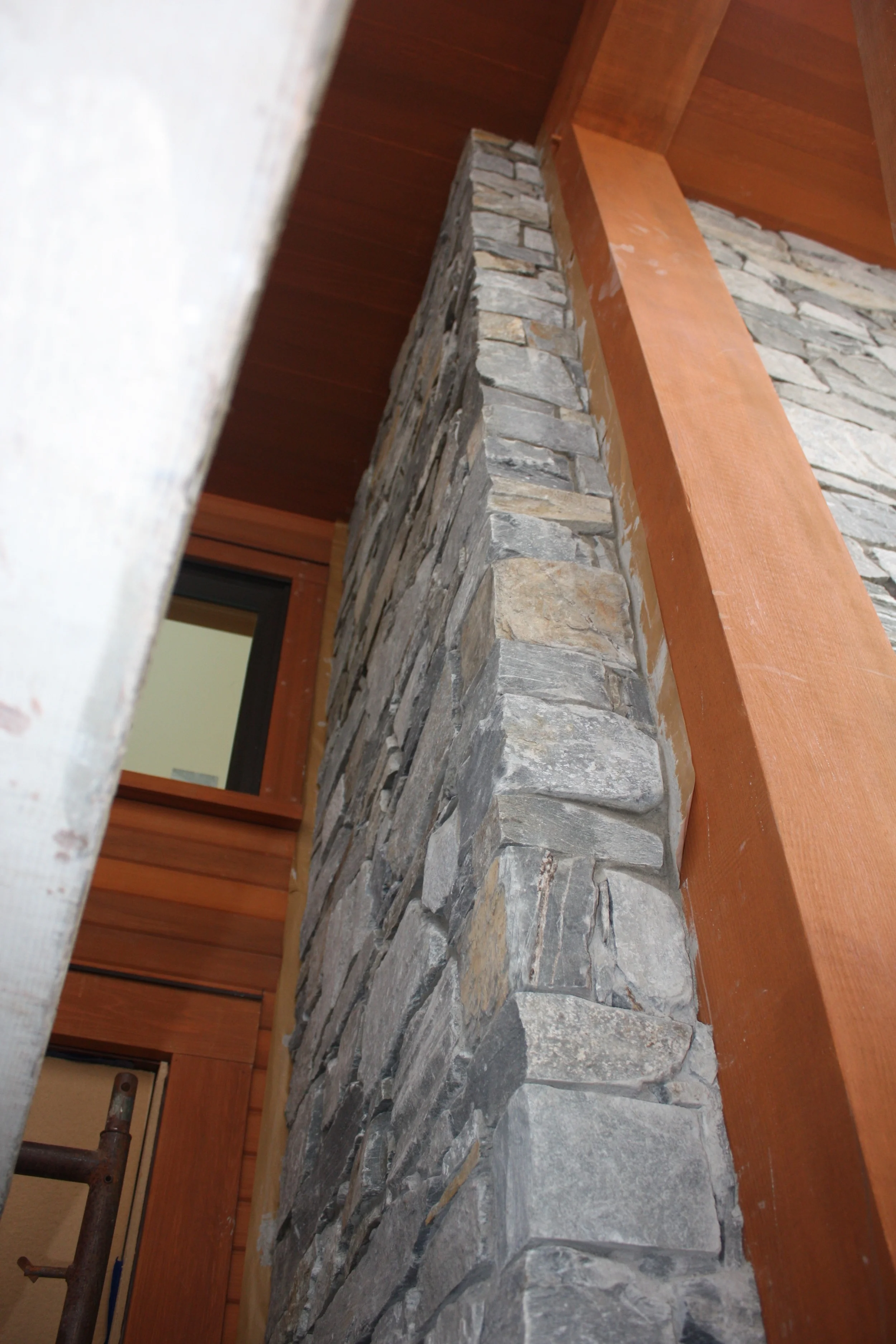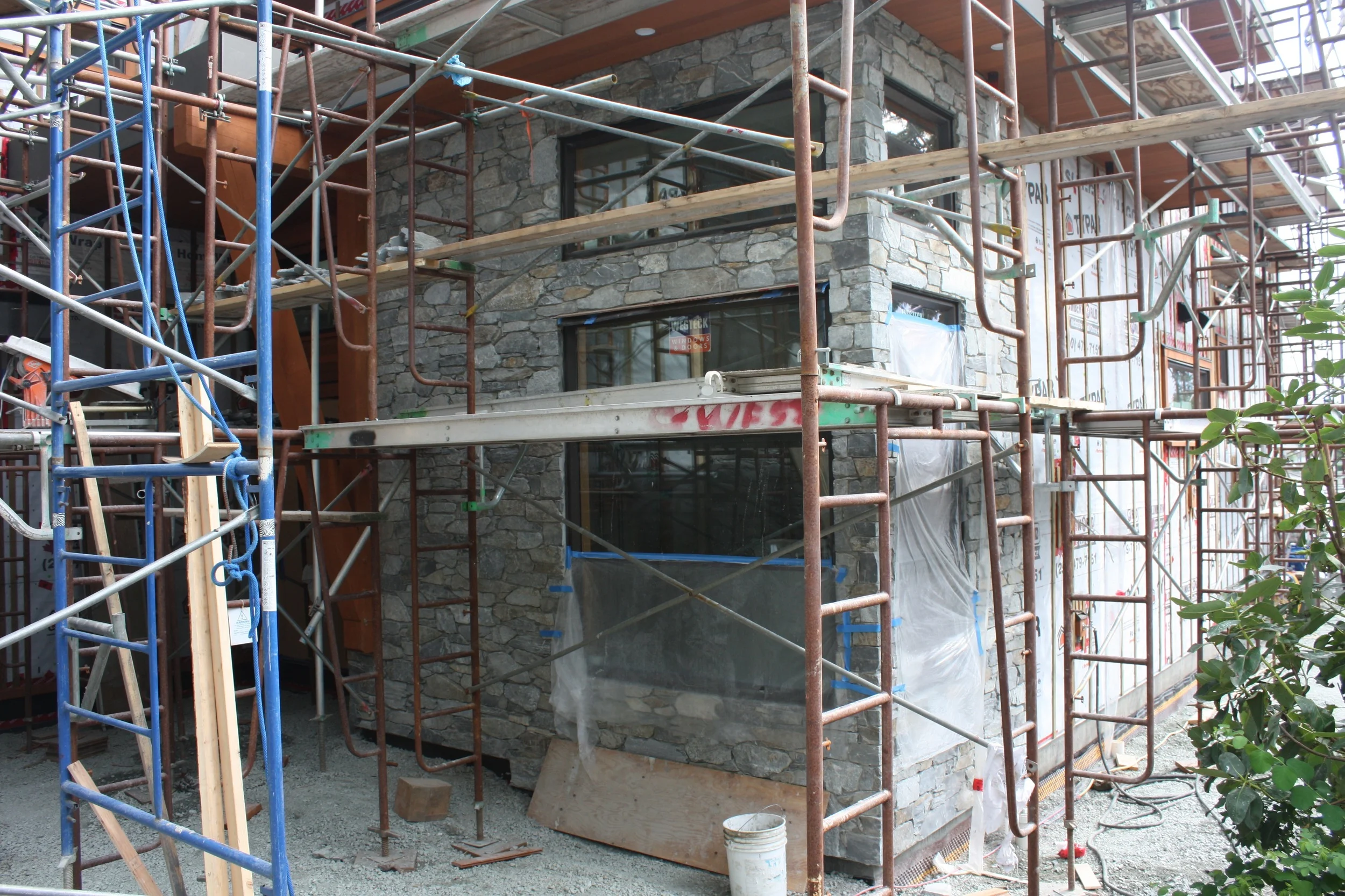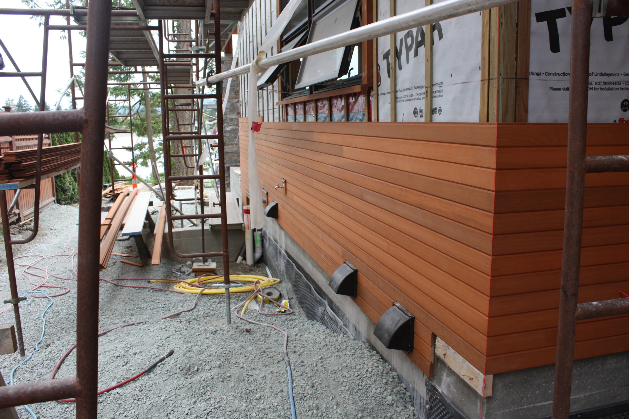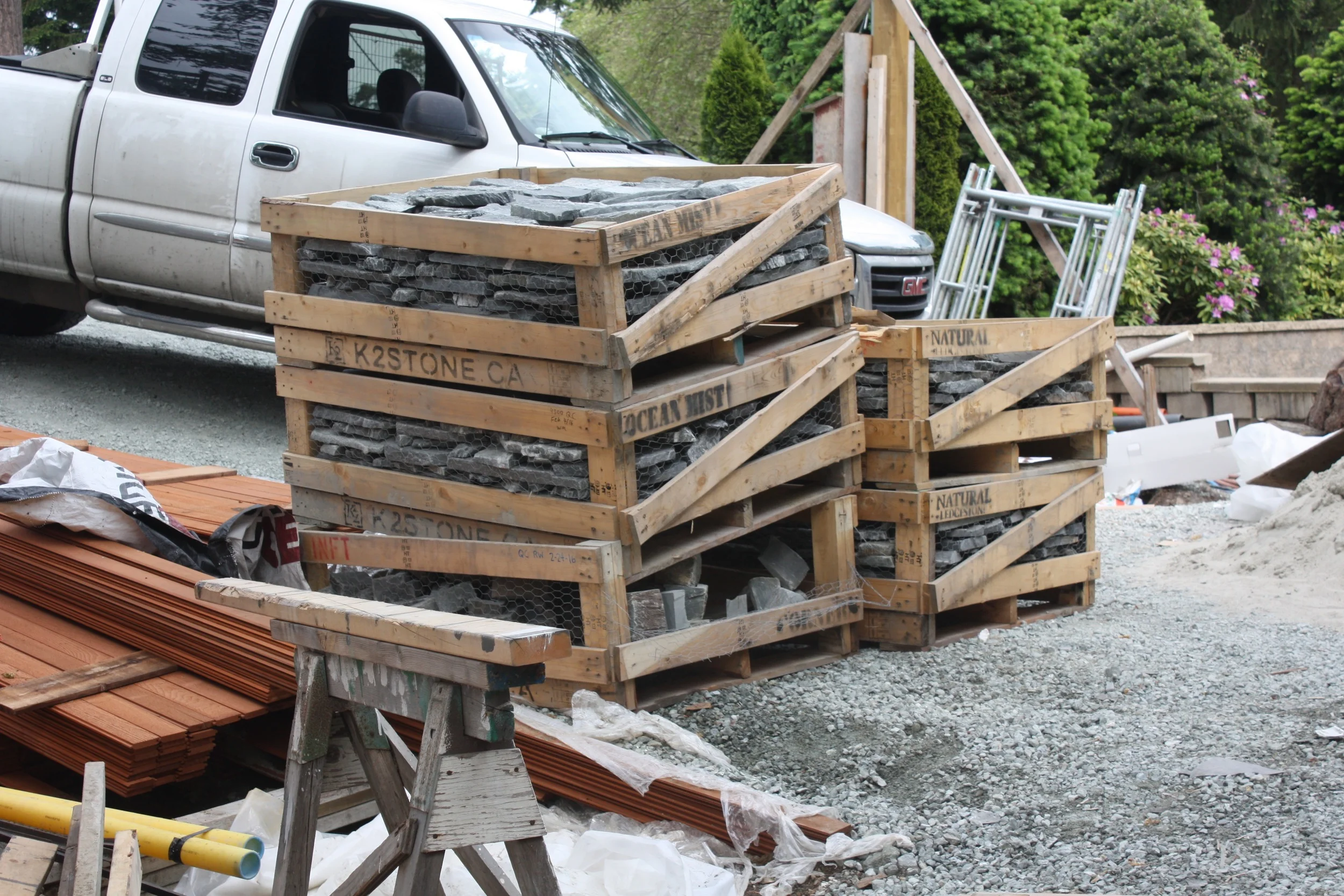 May 3: Beautiful Day on the West Coast has allowed for progress on the installation of siding, flashing and rock on the outside of the house - West Coast rock & cedar!