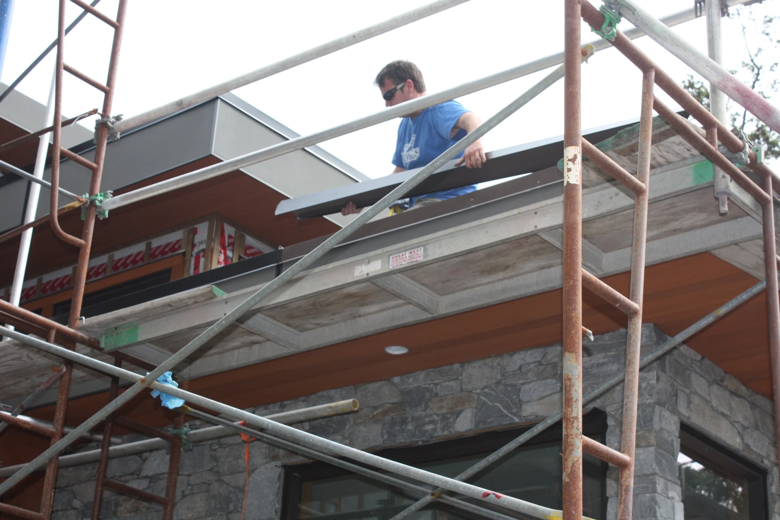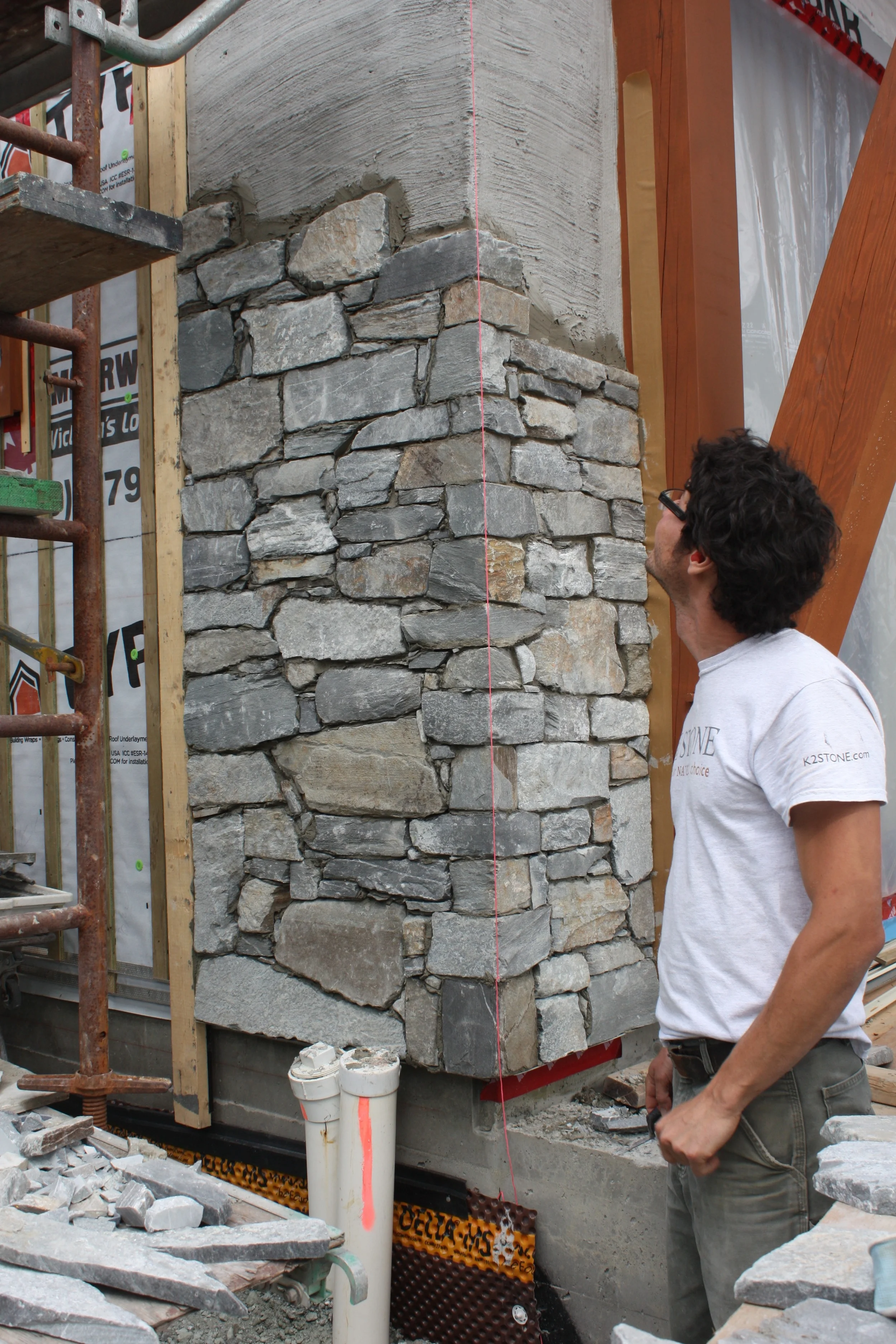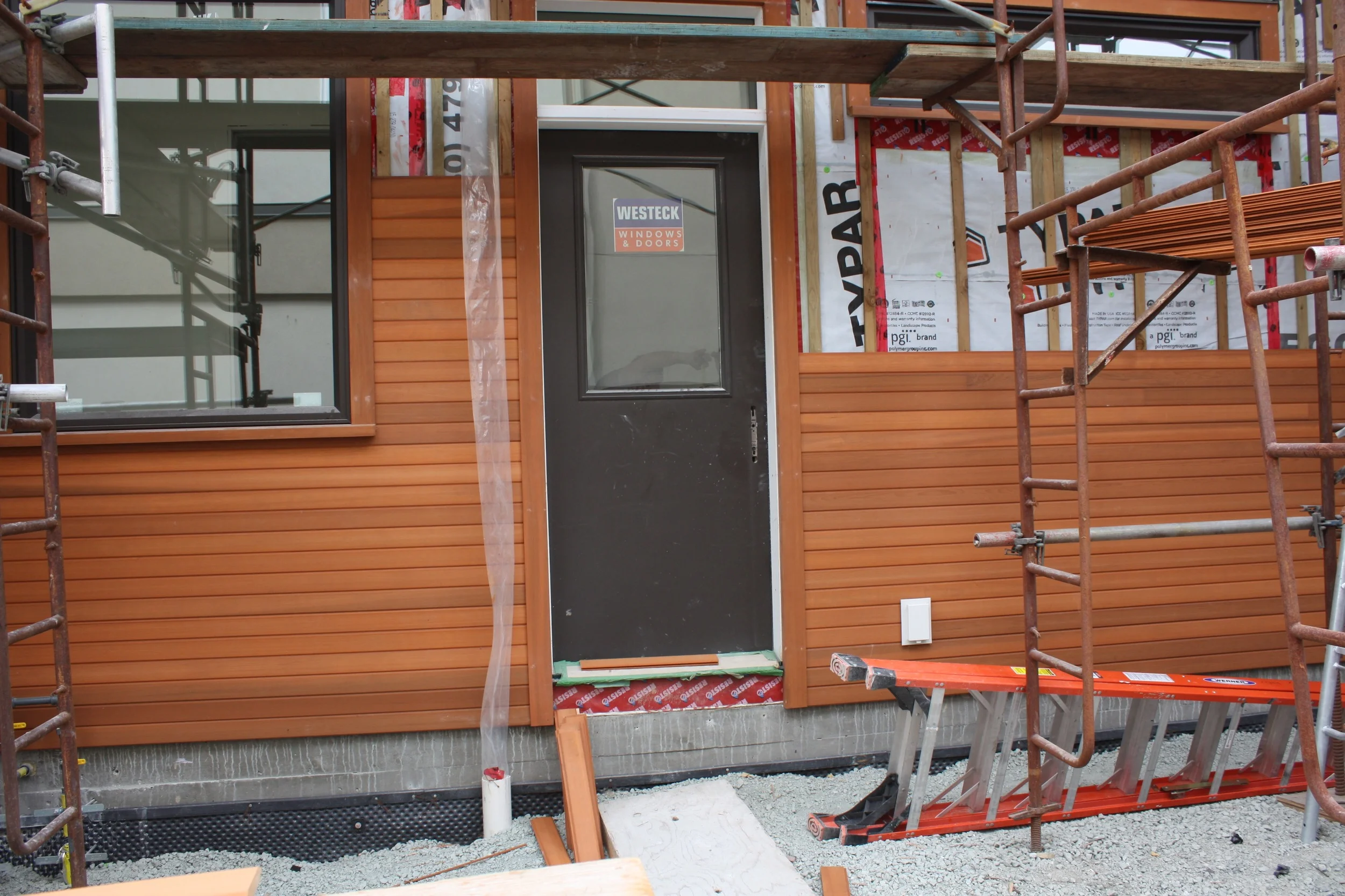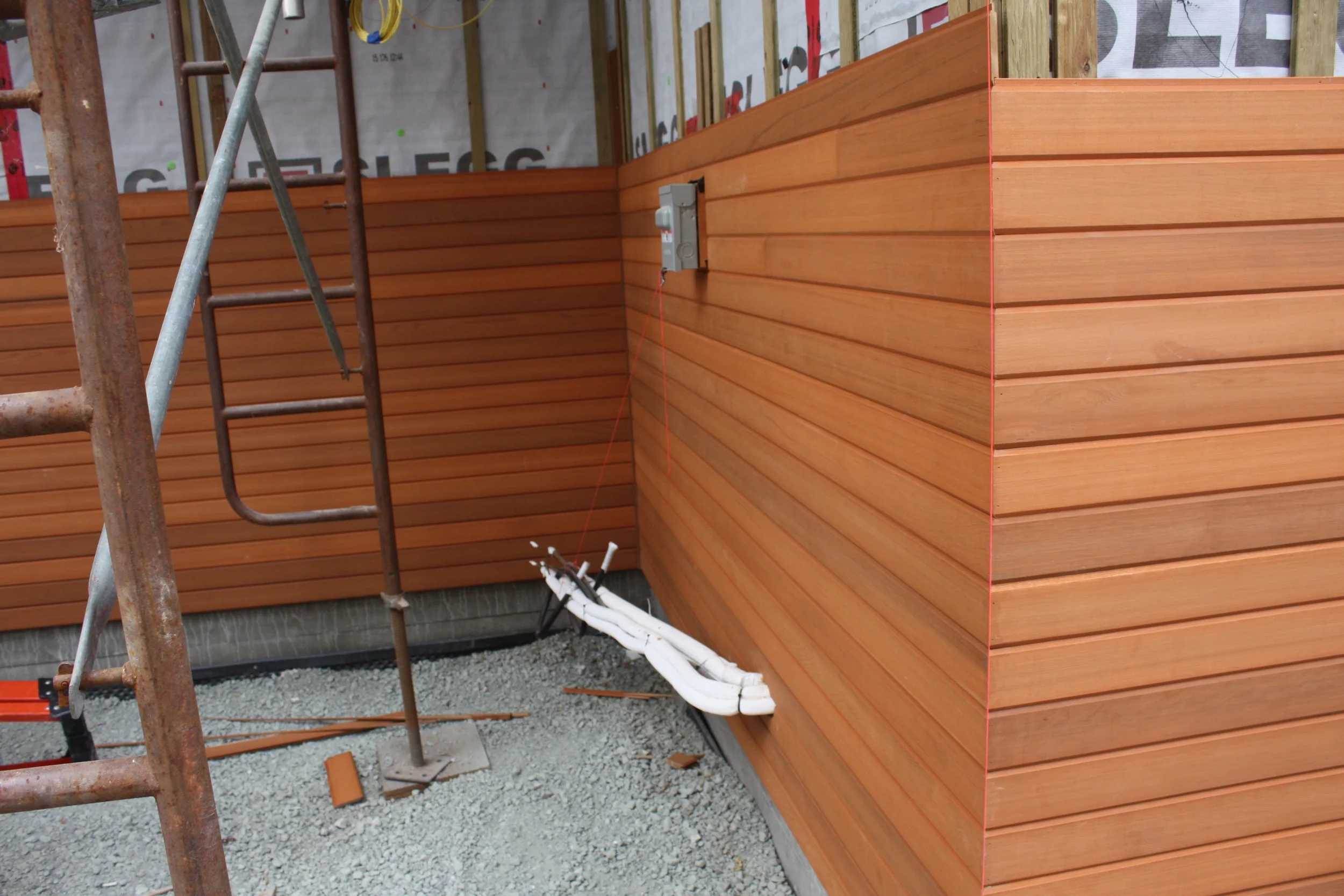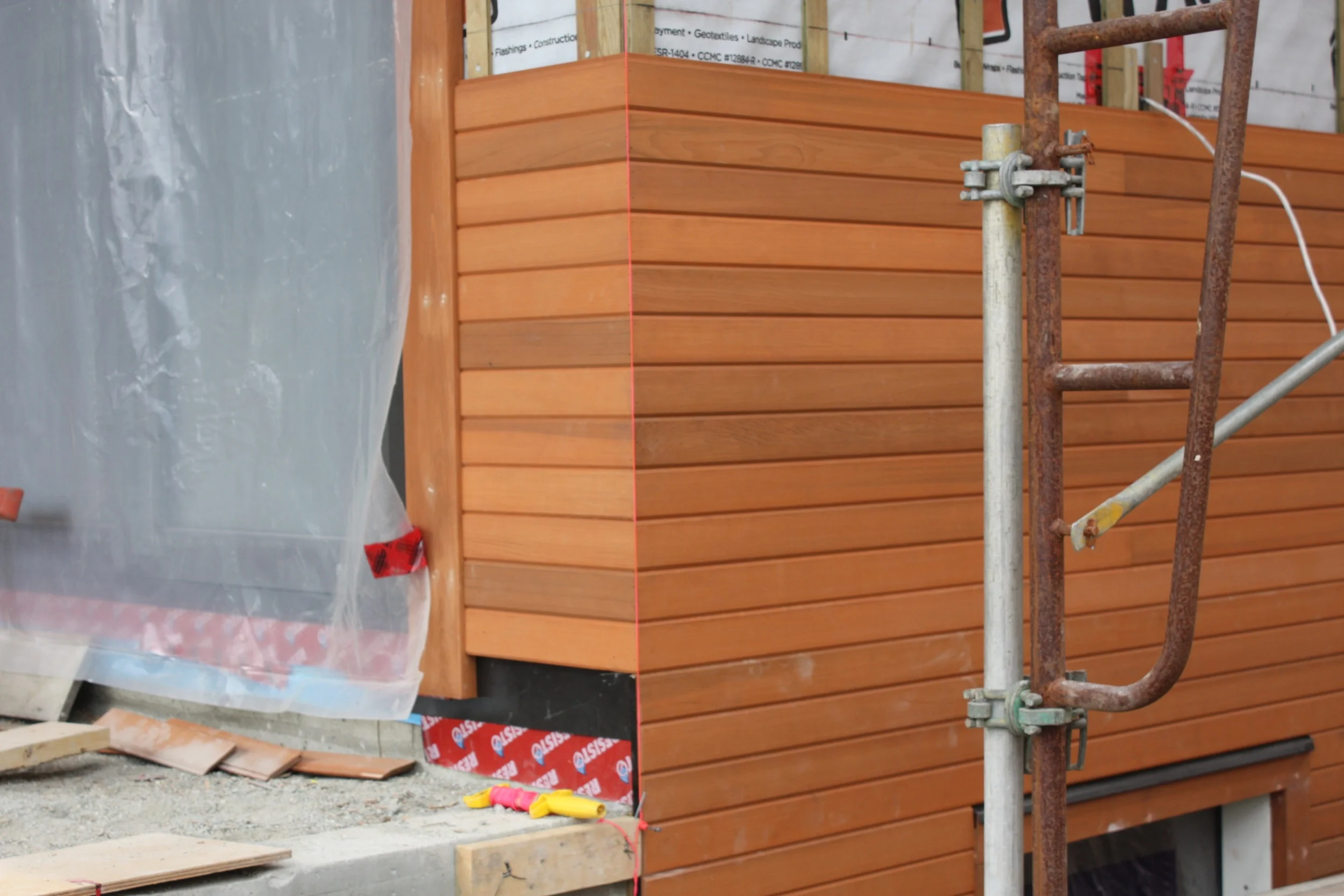 May 3: Beautiful Day on the West Coast has allowed for progress on the installation of siding, flashing and rock on the outside of the house - West Coast rock & cedar!