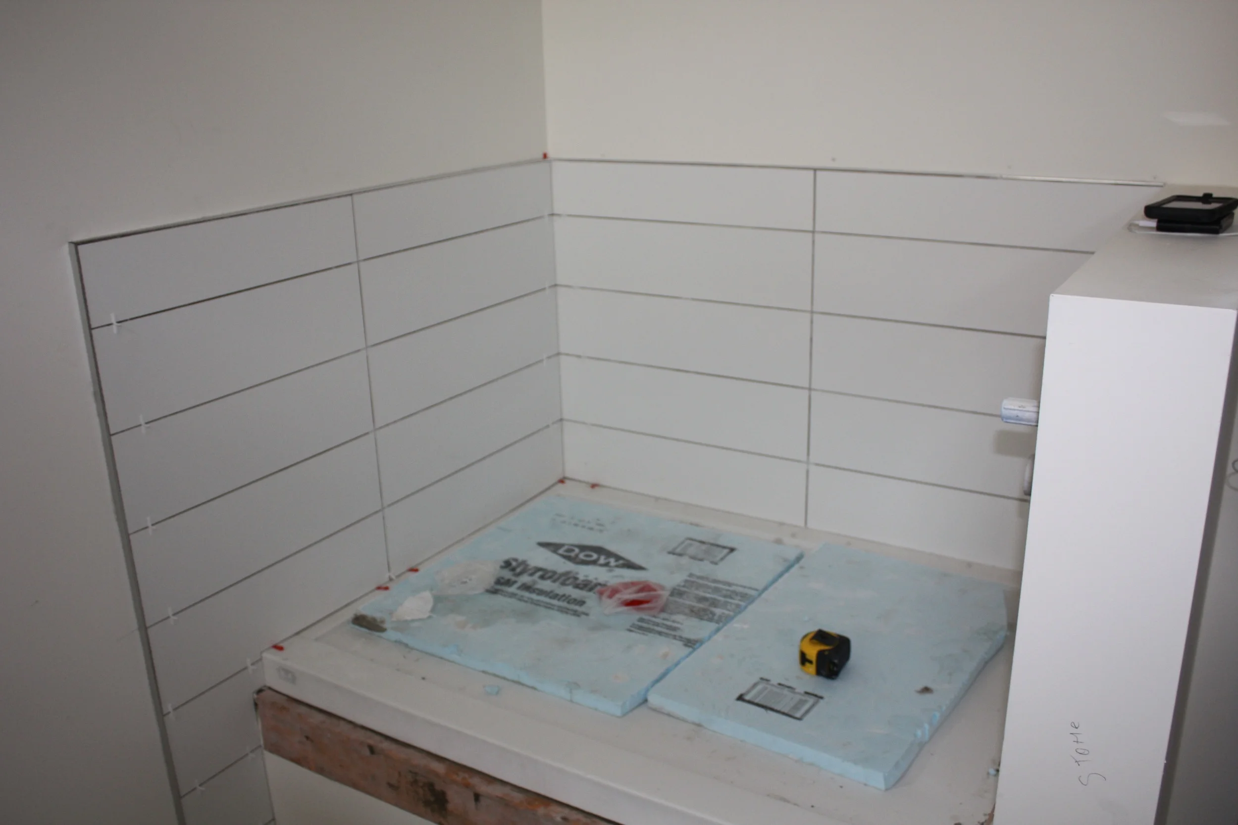 White tiles surrounding the dog/utility shower in the mudroom.