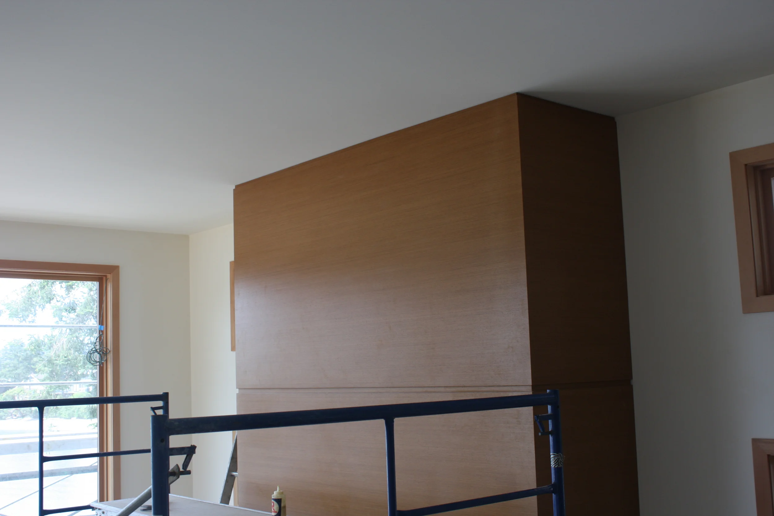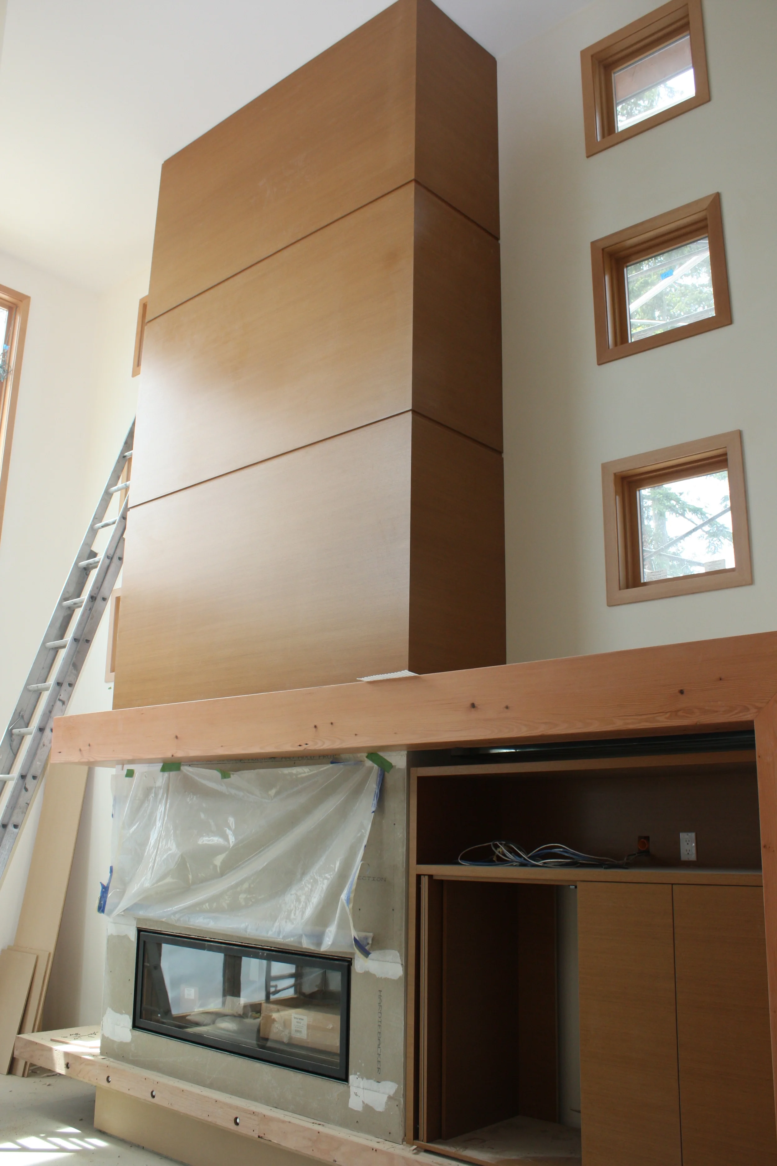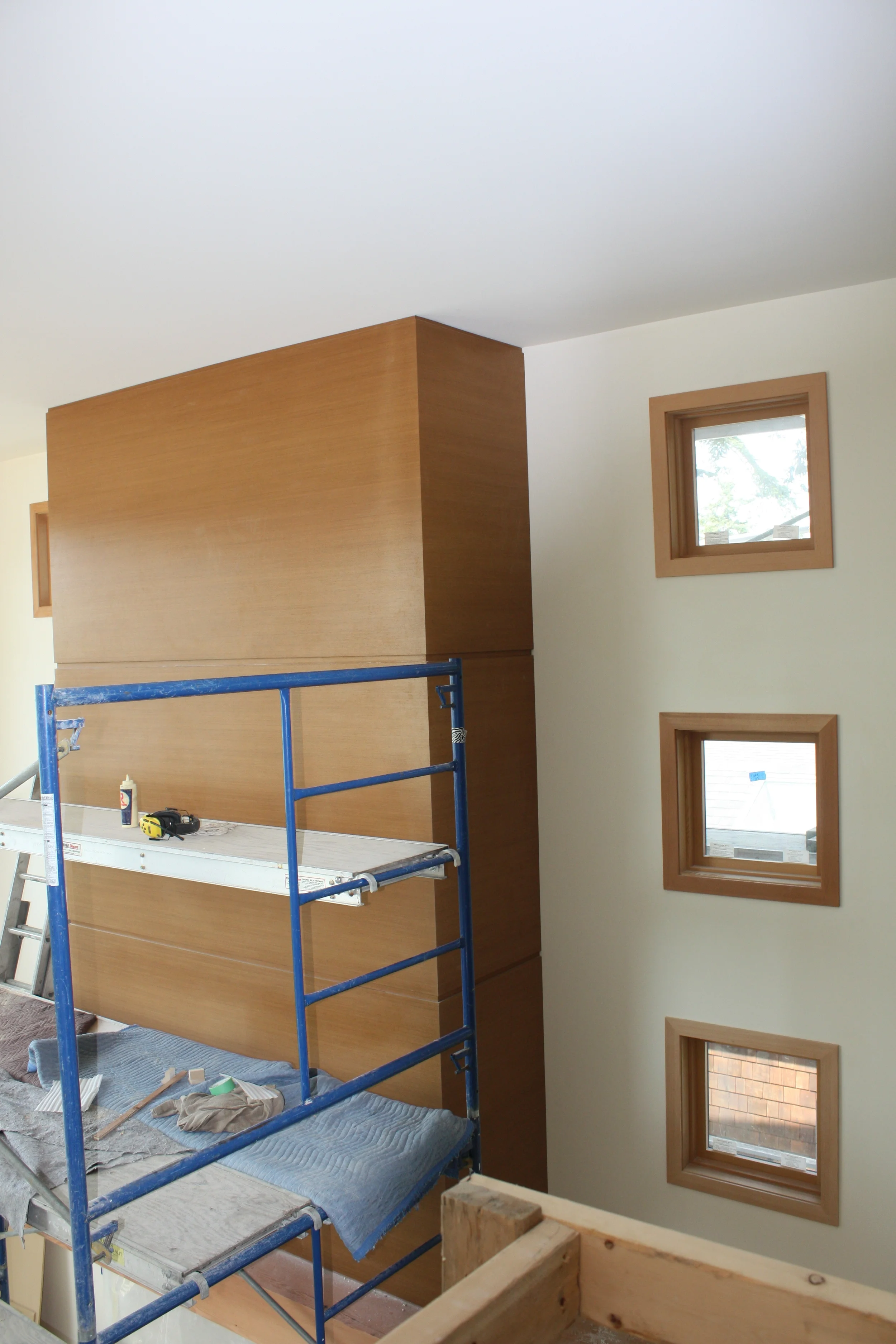 Today was all about cabinets. CJ and Ray have installed the third piece of the fireplace facade - no small job. On the South side of the fireplace at the top is a grill that allows for fresh air return and venting the large linear fireplace. Hobson's cabinets are currently making a bespoke piece to cover the opening that will be flush with the rest of the cabinet. Lovely. The unique cabinet fronts for the den bathrooms are here and they are beautiful; crafting of teak with maple accents. Laminate countertops are going into the pantry, as well as the kitchenette and laundry room. Unfortunately there was a problem with the kitchenette countertop, so it was sent back. The cabinet installers are perfectionists! (love that).