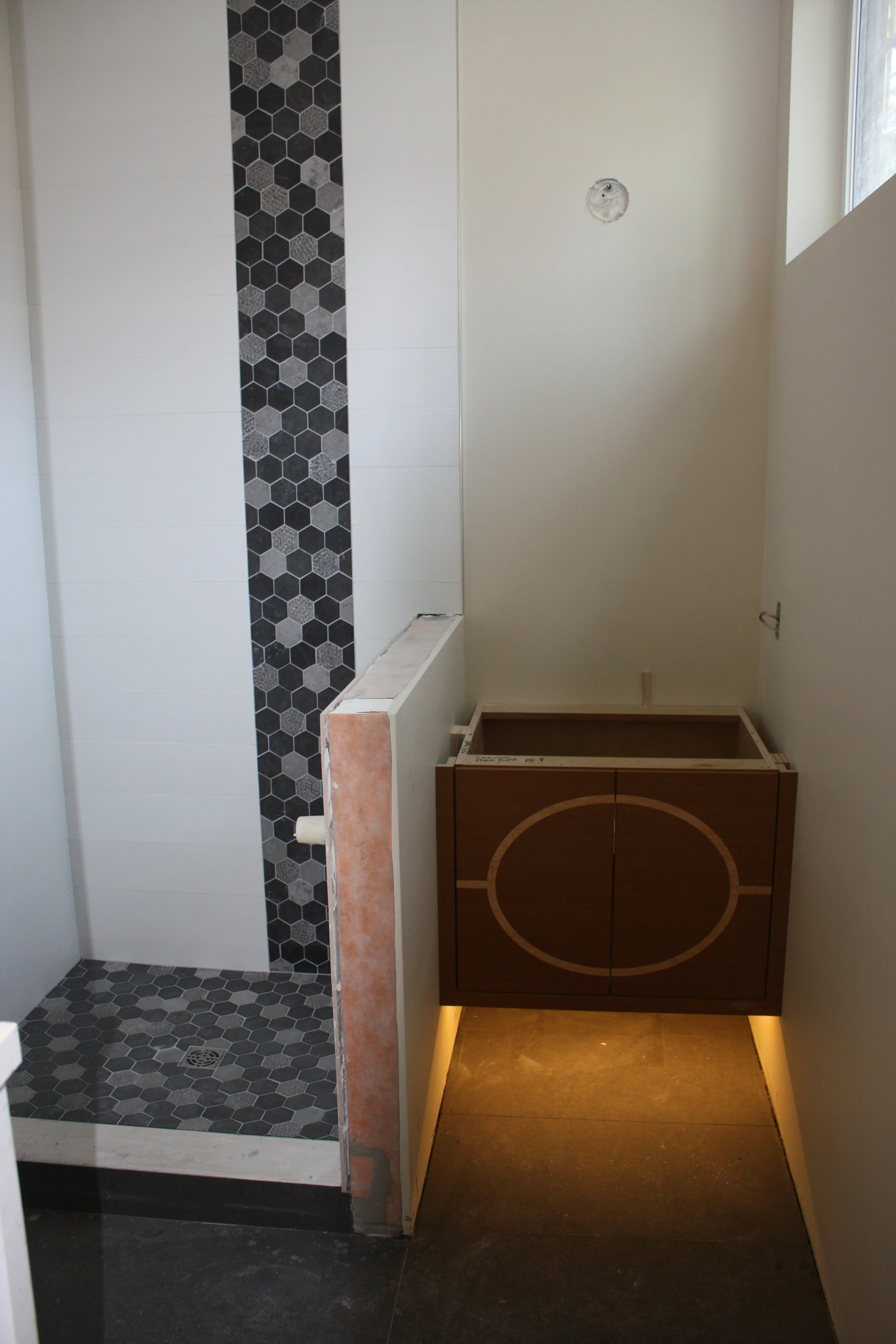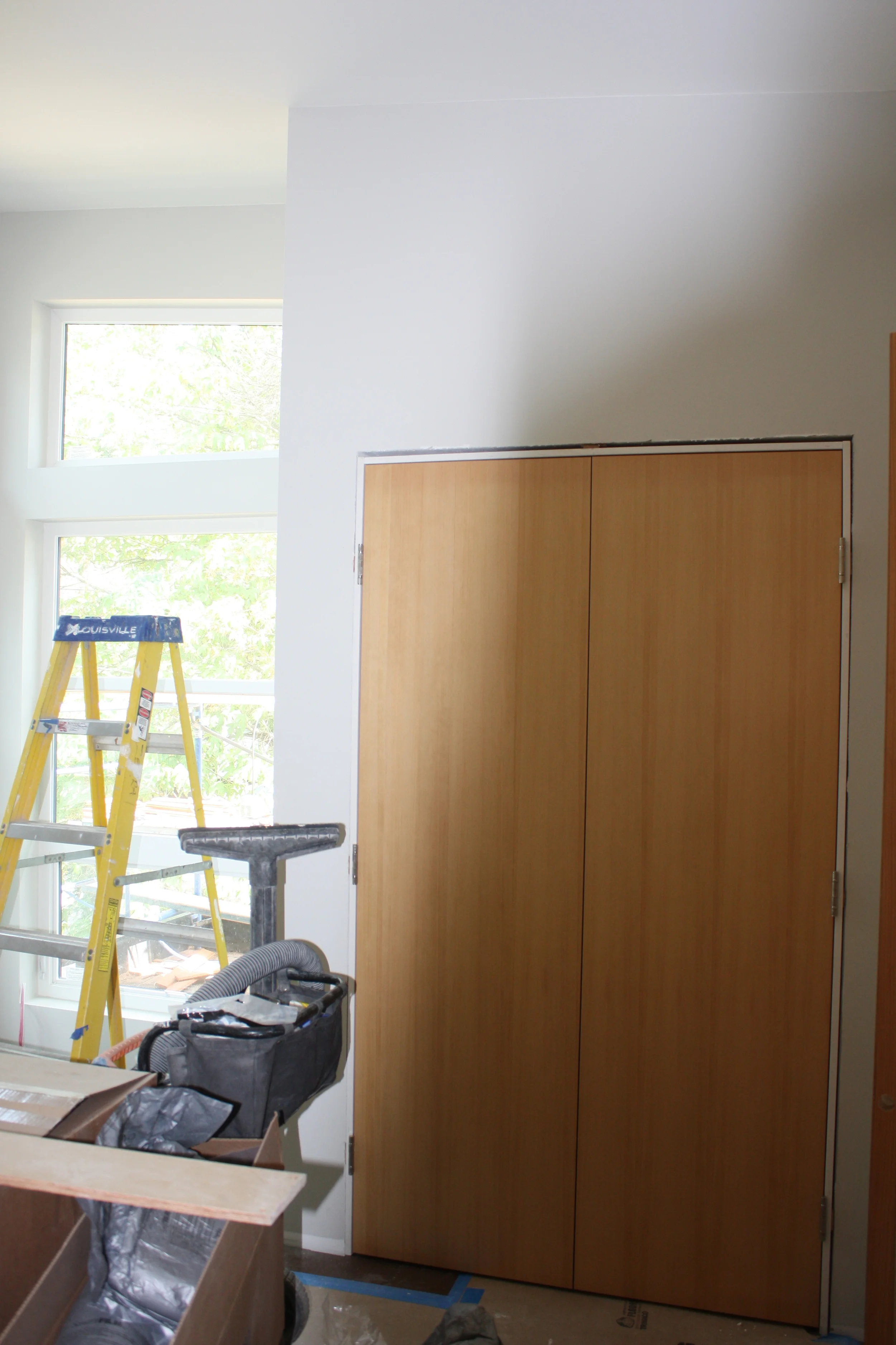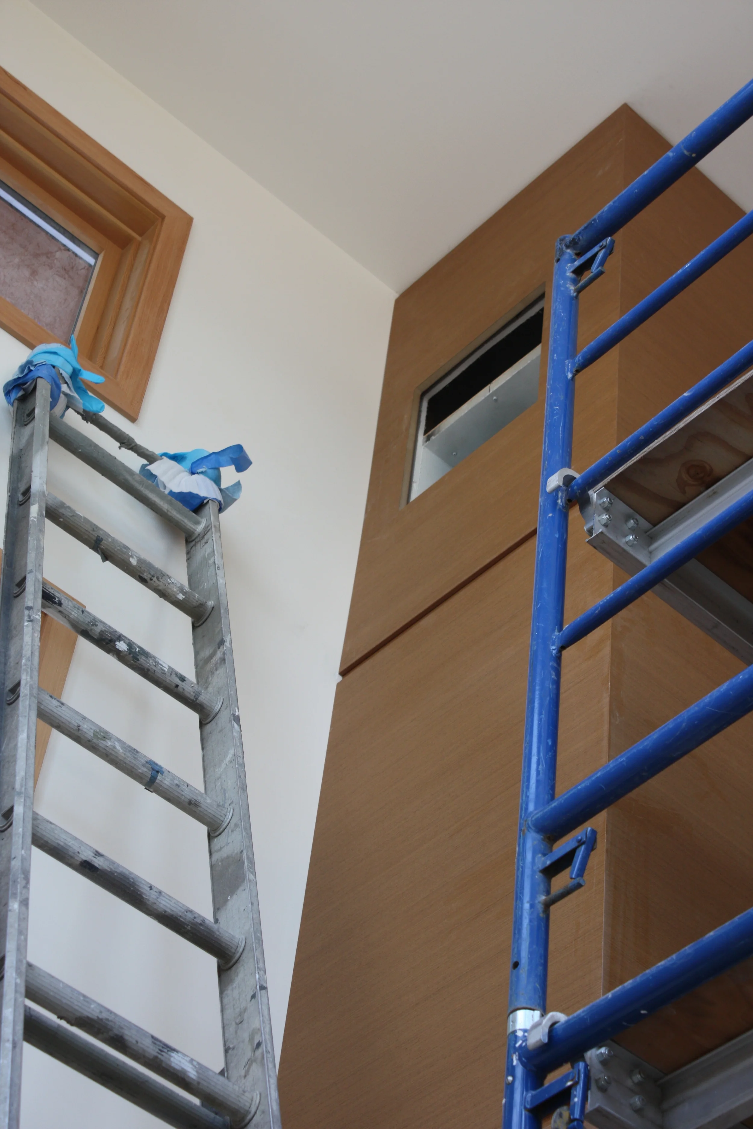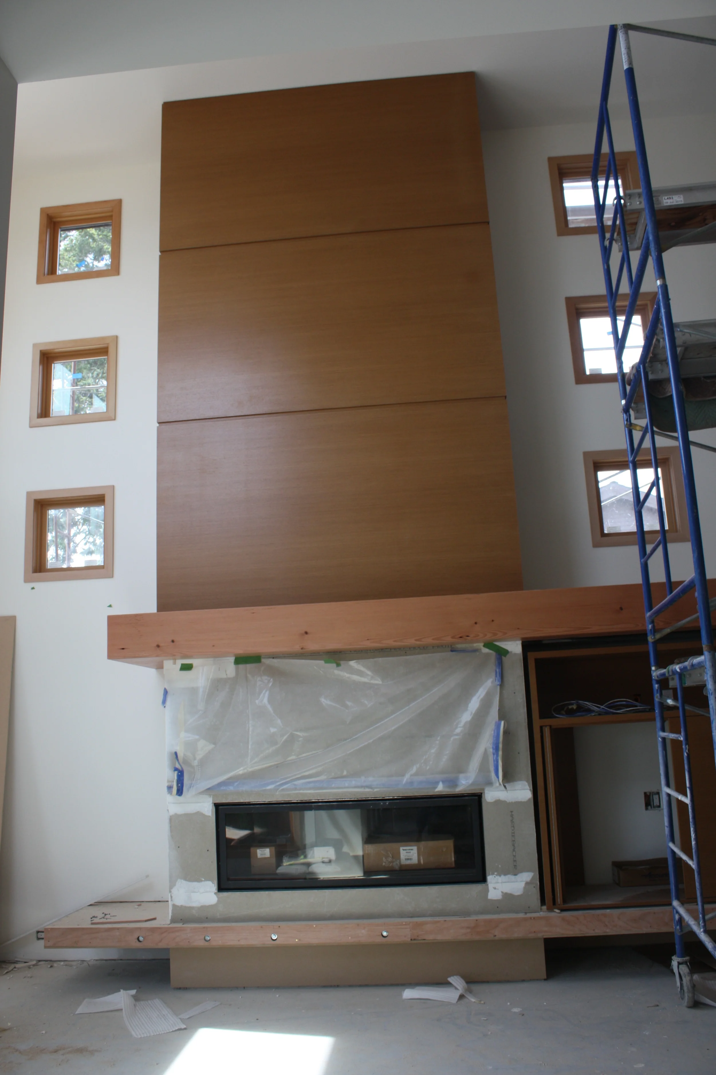 Today was all about cabinets. CJ and Ray have installed the third piece of the fireplace facade - no small job. On the South side of the fireplace at the top is a grill that allows for fresh air return and venting the large linear fireplace. Hobson's cabinets are currently making a bespoke piece to cover the opening that will be flush with the rest of the cabinet. Lovely. The unique cabinet fronts for the den bathrooms are here and they are beautiful; crafting of teak with maple accents. Laminate countertops are going into the pantry, as well as the kitchenette and laundry room. Unfortunately there was a problem with the kitchenette countertop, so it was sent back. The cabinet installers are perfectionists! (love that).