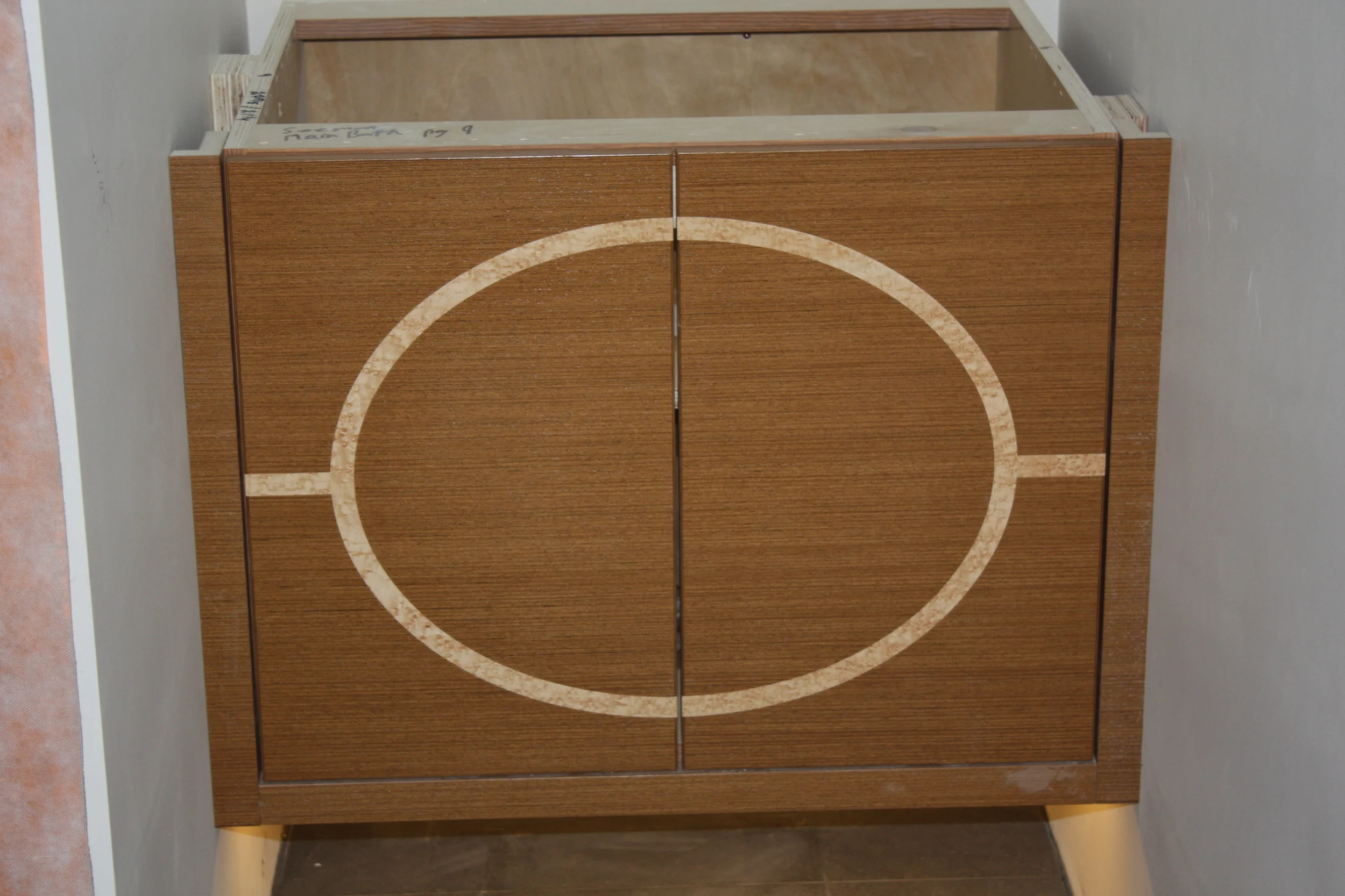 The front of the powder room and den floating cabinets is a teak veneer with maple inserts.