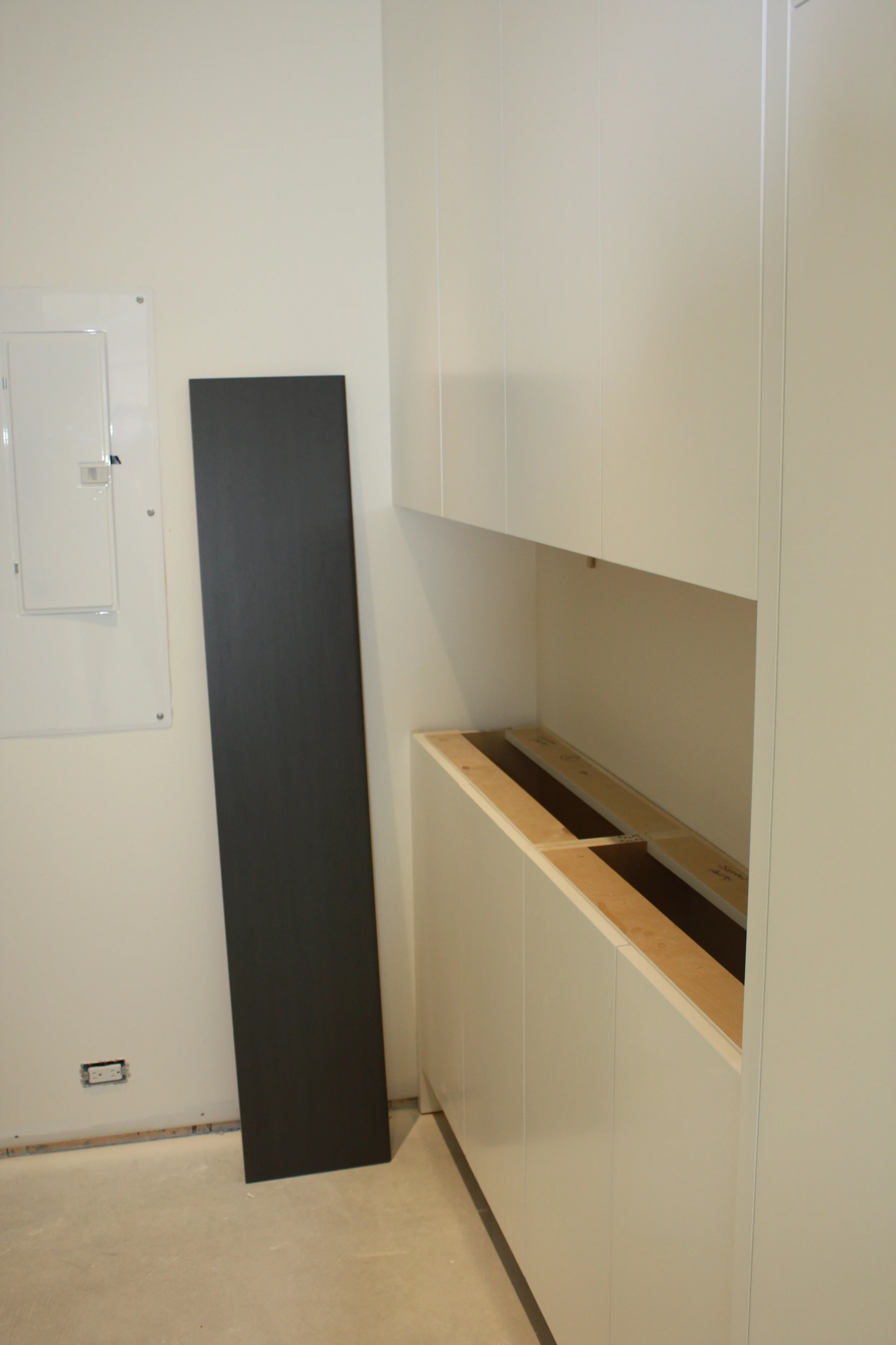 The laminate countertops in the pantry are set, but need adjusting to complete installation.