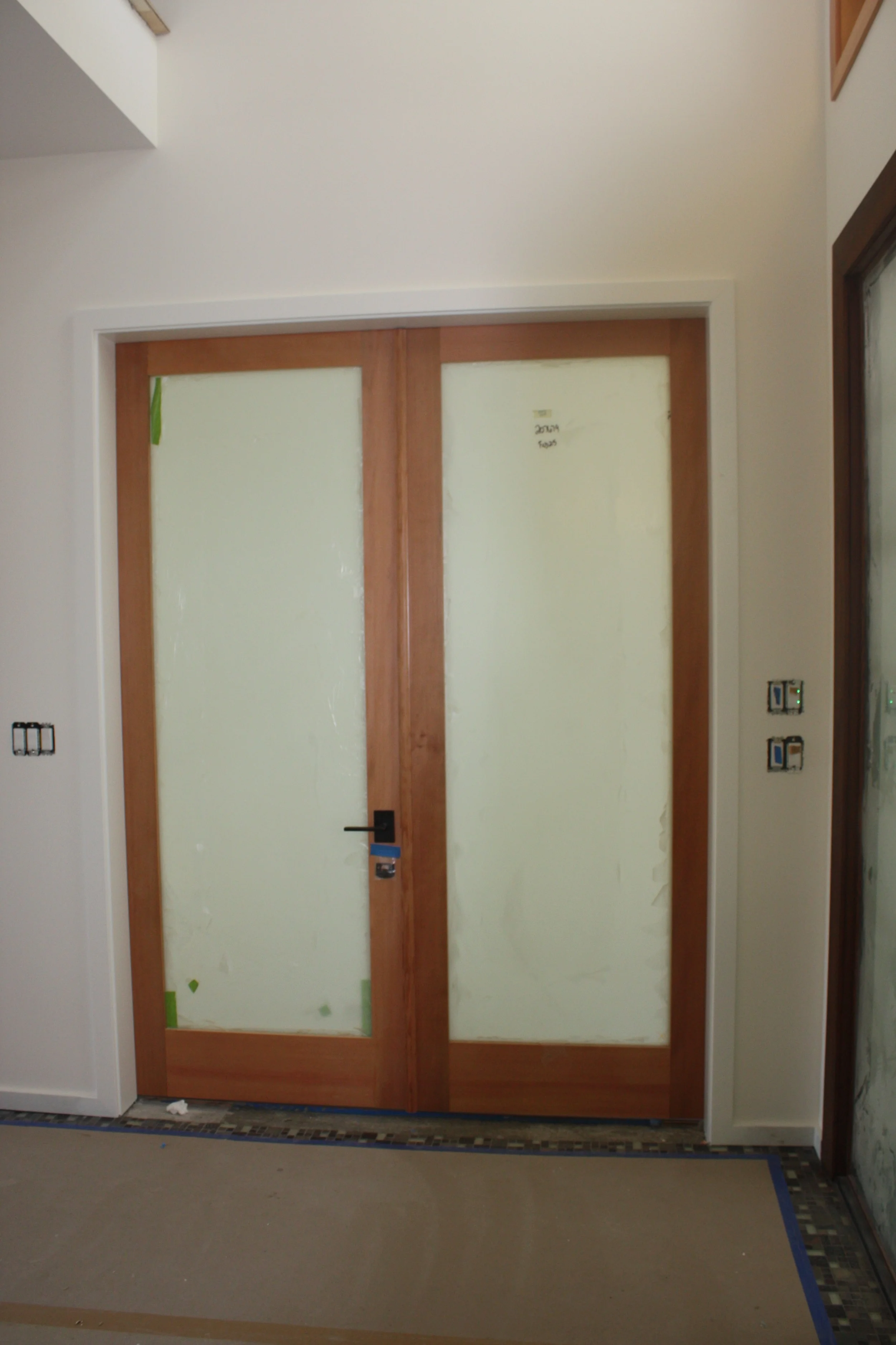 French doors with the handles on... and the protective paper on the glass. Sigh