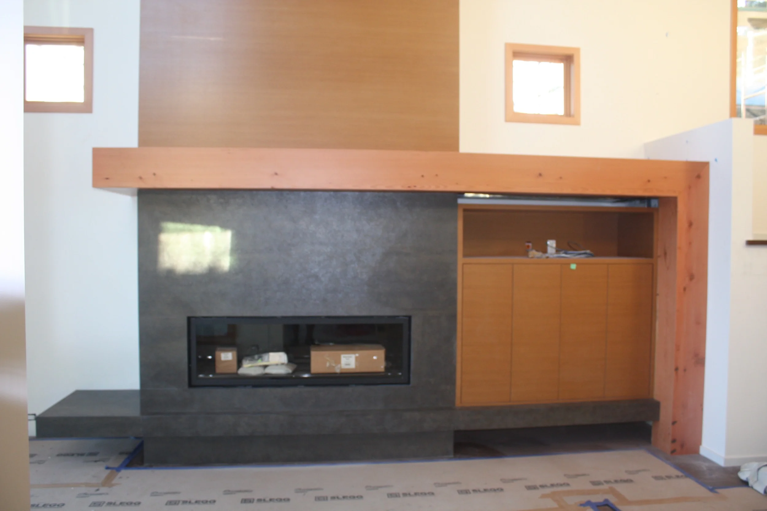 July 18: So much happened in the house build while away... as expected. Interior doors (and door handles) installed, exterior doors removed, some appliances in (and functioning) and most of the plumbing fixtures in place. Siding has been completed on three sides of the house, and the exoskeleton removed (no more scaffolding). The same day the counters were installed, the fireplace in the great room was finished - a wonderful design statement.... Thanks Lorin.