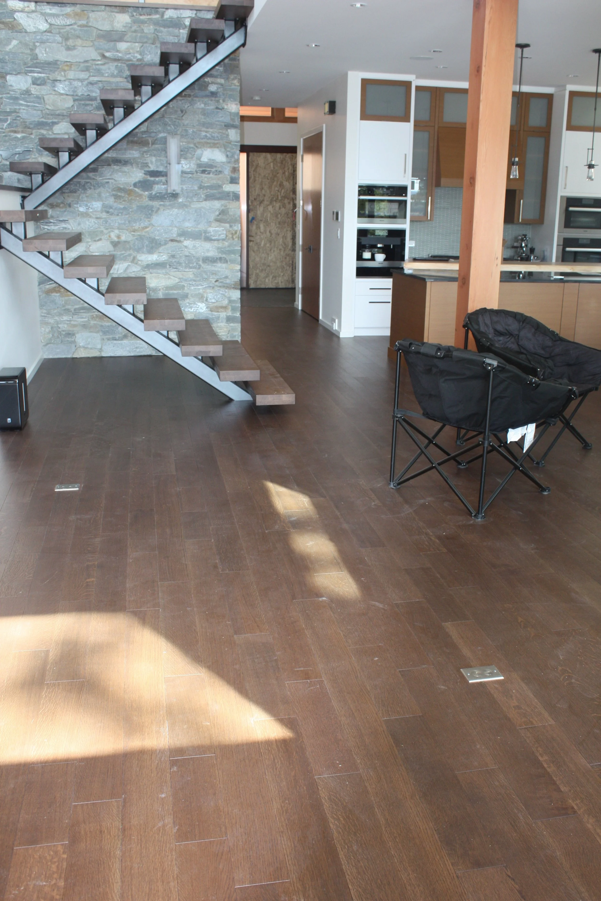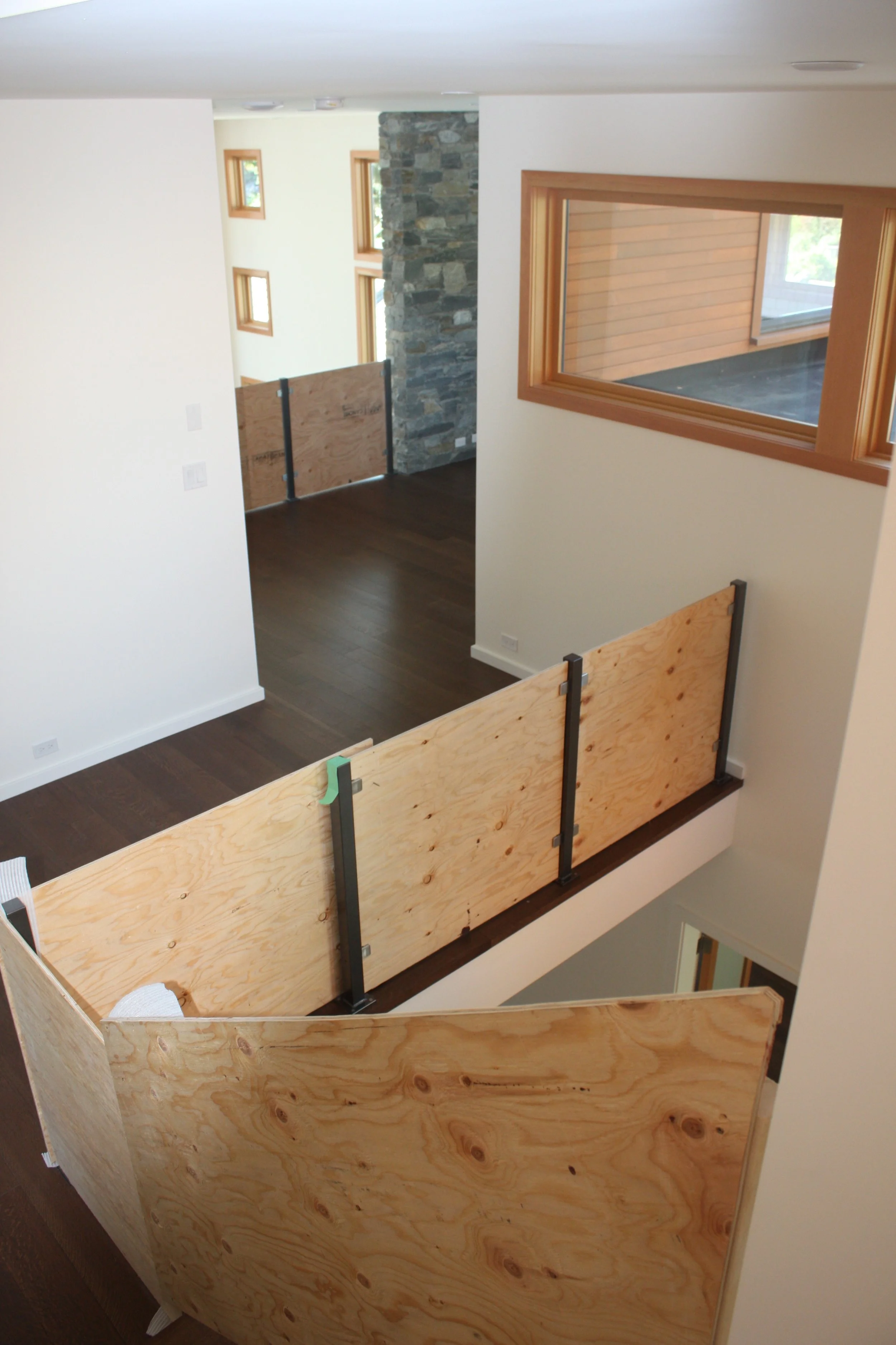 Completed staircase in the great room. The glass guards still need to be installed. Notice that we still don't have a front door. We have thought of polishing up the chip-board for a modern look!!