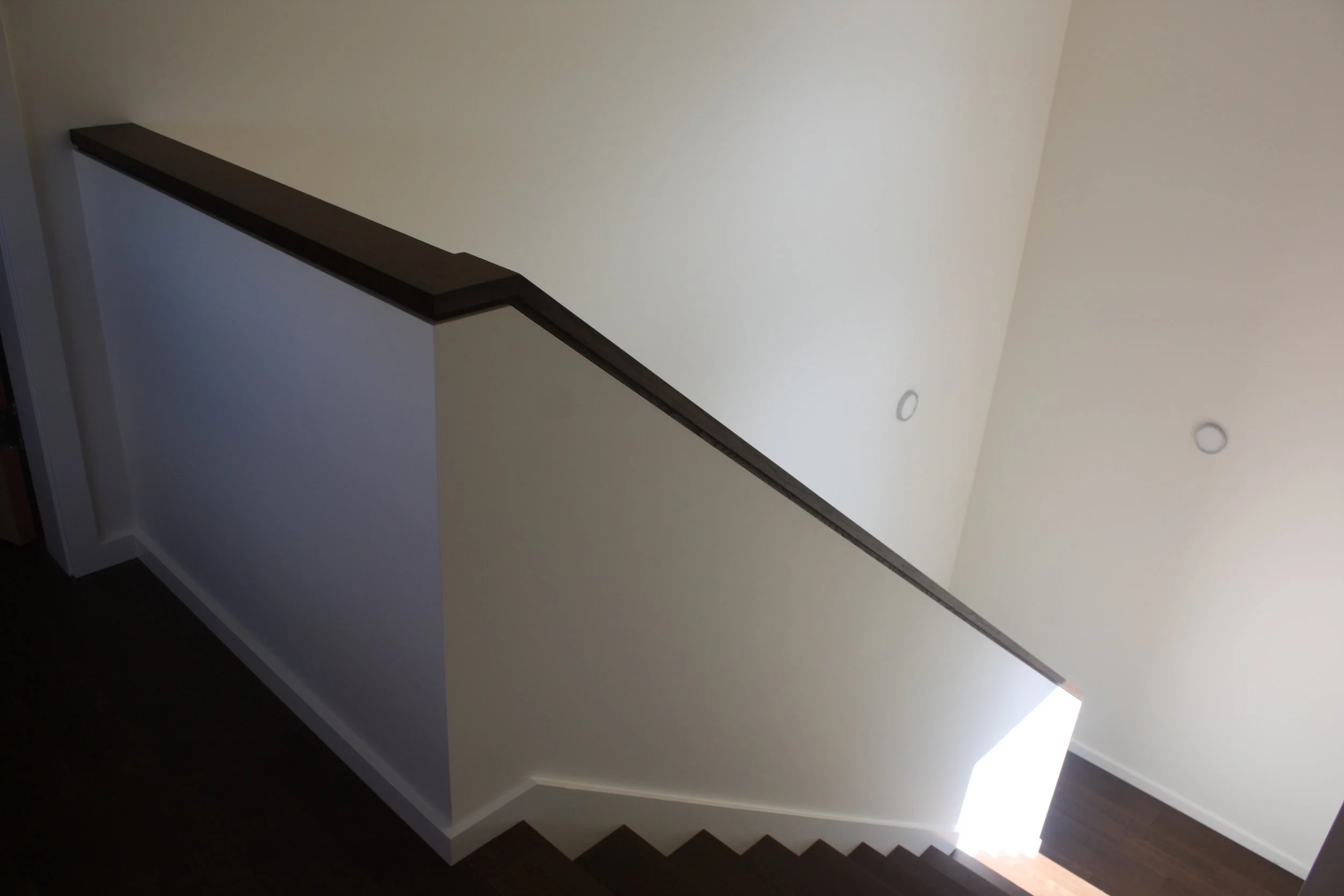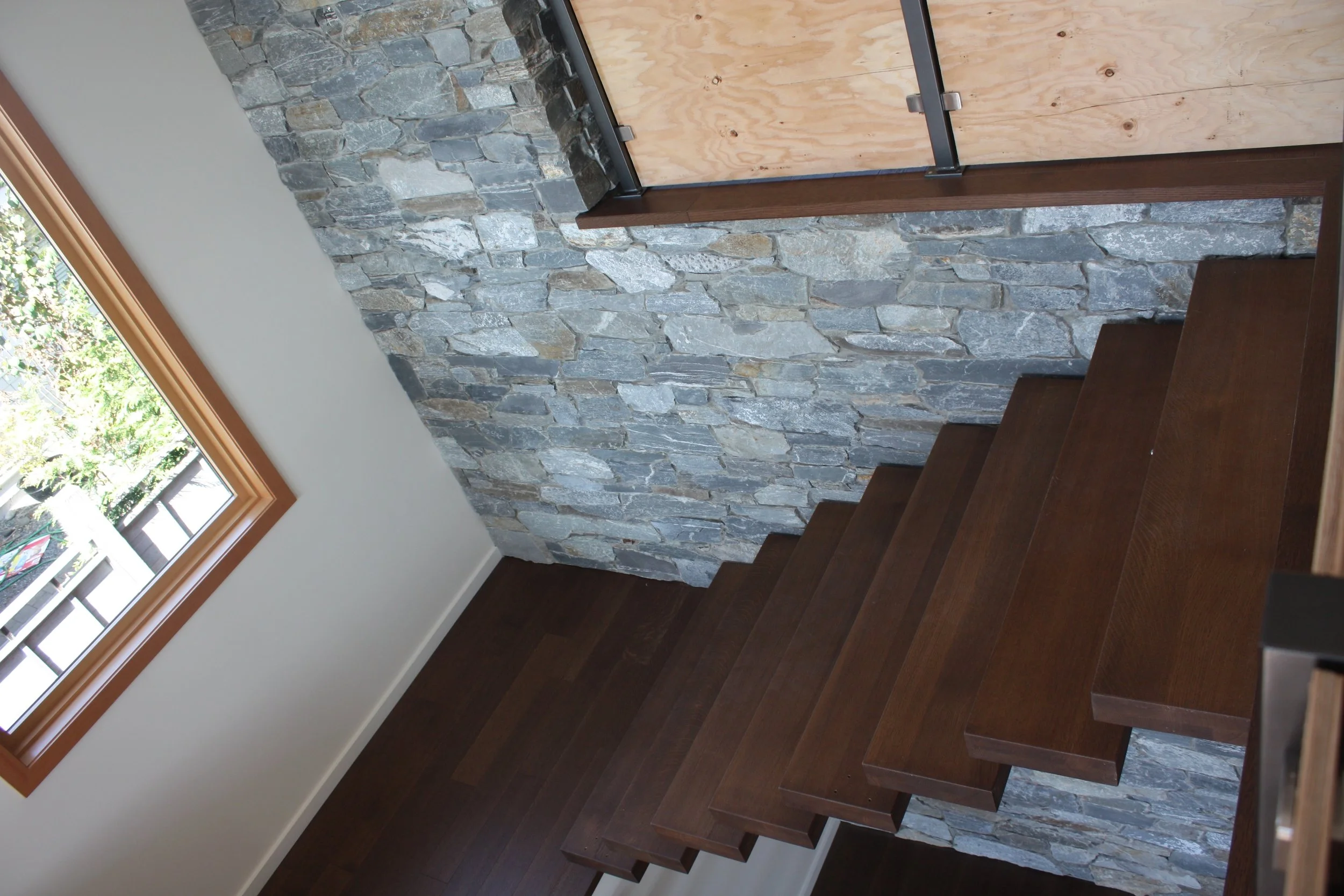 Staircase from the upper floor. The treads are solid oak, stained to match the flooring.