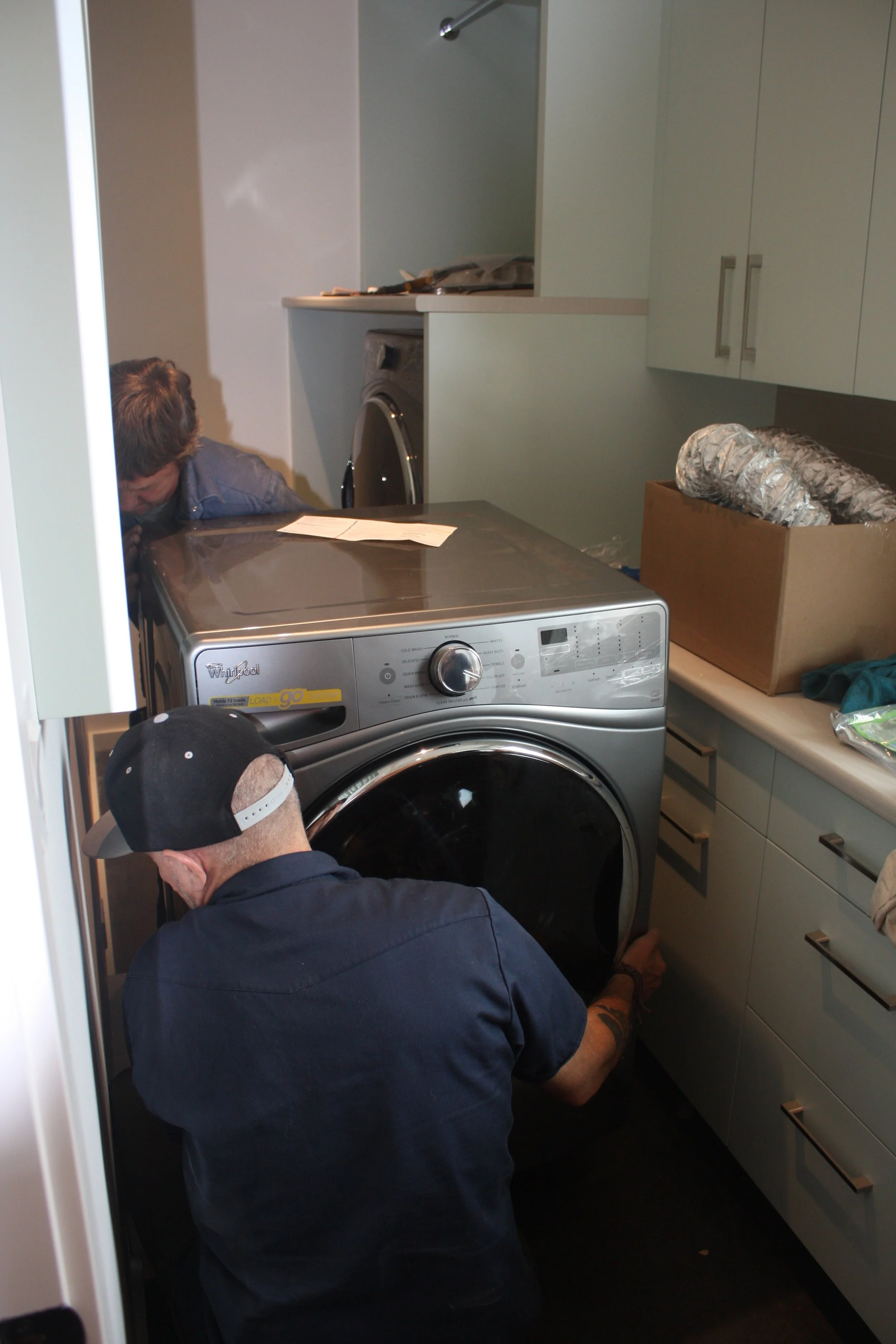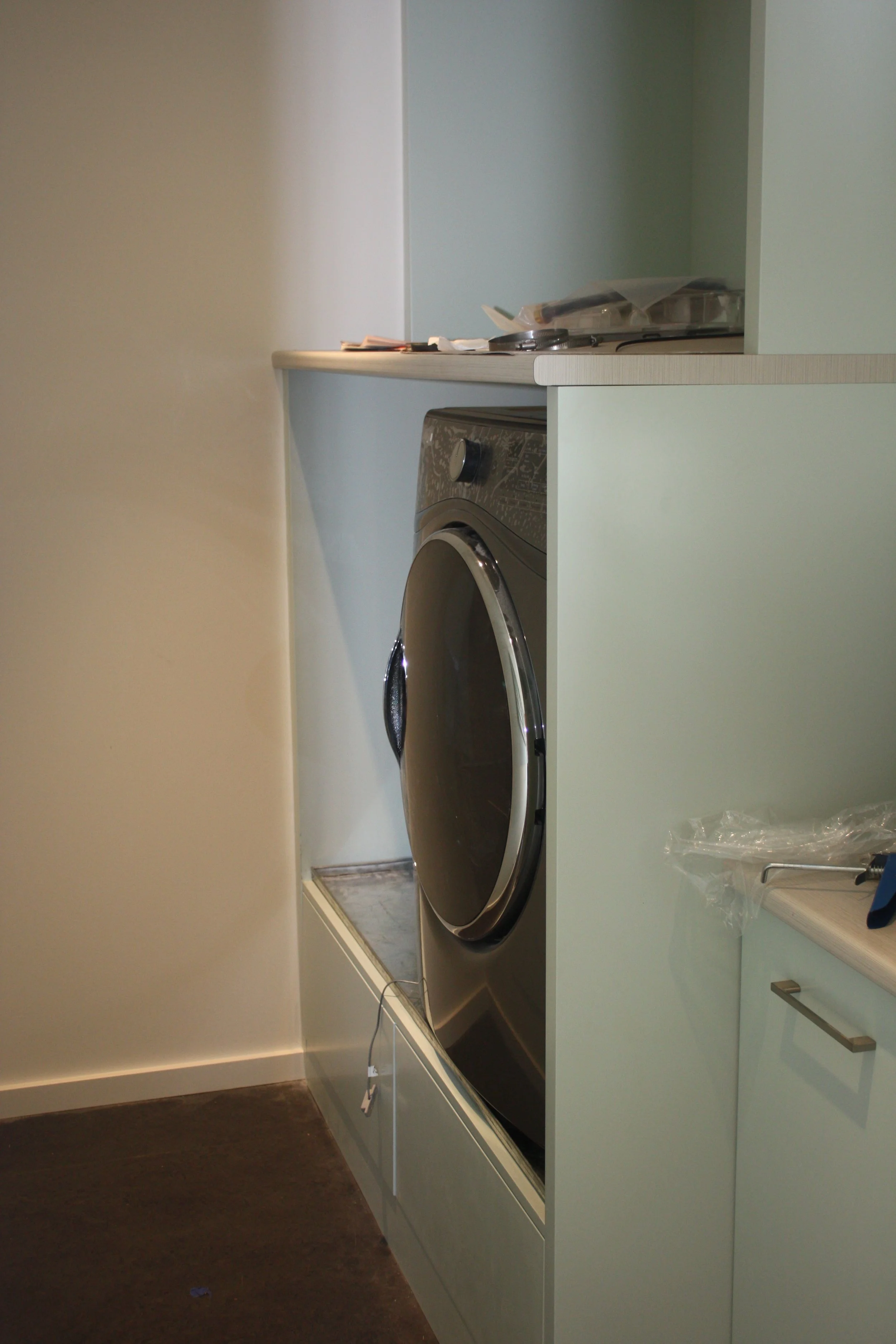 Dryer in - we had to place this appliance first so the plumber could hook up the gas. Now the struggle is to get the washing machine into a just-big-enough space.