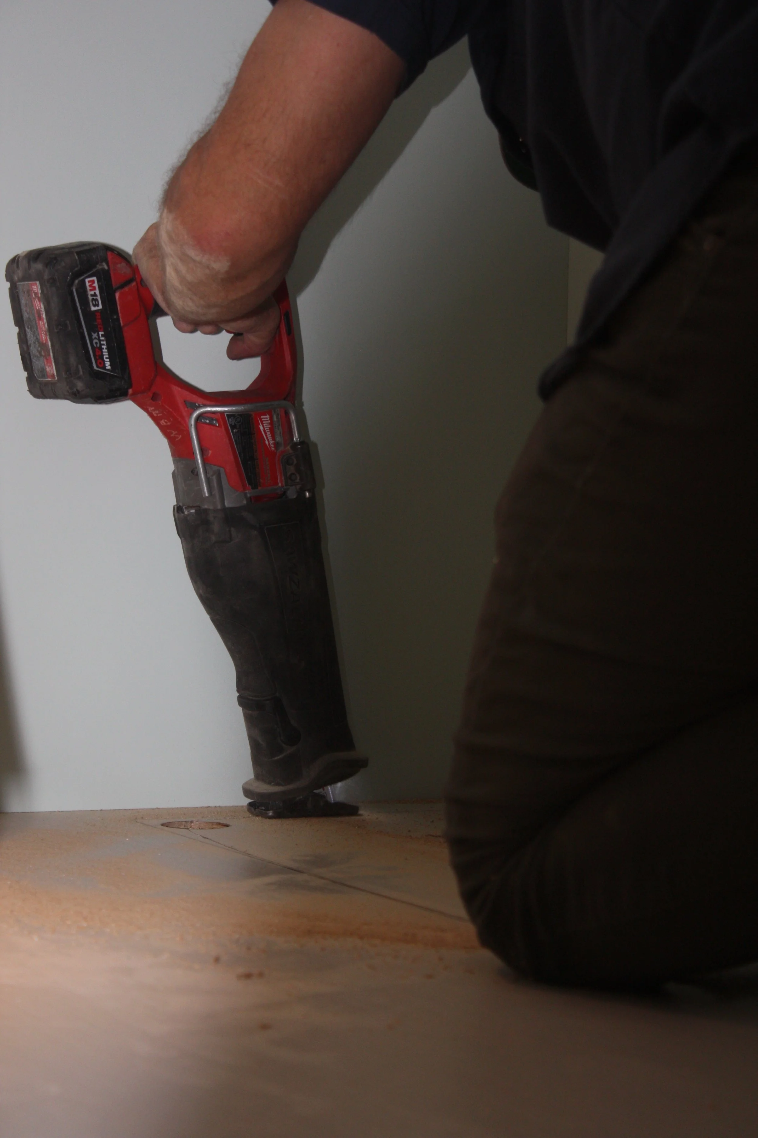 Someone had to get behind the washer to replace the backing and hook the thing up. The problem was that once the task was done, there was no way to get him out again!!