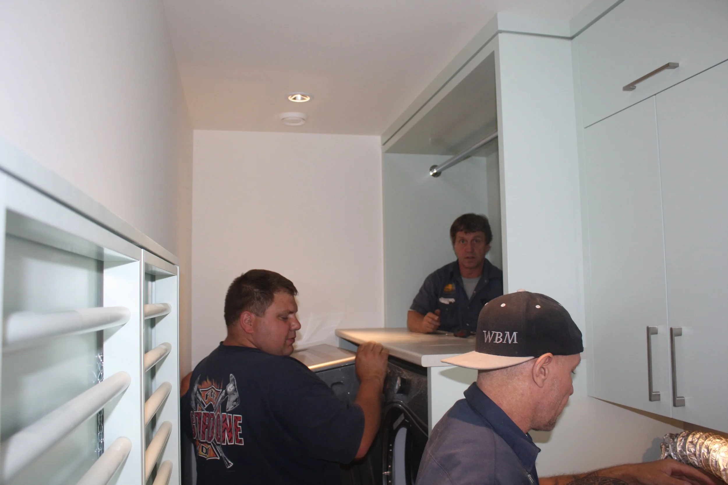 Bringing in the washer. The plumbers had to get a motorcycle lift to move the machine and place it in the space provided. Then the door of both machines had to be removed as well as the backing to the washer.